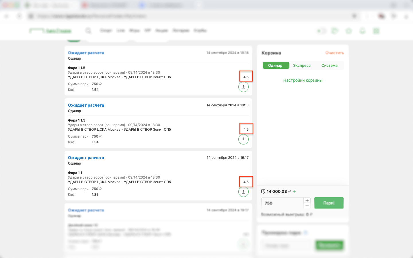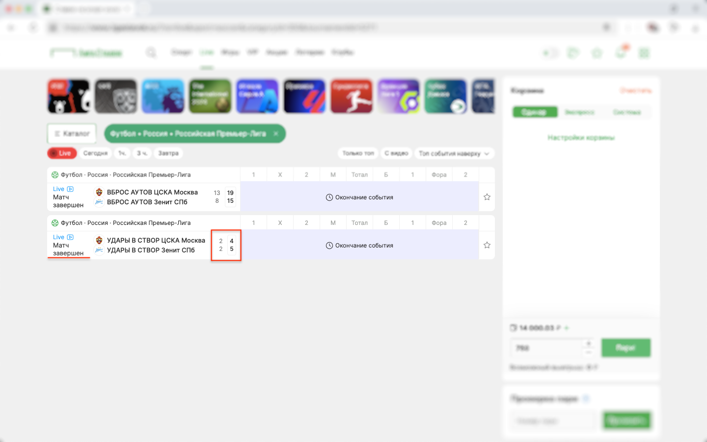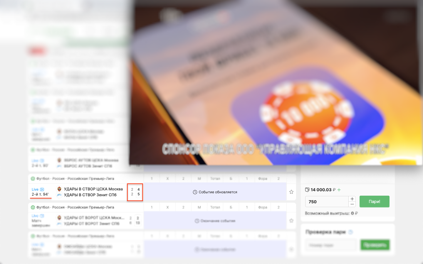 Добрый день. Пари: 645744506178, 186010602809, 706370611370 были поставлены в перерыве матча ЦСКА – Зенит при счете 2-3 по лайв-линии. Во втором тайме были совершены удары в створ в следующее время: ЦСКА – 49:05, 92:57; Зенит – 69:11, 74:59 по трансляции матча. В лайв-линии данные удары были засчитаны, в том числе после матча в разделе «Мои пари» был указан счет 4-5. Но по итогу расчет пари произведен в минус со счетом 3-5. Статистические данные во всех источниках разнятся, но если производить подсчет по трансляции (как велась лайв-линия), то правильные счет 4-5. Указываю время ударов в створ по трансляции матча: ЦСКА – 6:21, 34:18, 49:05, 92:57; Зенит – 6:54, 39:28, 42:24, 69:11, 74:59. Служба поддержки БК вынесла следующее решение: "Ваши пари рассчитаны корректно. Удар на 92:58 не является ударом в створ. Итоговый счет по ударам в створ в матче "ЦСКА Москва - Зенит СПб" 3:5". С данным решением я не согласен, так как счет по трансляции матча был 4-5 (прикрепляю статистический титр, итоговую статистику в трансляции не показали), а так же в лайв-линии все указанные удары были засчитаны (прикрепляю все скриншоты ударов в створ ворот по трансляции матча (запрос БК), а также скриншот с первичными результатами матча). Прошу Вас разобраться в ситуации более детально и добиться расчета пари по результатам трансляции матча.