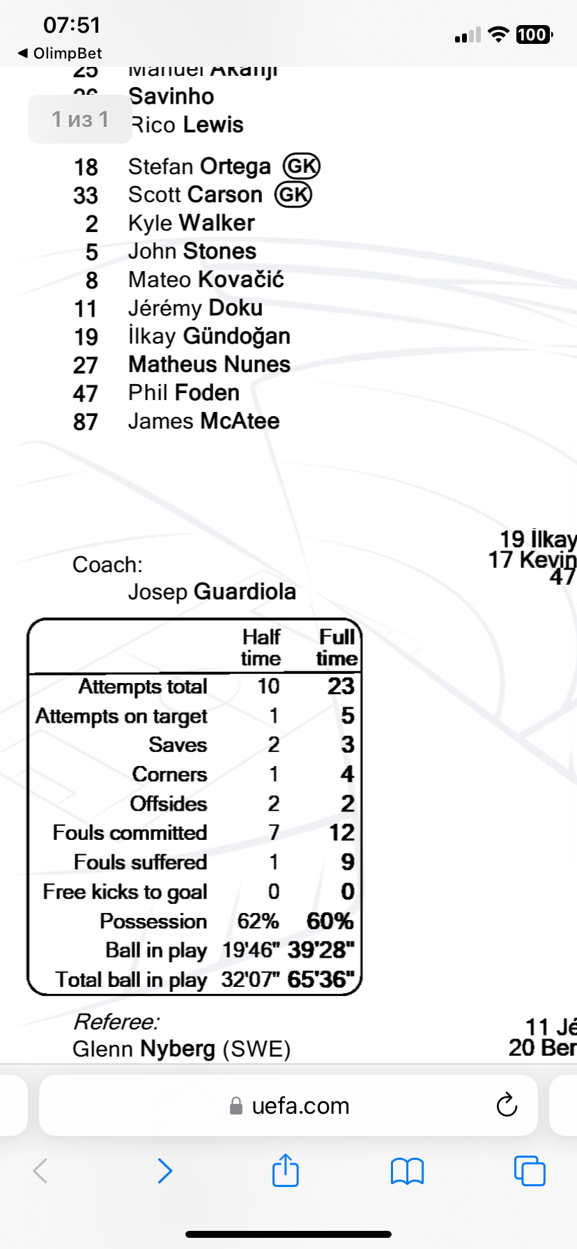 Я хочу подать жалобу на некорректный расчет моей ставки в букмекерской конторе ОлимБет. Я сделал ставку на исход "Тотал (20.5) фолов больше" в матче Манчестер Сити – Интер []. Несмотря на то, что фактическое количество фолов в матче составило 21, букмекерская контора рассчитала ставку на основании данных, указавших 19 фолов.Проблема заключается в следующем:На момент окончания матча, по live-статистике самой букмекерской конторы, было зафиксировано 20 фолов, а последний 21-й фол был за минуту до финального свистка.В официальной статистике УЕФА, а также на сторонних статистических порталах (Flashscore, Sofascore), зафиксировано 21 фол.У меня есть видеозапись матча, и я готов предоставить скриншоты или видеоматериалы, которые подтверждают наличие 21 фола.Букмекерская контора отказалась пересчитать ставку, ссылаясь на первоначальный протокол УЕФА, в котором было указано 19 фолов. Однако это расхождение не объясняется, и я считаю, что был обманут при расчете ставки. В результате, моя ставка, которая должна была быть выигрышной, была рассчитана как проигрыш.Прошу принять меры по данному вопросу, так как подобные ситуации подрывают доверие клиентов к компании.Заранее благодарю за внимание к моей жалобе.