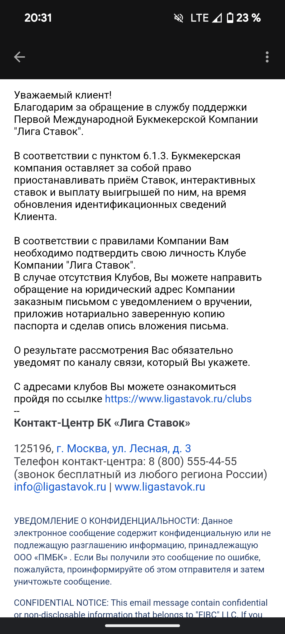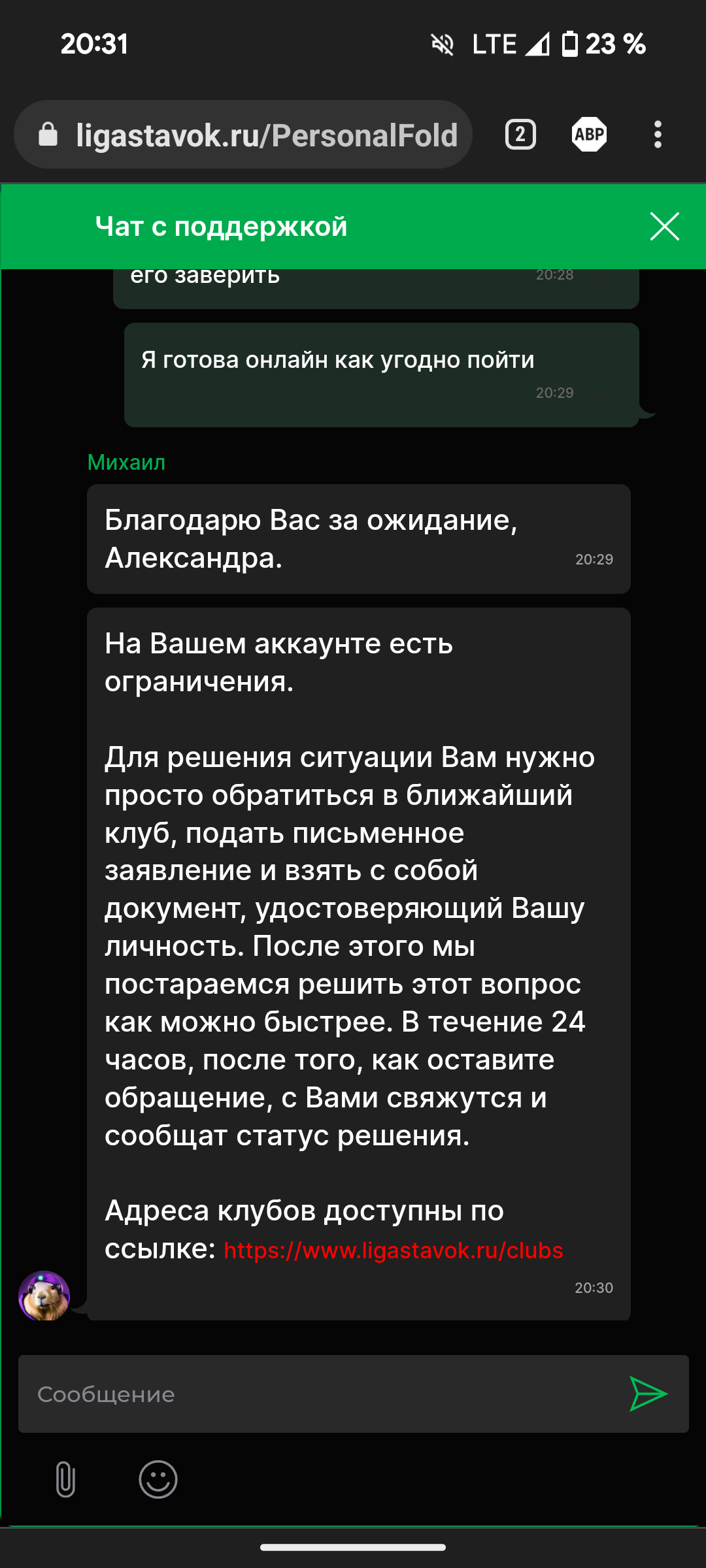 Здравствуйте, во вчерашнего дня, не могу вывести выигрыш. Запрашивали идентификацию , , покрутила лицом, и загрузила паспорт, по итогу мне отказали в прохождении идентификации онлайн. Постоянно пишут что надо отправить нотариально заверенную копию документов. У меня нет финансовой возможности заверить документы, а ближайший клуб находится в нижнем Новгороде, это очень далеко и тяжело, ведь я беременная еще с маленьким полуторагодовалым ребёнком. Прошу разрешить мою ситуацию. личные средства внесены 1500₽ а выигрыш составляет 104000.
