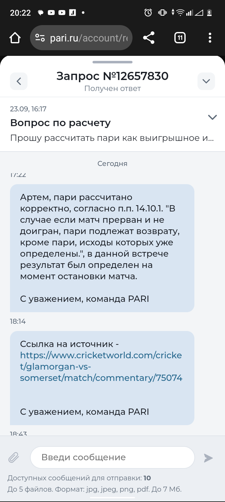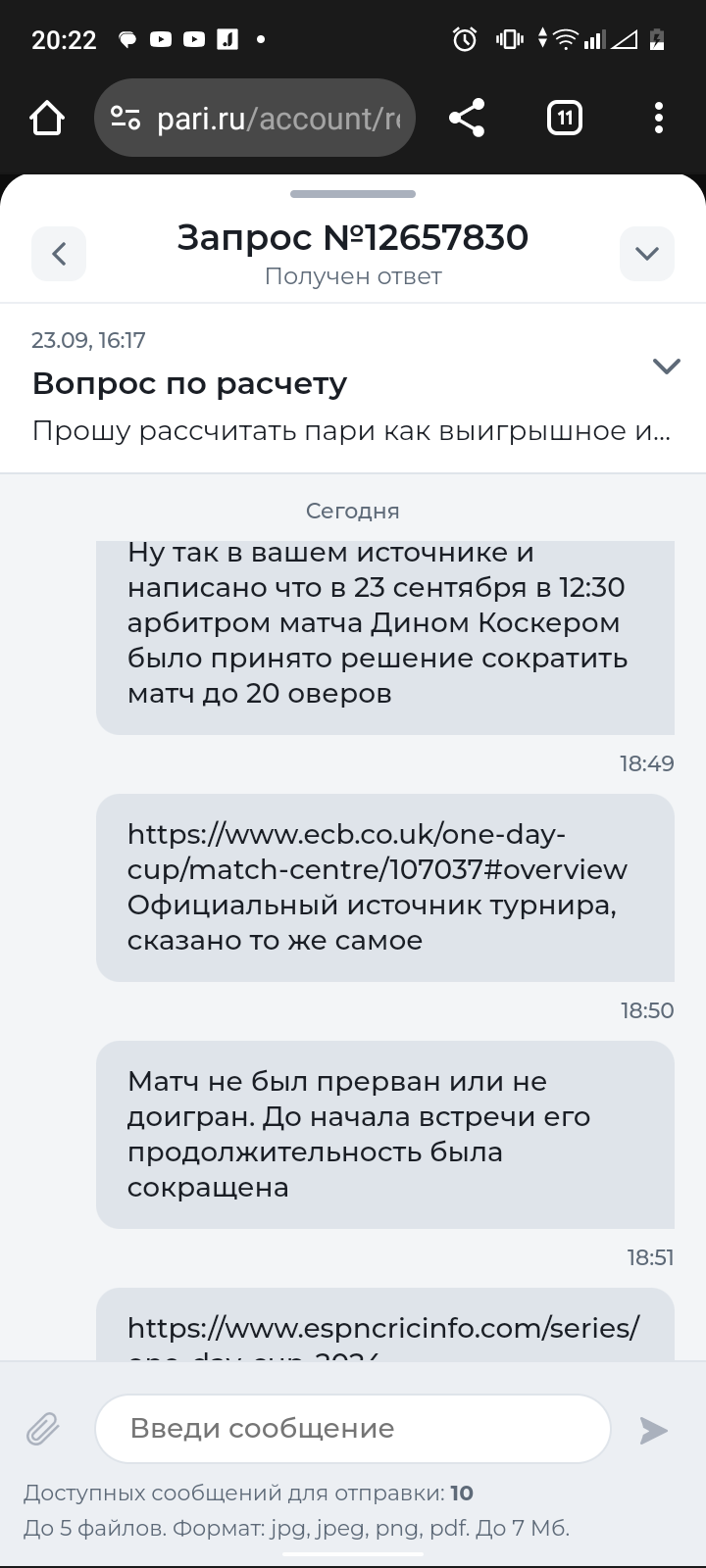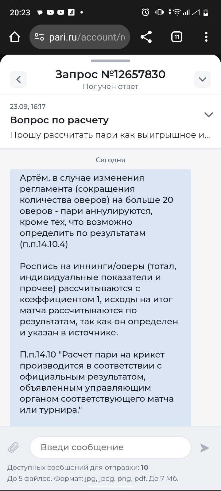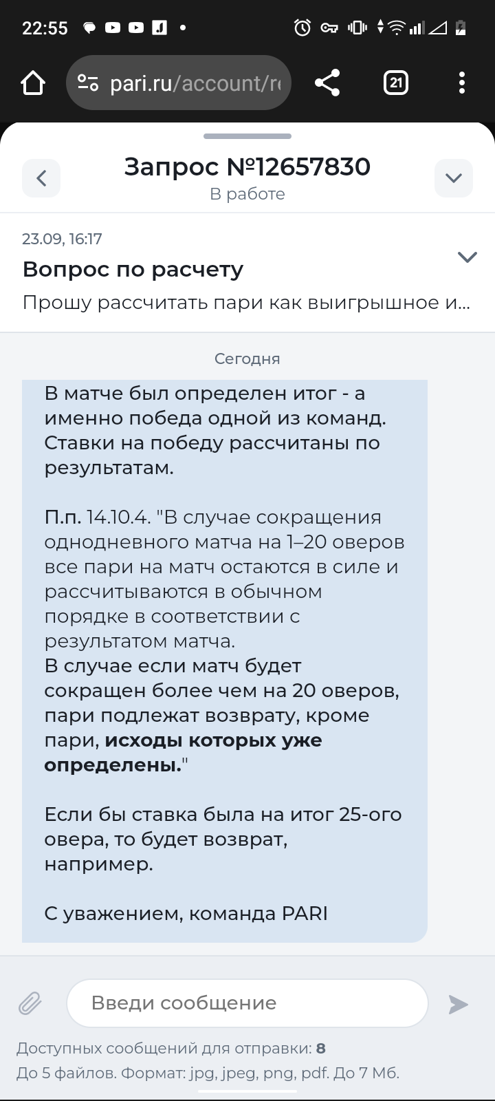 Из этого ответа, я делаю вывод, что БК "Пари" соглашается с тем, что матч был сокращён на 30 оверов.