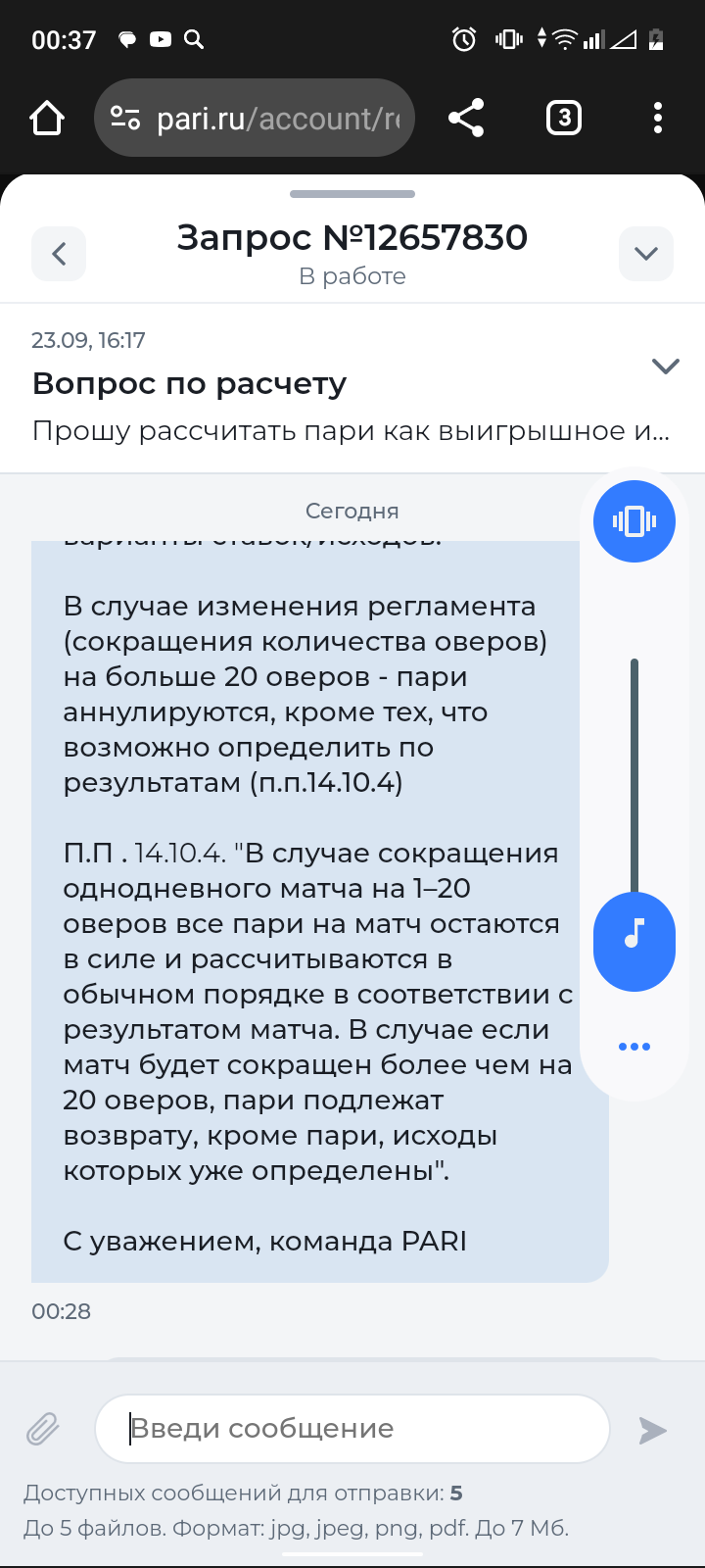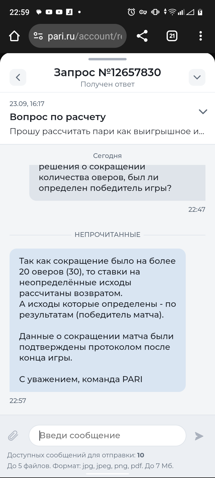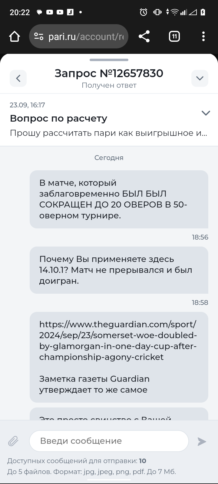 Из этого ответа, я делаю вывод, что БК "Пари" соглашается с тем, что матч был сокращён на 30 оверов.