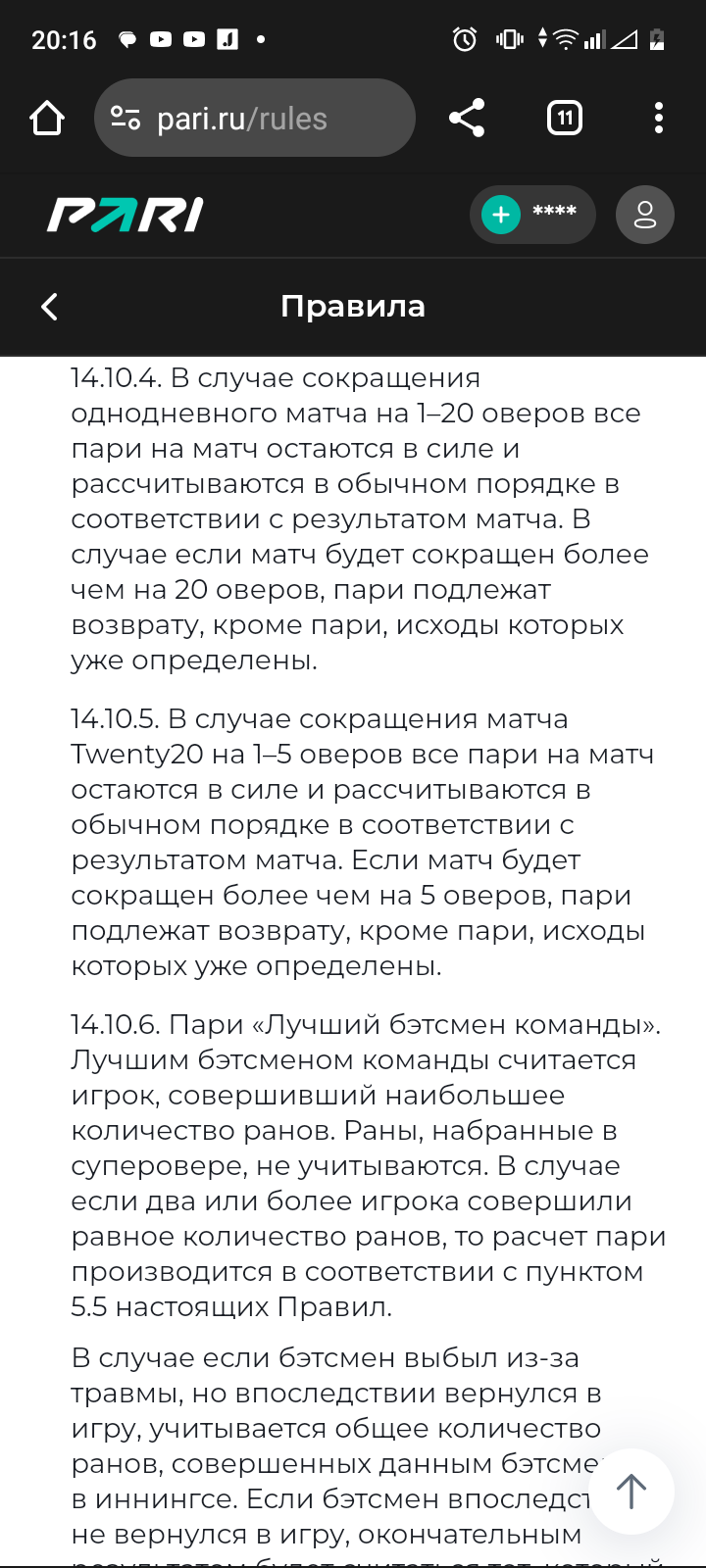 Придумывают на ходу правила рассчёта ставок. Суть такова. 50-оверный матч по крикету сокращают до 20 оверов, то есть на 30 оверов. Согласно правилам .4, ВСЕ ставки подлежат возврату. Оказывается не все, а только выигранные)