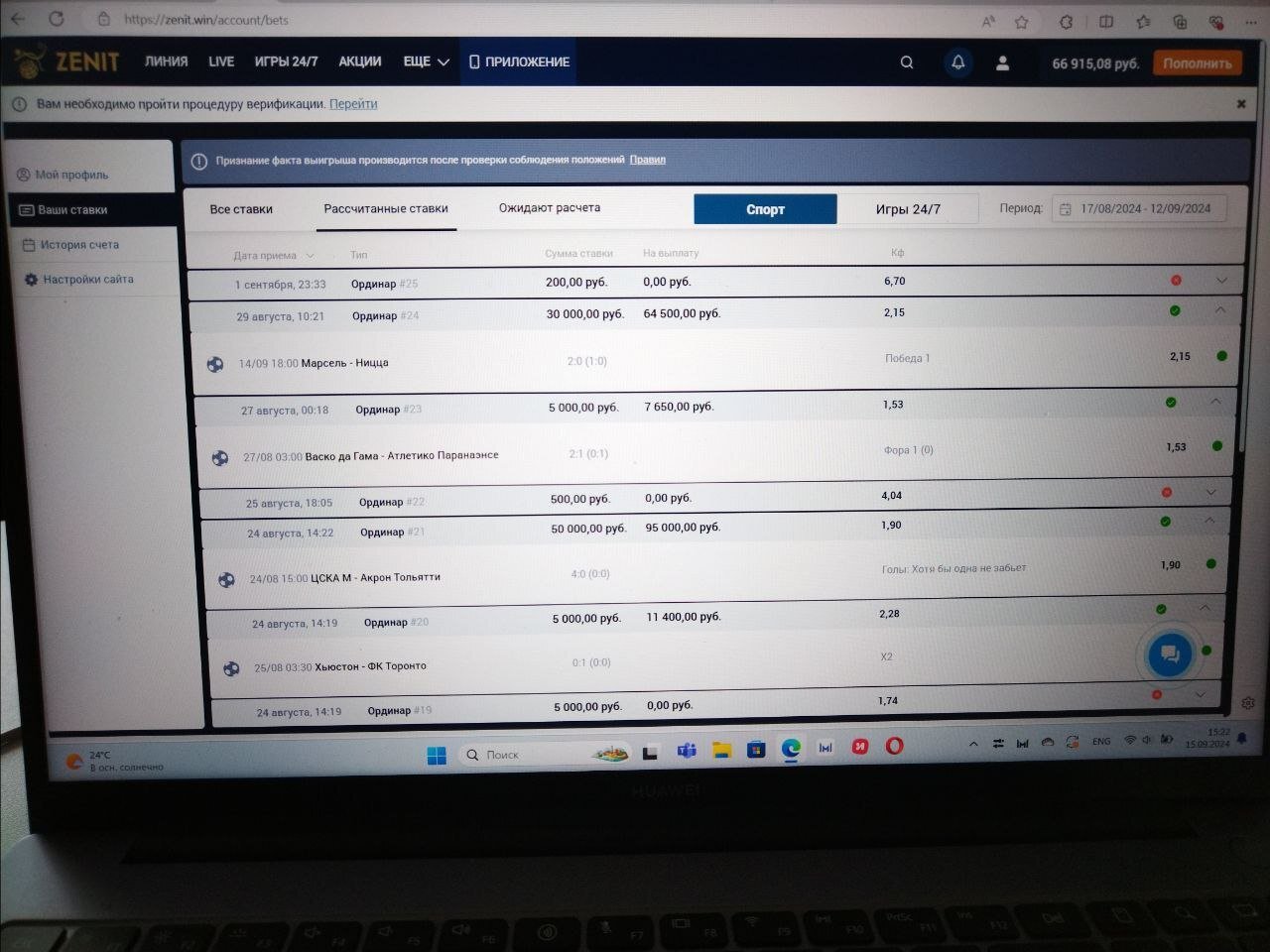 Здравствуйте.В Бк Зенит я зарегистрировался примерно 2 года назад,ставил на низшие лиги,но лимит ставок существенно понизили до 500-1000 рублей и я перестал ставить,не так давно я перешел уже на большие чемпионаты и тут вспомнил про свой порезанный аккаует в зените.Лимиты были от 5000 до 50000 в зависимости от чемпионата,мне это подходило и я продолжил ставить на зените спустя 2 года,ставил на такие лиги как Сша МЛС ,Бразилия Серия A, Голландия Эрдивизия, Россия РПЛ.Поначалу проблем с выплатами не было,все запросы на вывод обрабатывались мгновенно-но после того как я вышел в плюс примерно 30 000,отменили запрос и затребовали фото паспорта для верификации.Уже на следующий день фотографии были проверены и сотрудник поддержки подтвердил что можно выводить средства.Я запросил вывод -но спустя после того как сумма 14000 была списана с баланса- потом через несколько минут вернулась на баланс.Я обратился в чат и оператор мне сообщил мой аккаунт заблокирован на 60 дней ,сославшись на пункты из правил якобы я что то мог нарушить.Никаких двойных счетов у меня нет,никакими сканерами и прочим бредом не пользовался,это легко можно проверить по архиву коэффициентов-везде они примерно одинаковые без арбитражных ситуаций,да и к тому же это основная линия на большие рынки.Готов к видеоверификации если понадобится .Повлияйте пожалуйста на ситуацию,это абсурдно блокировать аккаунт на 60 дней при таких ставках с балансом 69 915 рублей.скриншот загрузить не получается-пишет некорректный файл,могу почтой отправить