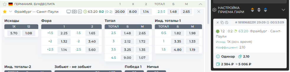 В лайве матча Фрайбург - Санкт Паули при текущем счете 0-2 умудрился сделать ставку по явно ошибочной линии, адекватной счету 1-2.. БК отказалась делать возврат ссылаясь на какой-то пункт своих чудо правил..