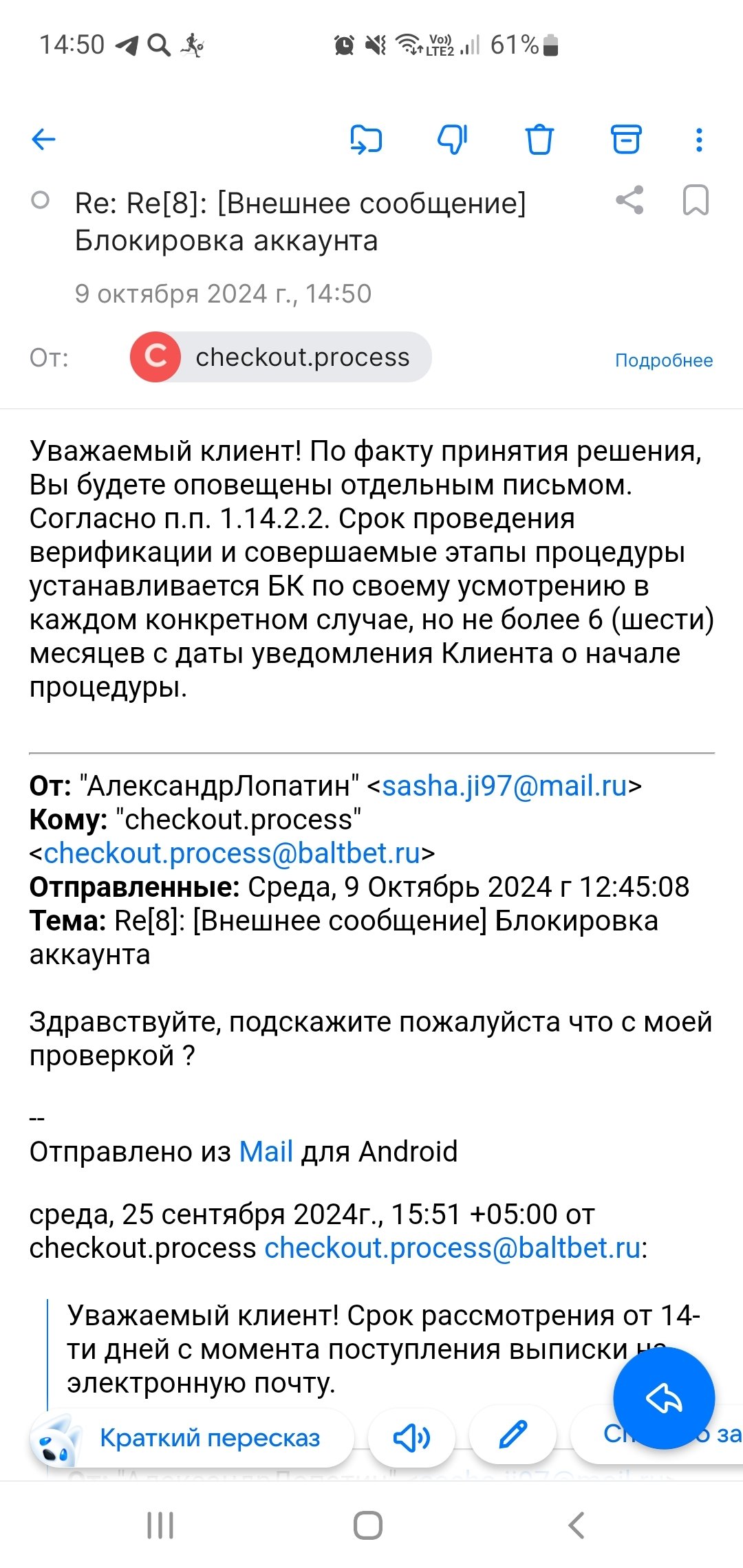 Здравствуйте, 24 сентября зарегистрировался из цуписа в БК Балтбет, решил посмотреть как играется в этой БК (есть вип статус в фонбете) пополнил на 10 тысяч рублей, сделал ставку экспресс на финалы ATP Китайские, статистику (2 ошибки), чудом 2 матча зашли и ставка сыграла, выигрыш получился 29111 рублей, поставил на вывод 10000 рублей, моментально выплатили, далее подумал ещё вывести, появилось окно о блокировке. 25 сентября прошёл видеоверификацию, ответил на все вопросы, отправил выписку из ЦУПИСа, в ответ получил письмо срок рассмотрения от 14 дней. Прошло уже 2 недели, никого ответа так и нет. Прошу помочь в разблокировке аккаунта, никаких правил не нарушал, просто хотел затестить новую для себя БК, оказалось ошибкой. Прикрепляю скрины из бк