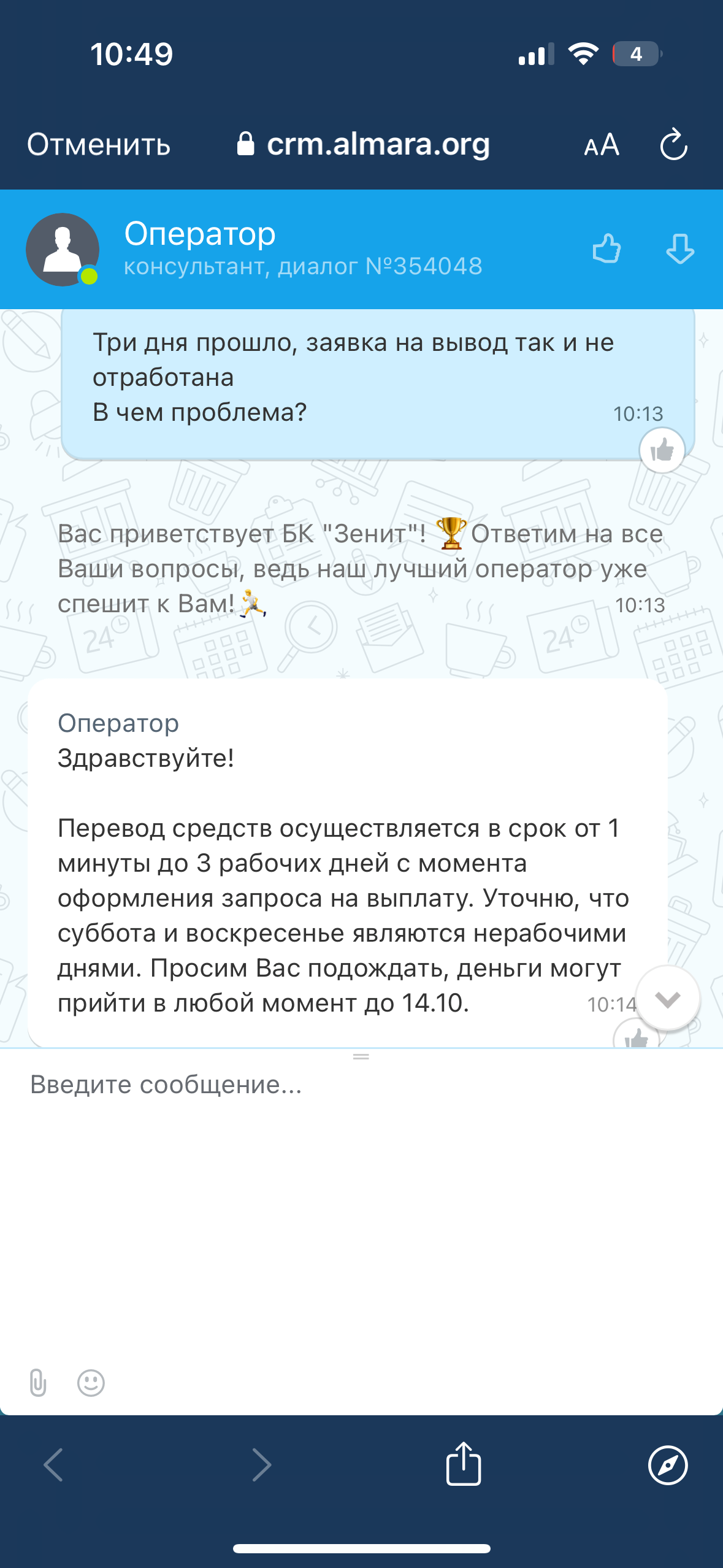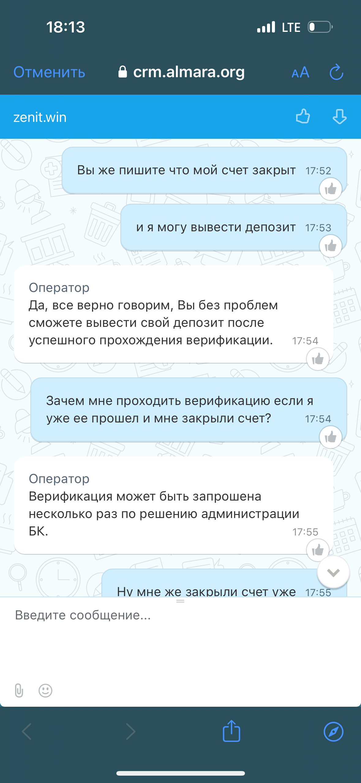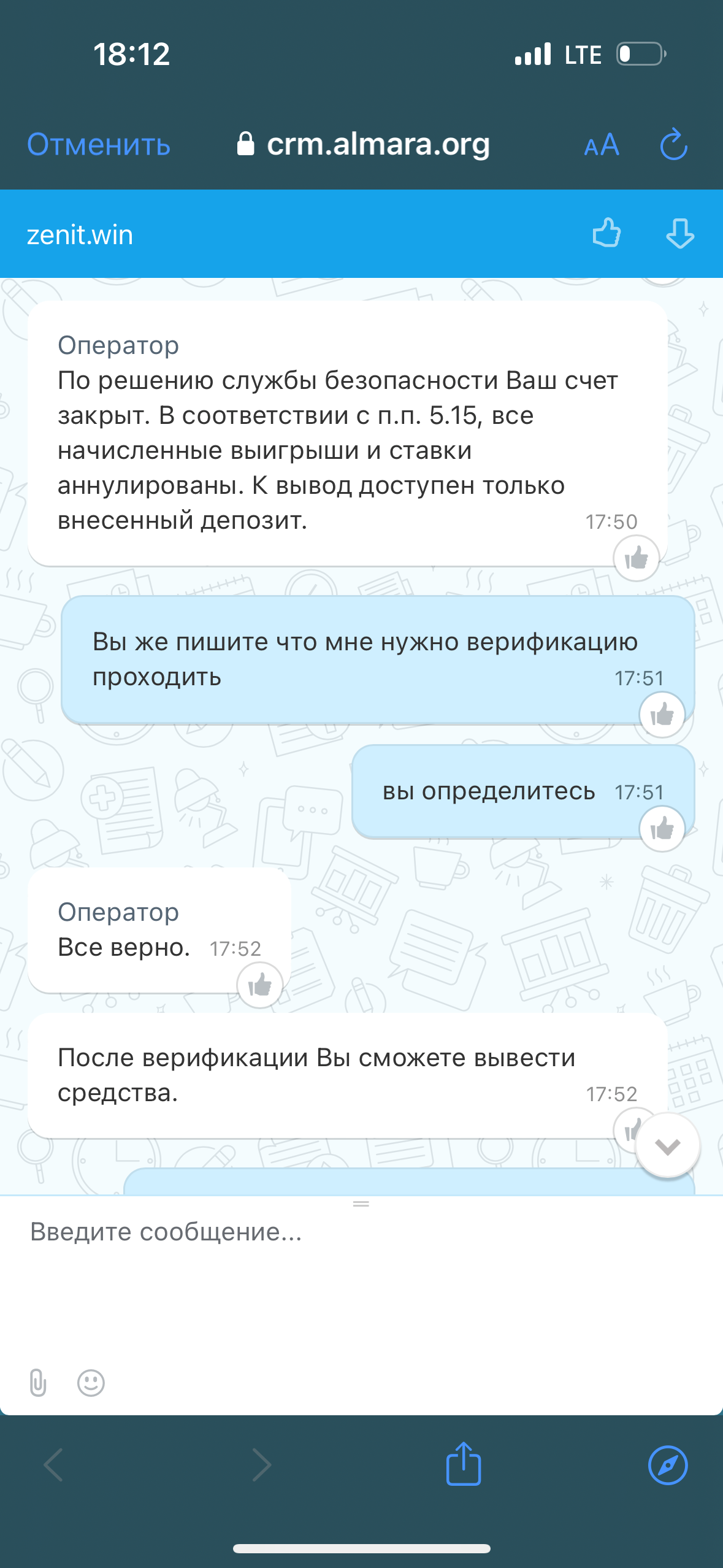Играл на этом аккаунте в течение нескольких лет. В основном были проигрыши. В общем за все время проиграно несколько миллионов. Выводы, хоть они и были редкими проходили моментально. И вот в октябре этого года выиграл 1231000 руб. И неожиданно началась верификация. Попросили фото паспорта, обрабатывали 3 дня, приняли, открыли вывод. Вывод провисел 3 дня и отменили(что за дебилизм, зачем ждать максимальные сроки если вас что-то не устраивает ?). Затем попросили фото карты, тоже приняли, сказали верификация пройдена, вывод висел опять 3 дня. Техподдержка каждый день уверяла меня что никах проблем не возникнет, ожидайте 3 дня, вывод производится в автоматическом режиме, проблем с аккаунтом у меня нет, переживать не стоит. Оказалось никакого автоматического режима вывода нет, просто букмекерская контора насильно удерживает средства. В итоге г мне опять отменили вывод и заблокировали аккаунт на 60 дней. Судя по частым жалобам, зенит начал поголовно блокировать все аккаунты за малейшие выводы. Что за беспредел творится с букмекерами в России?На аккаунте проиграны миллионы и не дают вывести даже миллион?Прошу легалбет решить мою проблему, иначе буду обращаться в суд. Уже есть прецедент с Лигой Ставкой, также морочили мозг, иск в суд сразу все решил