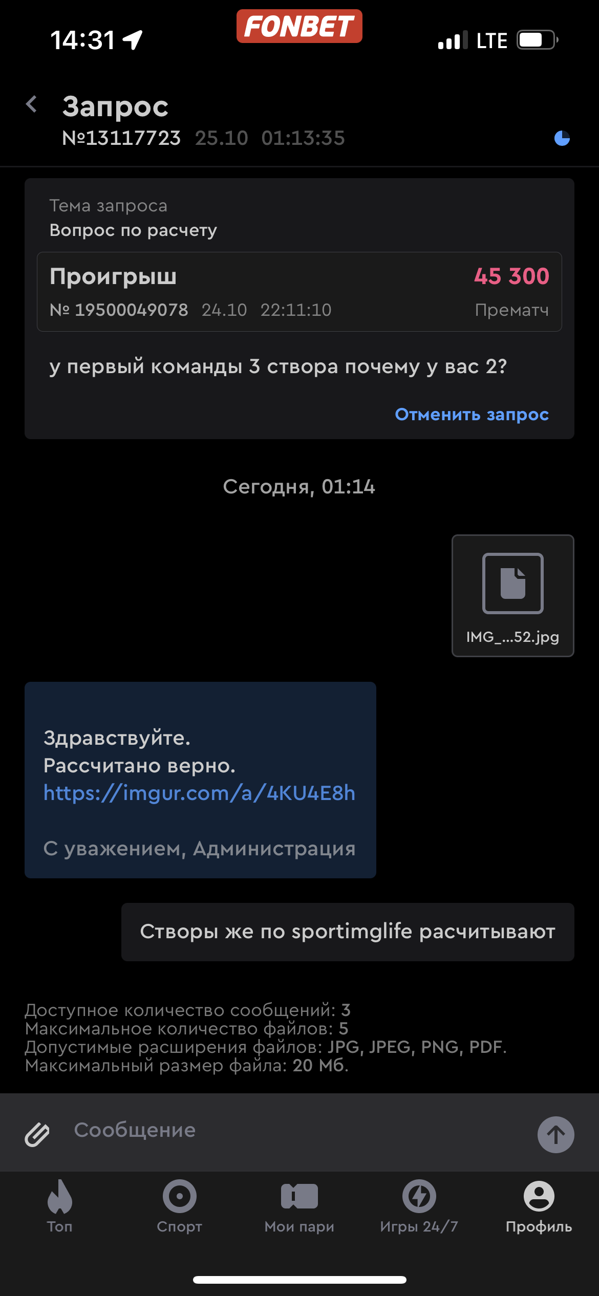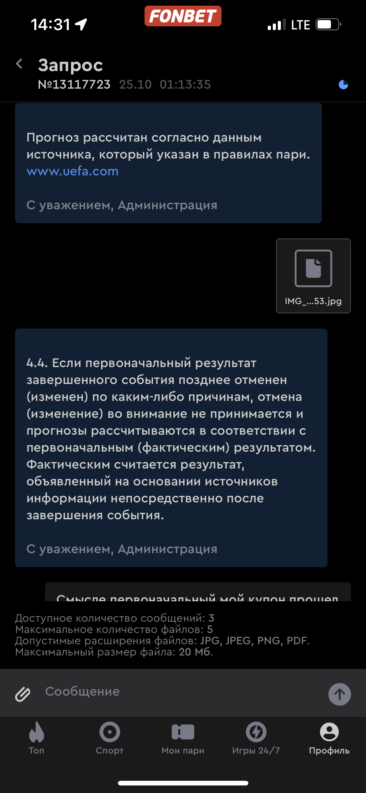 Здравствуйте! Сделал ставку Бк фонбет , удар в створ 9.5> фонбет насчитал 2-7 проигрышь ! Я начал искать сколько был створ нашел что Атлетик забил 3 створ и им об этом написал , они мне ответили что уефа.ком 2-7 объявил расчет верный ! Утром проснулся уефа тоже поменял на 3-7 створ в таком случай ставка прошло ! Я им пишу что ставка прошла уефа изменил они мне отказывают ! Что у них правила 4.4 не могут изменить первоначальный рассчет