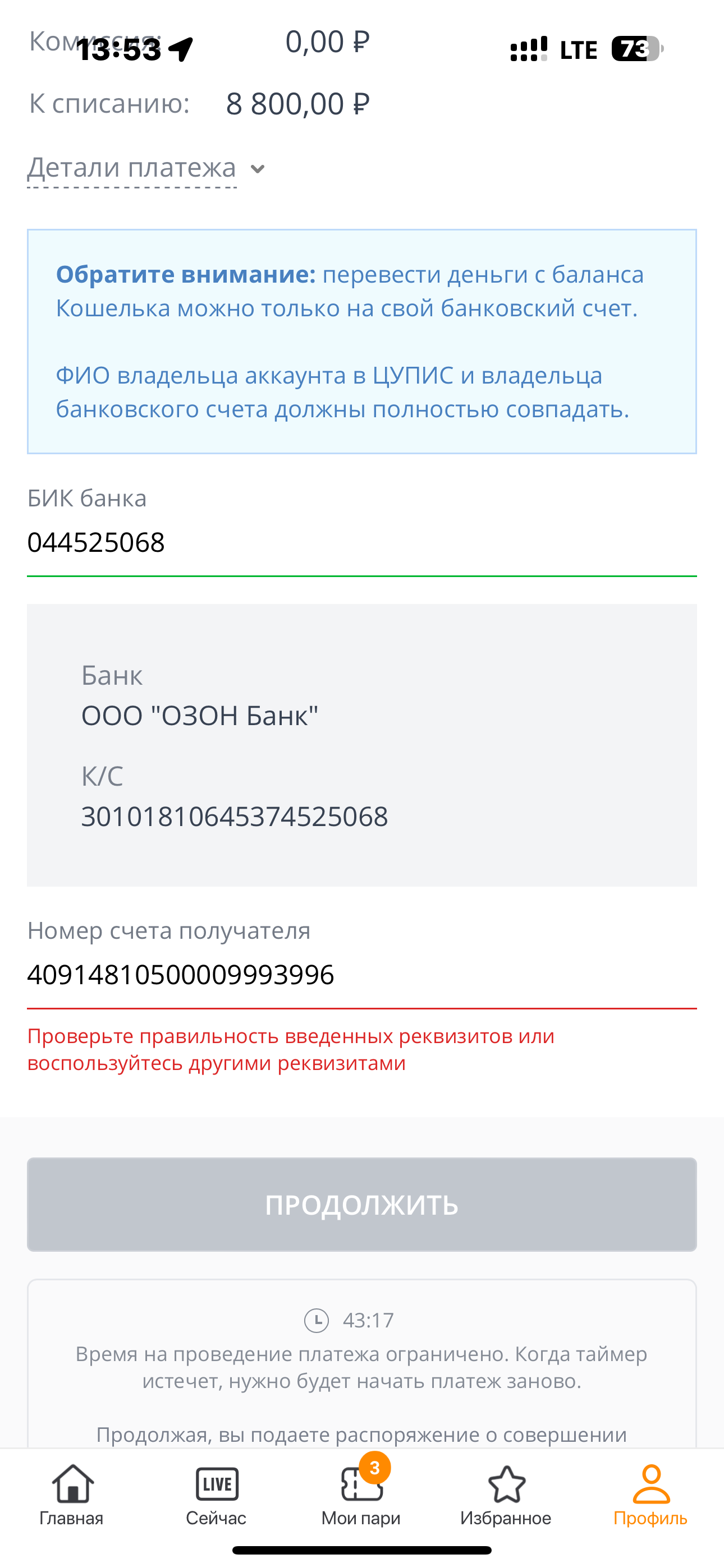 Winline - по подозрению во вмешательстве в мой аккаунт третьих лиц (в моих интересах, как они сказали) запросили верификацию повторную, я ее прошел, но теперь вывод средств возможен только на банковские реквизиты. Я предоставил реквизиты но мне отказали в выводе! Я пользуюсь единственным банком, Winline этот банк не устраивает! (Озон банк)! Прошу помочь разобраться!