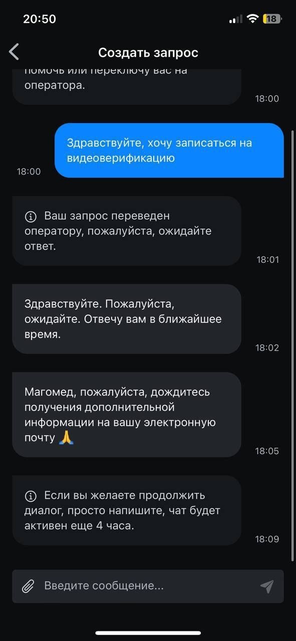Здравствуйте. Нам сообщают, что вы не прошли видеоверификацию. Вы получали приглашение?