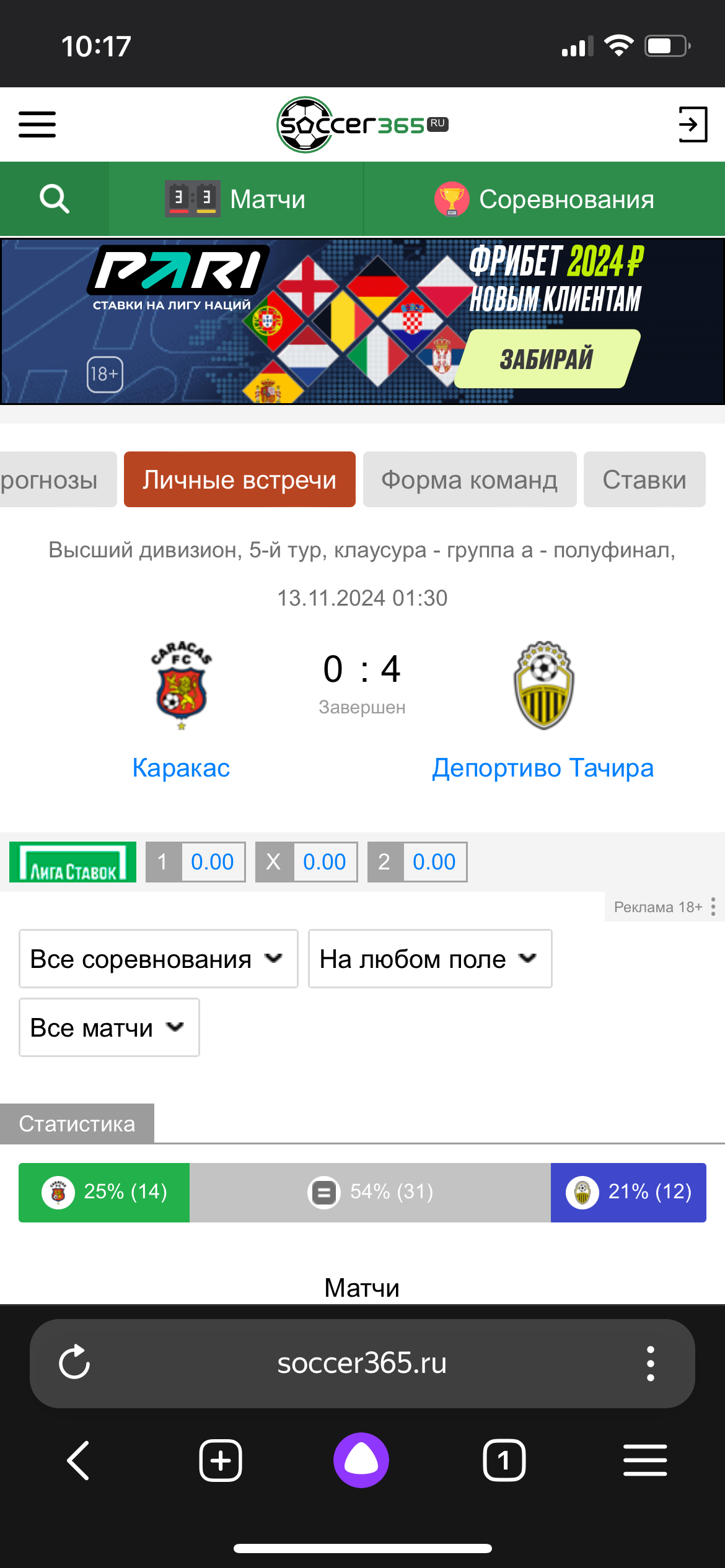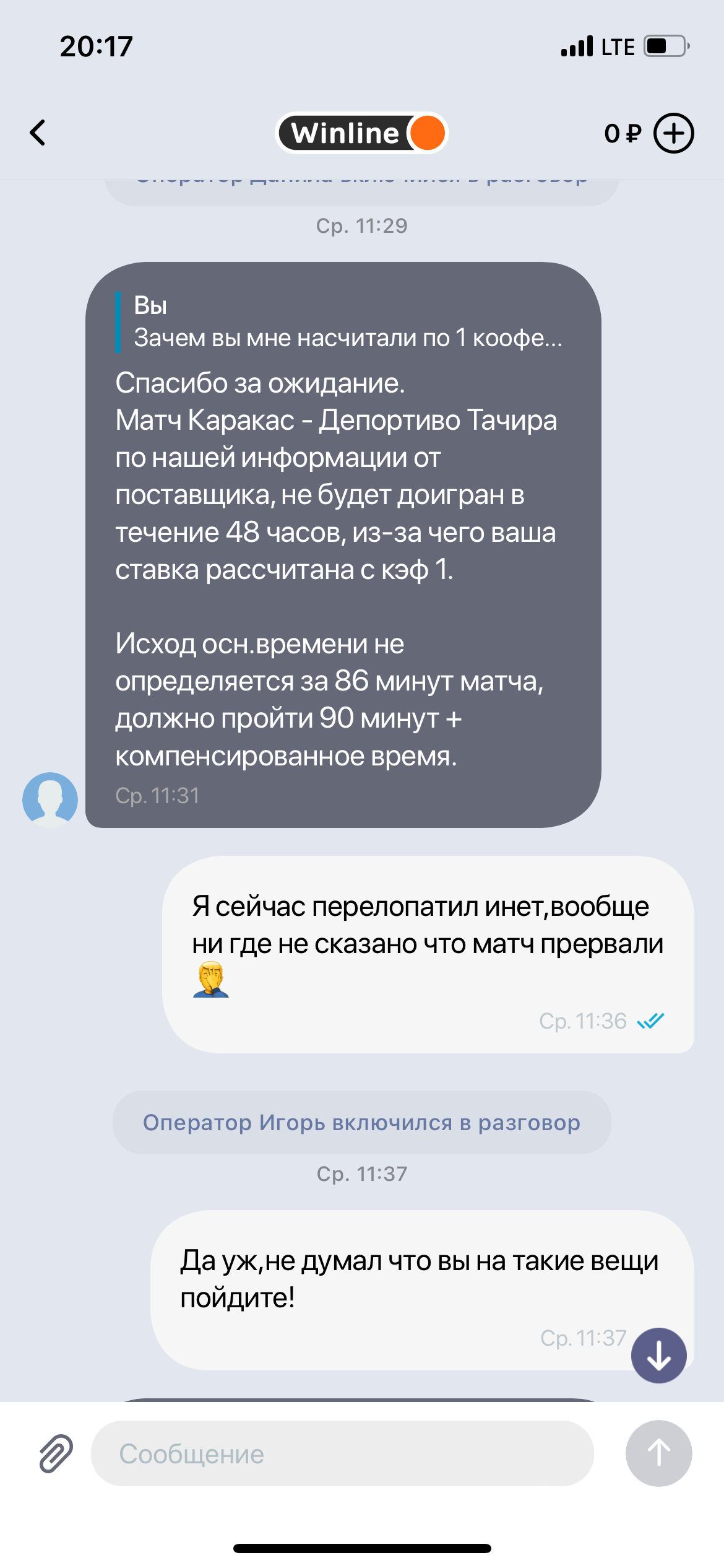 Здравствуйте. Матч был прерван на 81-й минуте из-за того, что на поле выбежали болельщики. Команды увели в подтрибунку и после этого матч не был доигран. К сожалению, по правилам этой БК в таких случаях ставки рассчитываются возвратом. На ютубе много видео с этим матчем, можете посмотреть. Вот, например: