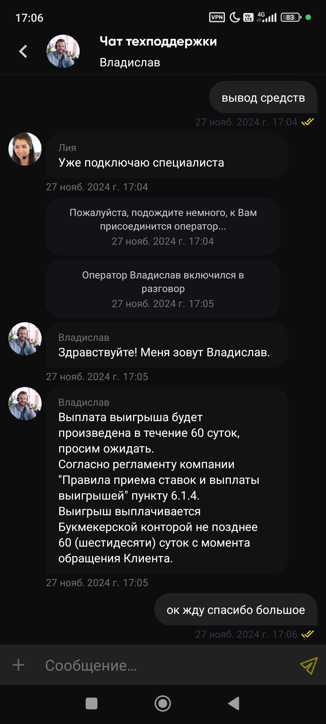 9 октября 2024 года я выиграл 300000 и хотел вывести и смотрю блокировали аккаунт и хотят документы для Подтверждения личности я им отправил проверили долго но все так и проверили было нелегко эти документы сделать особенно с оператором связи потом назначали видеоверификацию это тоже прошел и до сих пишется твои данные на проверке помогите пожалуйста получить выигрыш а то из за этого я в долги лез все затягивают затягивают 100 раз пожалел что в этой конторе играл