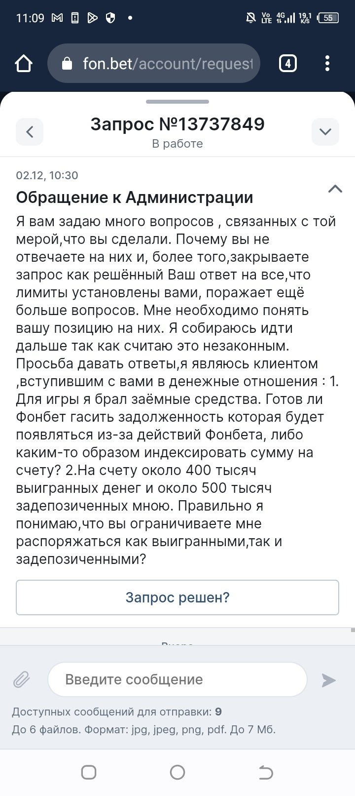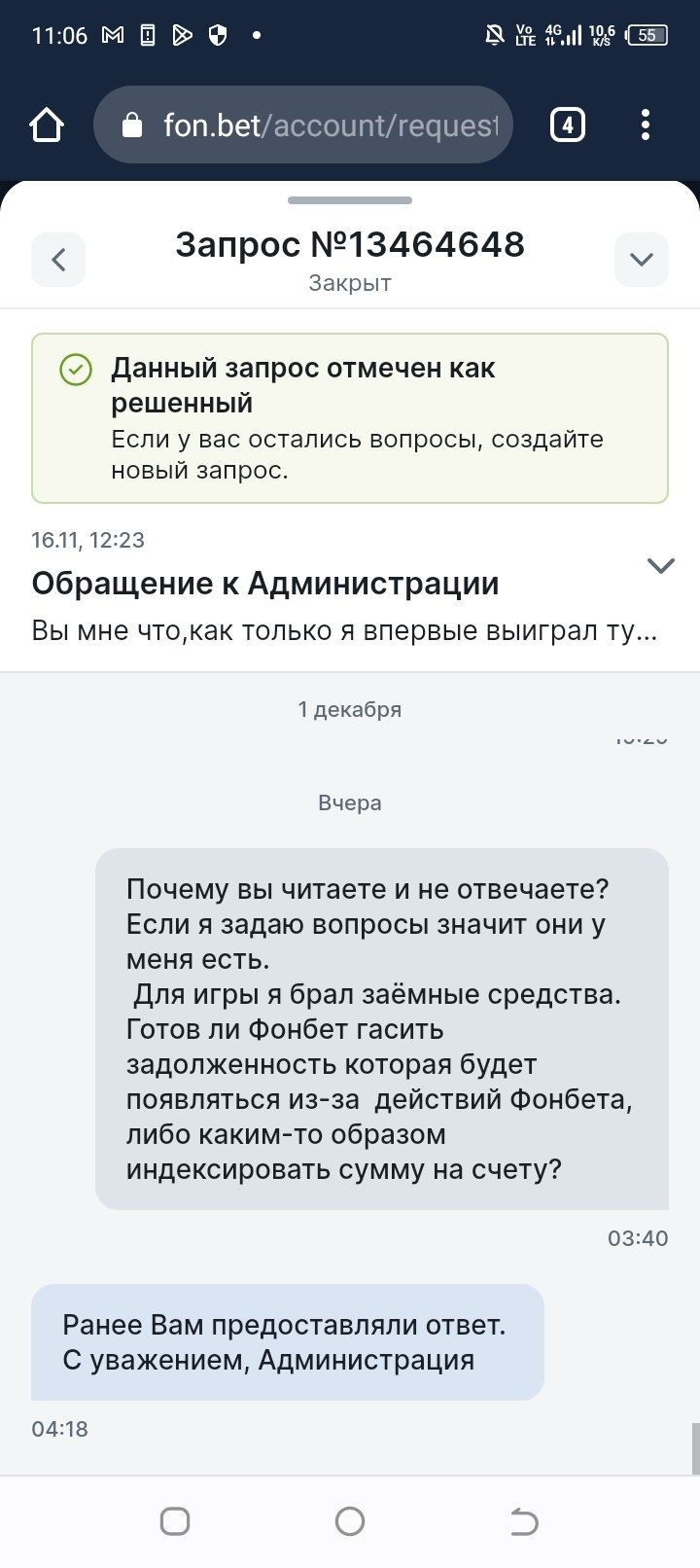 Играл в Фонбете регулярно. Пока проигрывал вопросов не возникало. За всё время внёс около 500 тысяч рублей. Когда смог наконец выиграть и на счету стало 918 тысяч заблокировали. Прошел проверку, фотографии, видеозвонок и был разблокирован. Но проблема стала ещё хуже блокировки. Фонбет разрешил выводить 1500 рублей за 1 вывод. Вывод 1 раз в сутки. Получается мне надо выводить ежедневно без малого 2 года. Для игры я использовал заёмные средства. Спрашиваю почему даже задепозиченные мною 500 тысяч удерживаются,это же просто незаконно. В переписке Фонбет либо не отвечает,либо одно и тоже пишет. Сейчас сутки нет ответа. Счёт 53976947