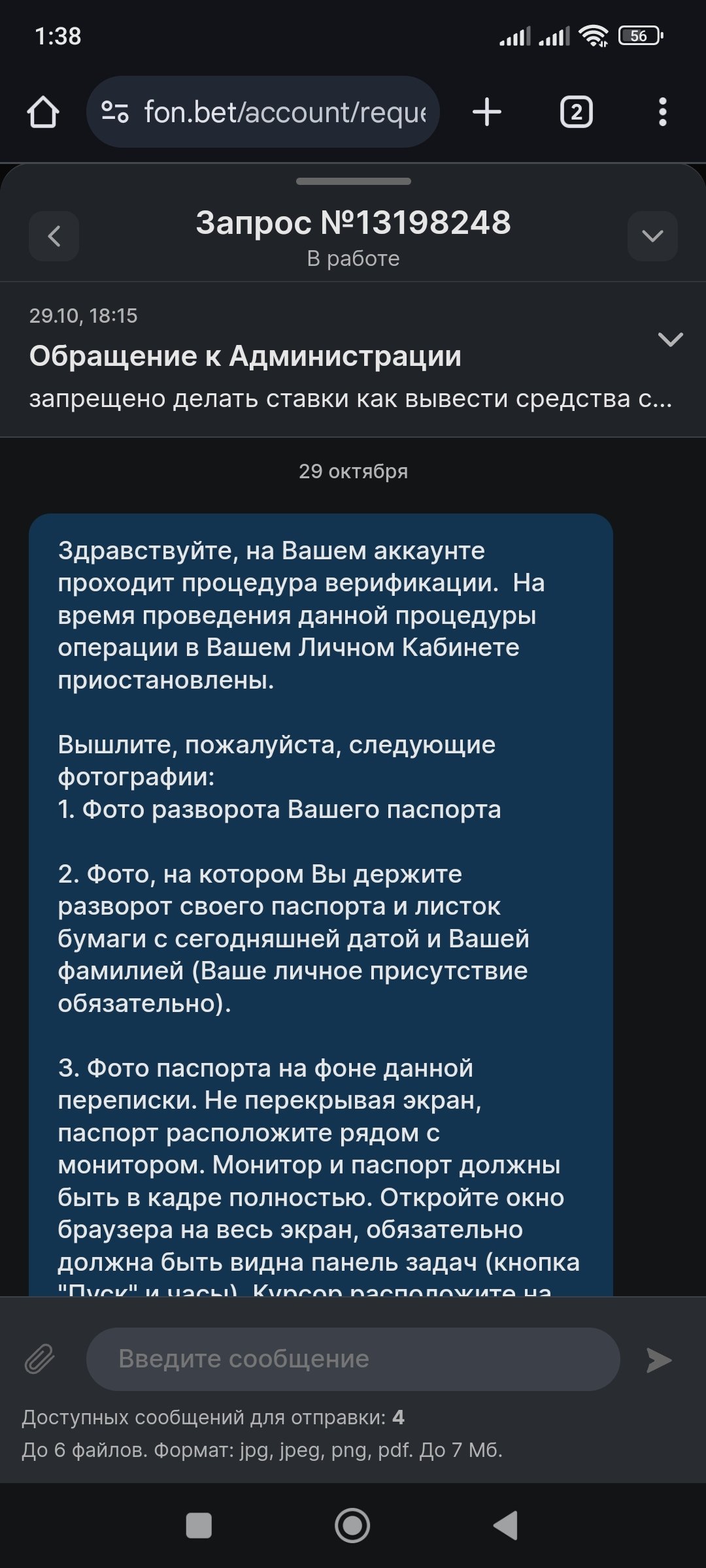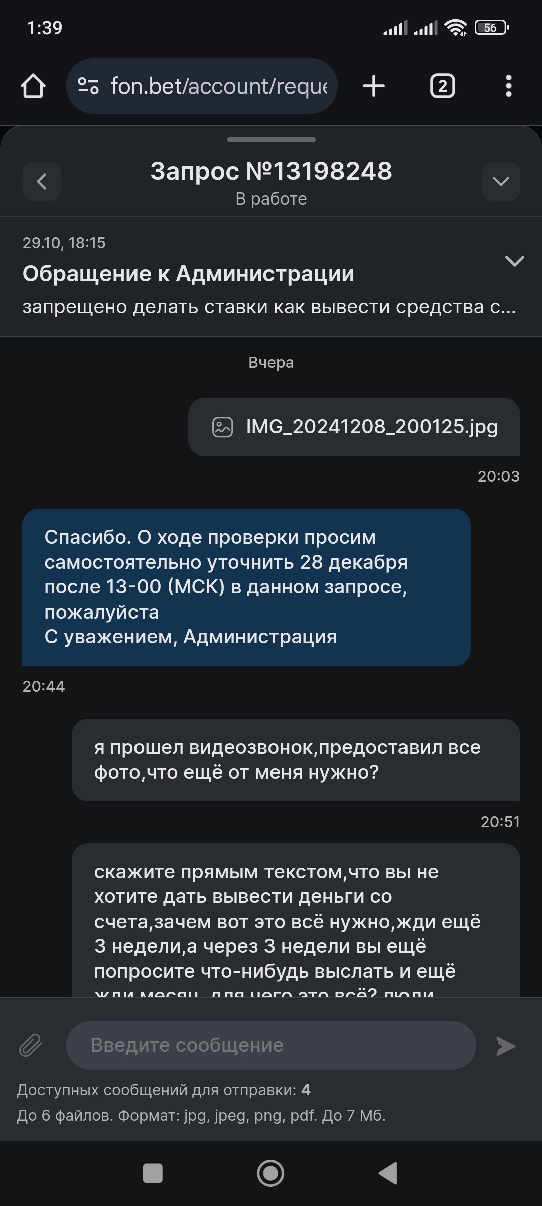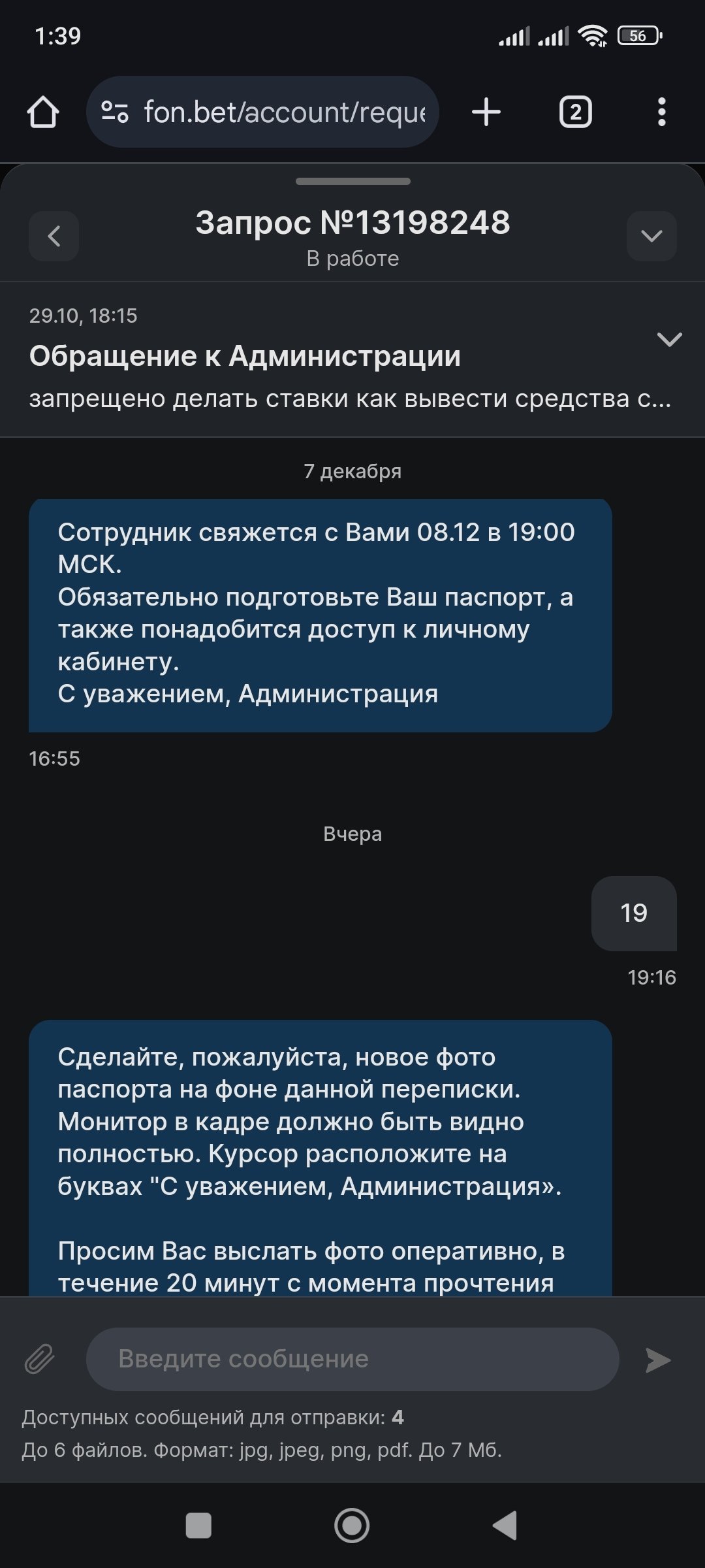 После прохождения видеоконференции с сотрудником бк Фонбет, в чате написали скинуть фото с монитором и паспортом. Я успешно скинул, после чего они написали ждите 28.12. Я прекрасно понимаю, что это ничем хорошим не закончится, будут и дальше мурыжить.