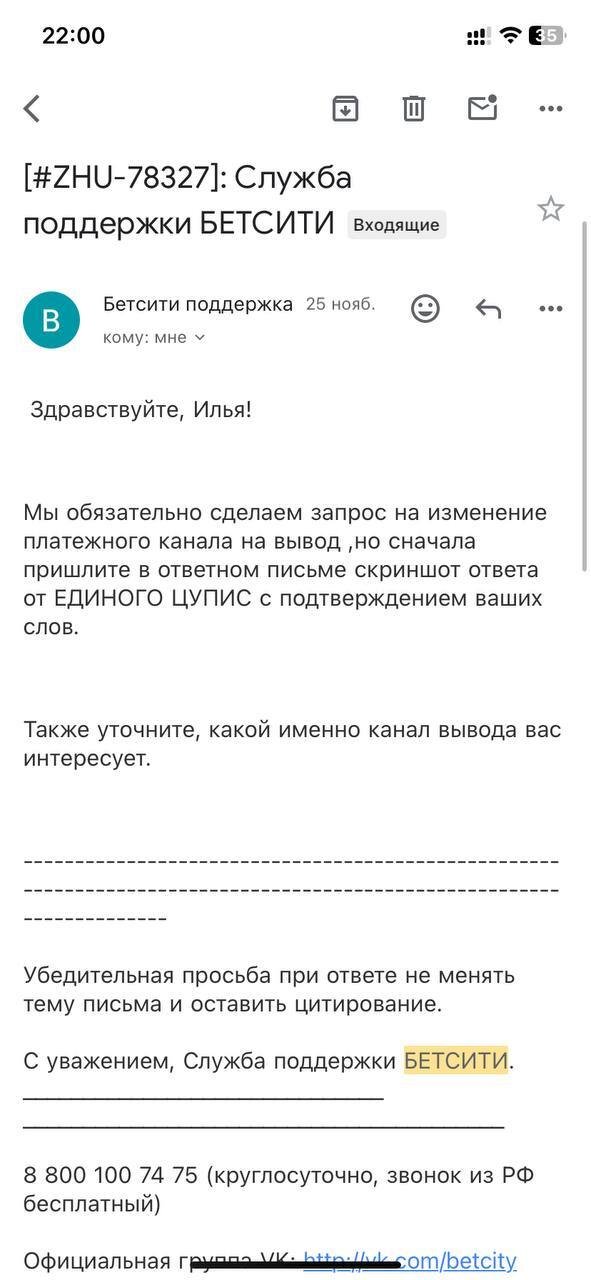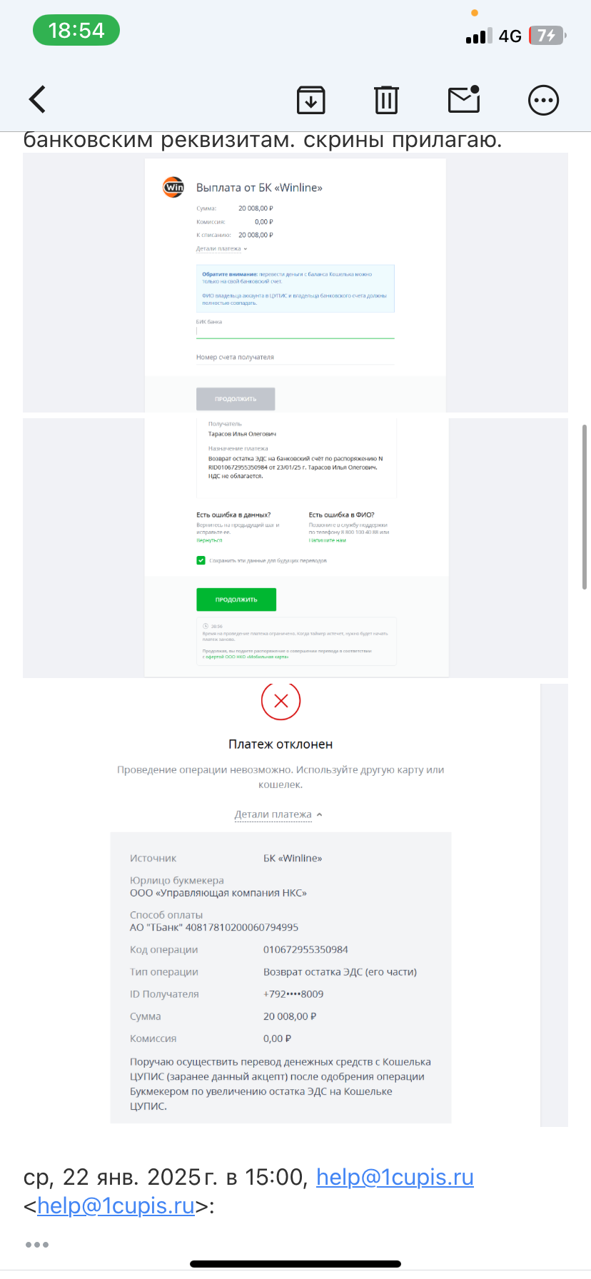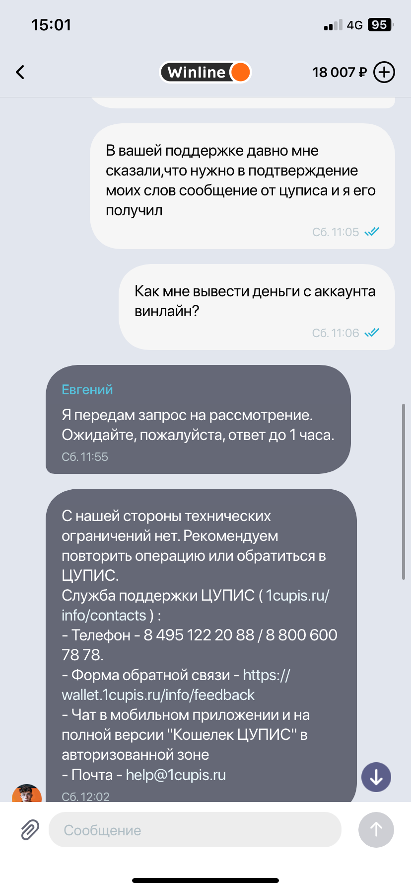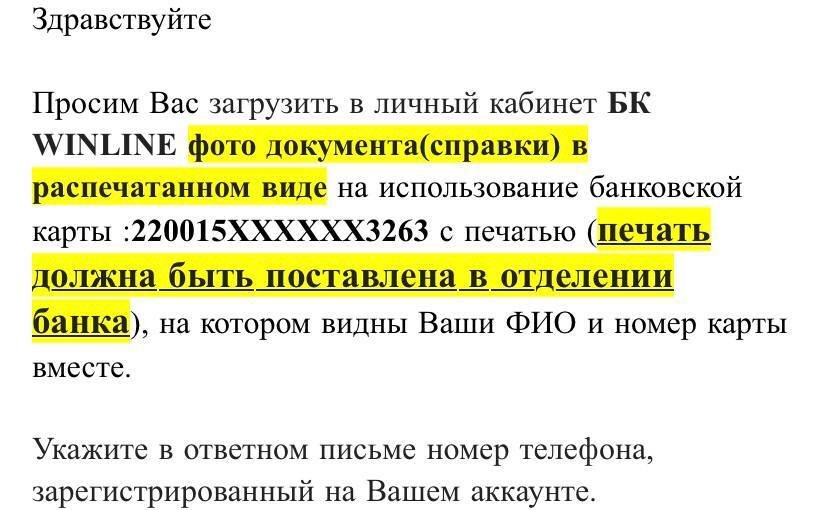 Добрый день,винлайн дает вывести деньги только через сбп и обязательно цупис! С недавних пор цупис мне написал,что сбп не будет мне доступен,но все также могу пользоваться банковской картой. Хочу попросить чтобы мне поменяли способ получить выигрышь через тот же цупис, но на банк. карту. Но после прохождения верификации, из чат бота пропала кнопка вызова оператора( в чат боте для моей ситуации ничего не найти), также писал на почту, но там сразу автоматический ответ который посылает тебя обратно все решать через приложение.Прошу помочь,скрины прилагаю.