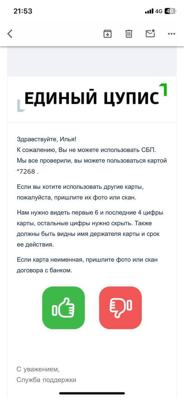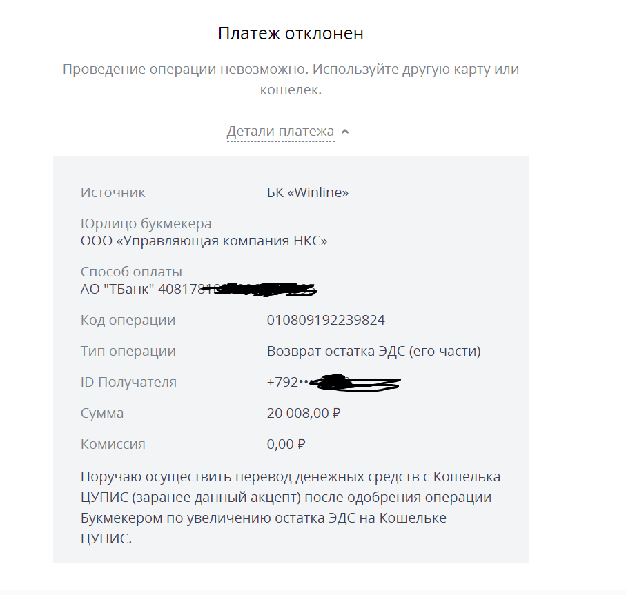 Просили в телефоном звонке подтверждение у Цупис что я реально не могу вывести деньги этим способом.Цупис прислал подтверждение,что я могу использовать только карту( не реквизиты банка,не сбп,ни что что другое ).Дальше присылают что с их стороны нет ограничений.обратитесь в цупис,а я уже присылал им сообщения от цуписа(они говорили как пришлю сообщения от цуписа с подтверждением моих слов,то можно будет решить проблему)Замкнутый круг