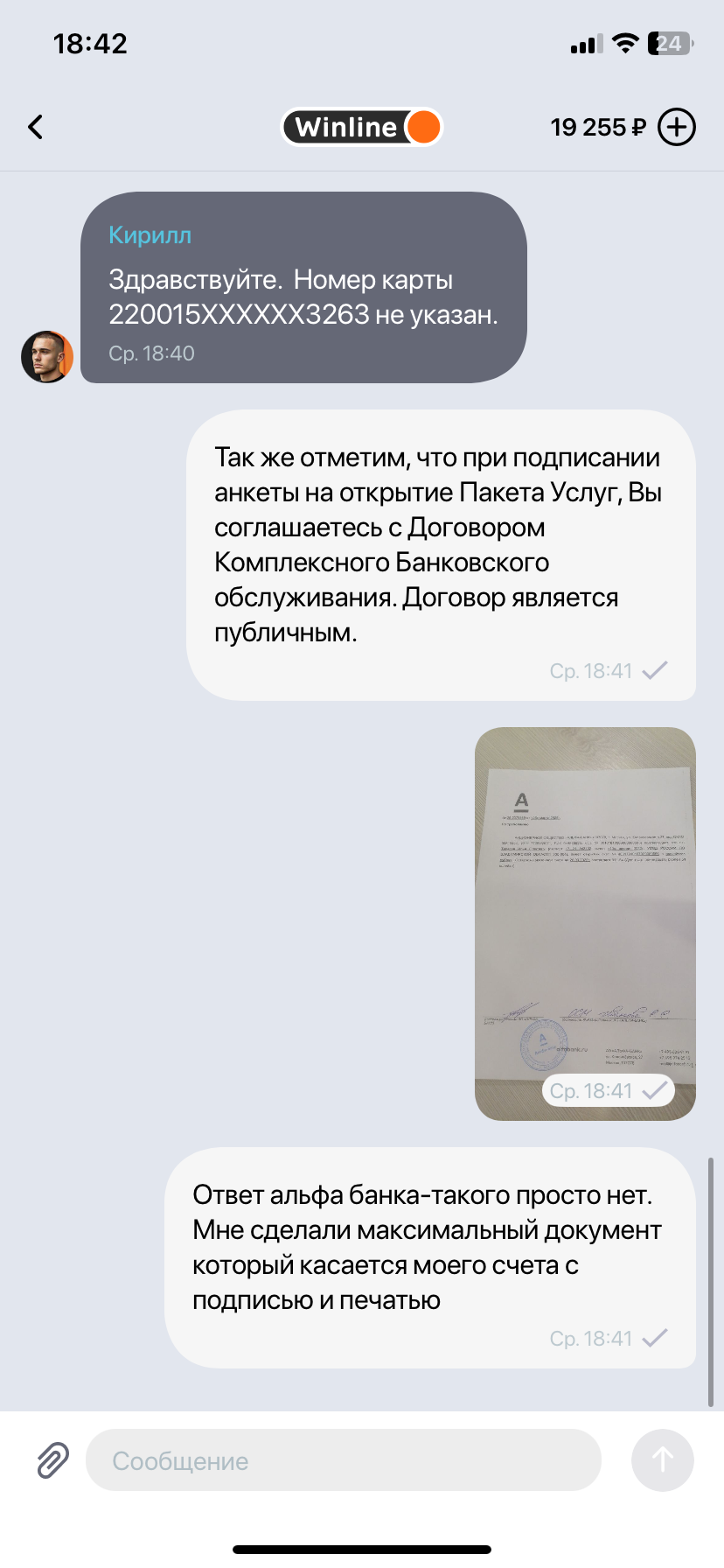 Предоставил им все что касается карты,но они просят-фото бумажного договора с печатью на карту-которого не существует в альфе банке,также лично в банке попросил сделать мне печать и подписи-но они не могут указать номер моей карты(но указали там все остальное-БИК,расчетный счет и тд) сегодня они опять не приняли этот документ-скрины прилагаю