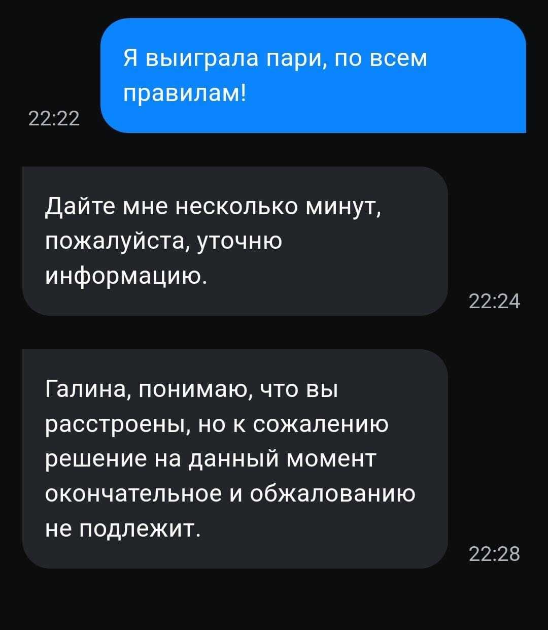 Написали что все операторы заняты, ожидайте, не приятен момент такой, под НГ настроение, Я не заблокирована, все в порядке, верните мне мою так скажу чистую победу, бред же какой-то, сами раздают подарки в виде бесплатной ставки, выигрываешь и начинаются карусели без причины ибо имеют права ещё так напишут, не справедливо господа, репутацию сами себе губите, после такого рекомендовать даже не стану эту БК