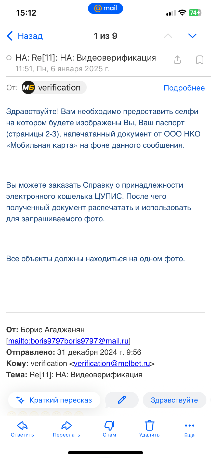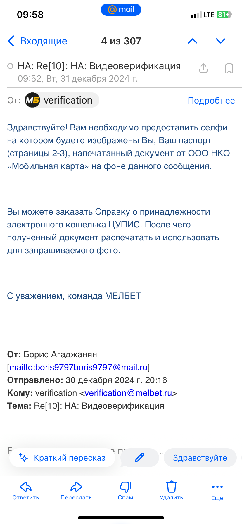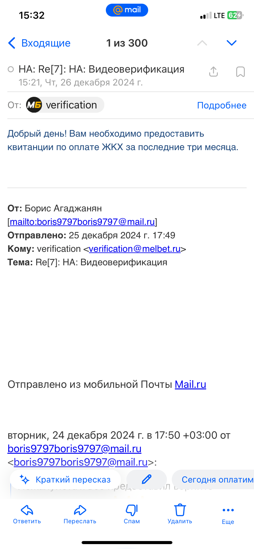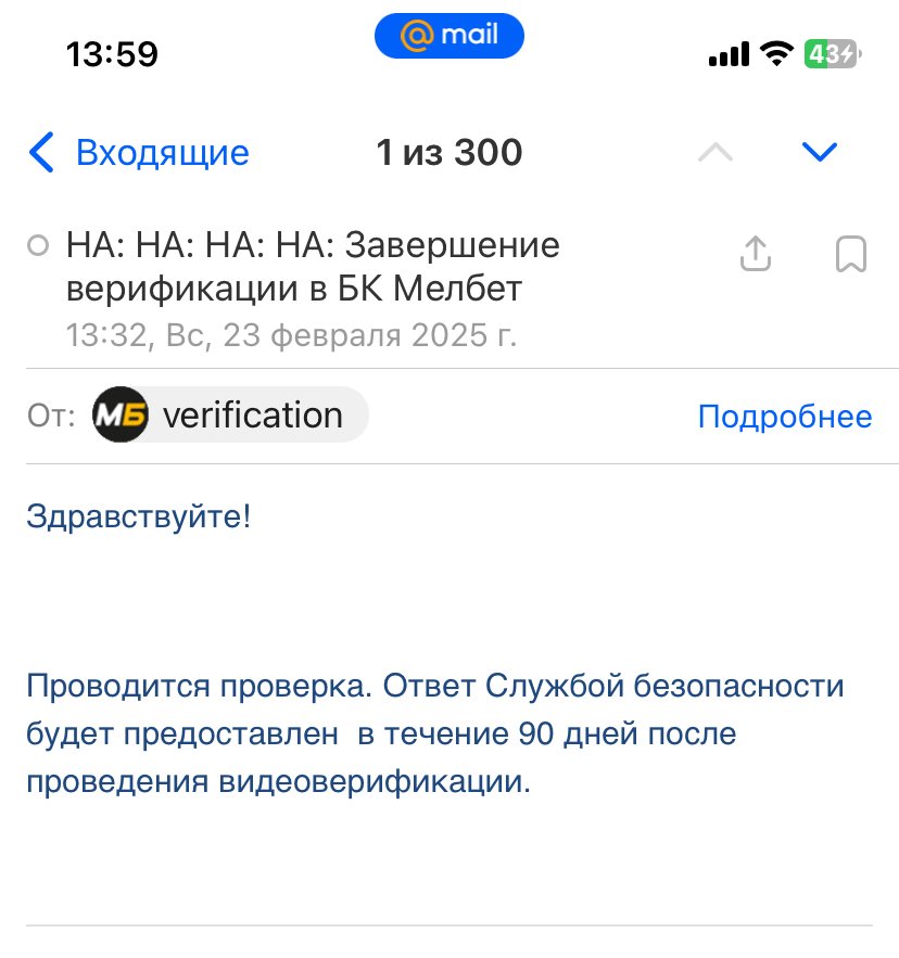 Добрый день, ставил в мелбете пару дней , как только выиграл 20 тысяч , сразу же ограничили вывод средств , разъяснений никаких не давали , ссылаясь на технические трудности , через сутки на почту пришло письмо о необходимости дополнительной верификации, скинул документы на почту, отвечают больше двух суток . С начала запроса верификации прошло 10 суток, Прошу вернуть доступ к аккаунту и убрать неосновательные ограничения на вывод средств. Все необходимые документы были предоставлены по несколько раз, служба затягивает прохождение верификации , помогите
