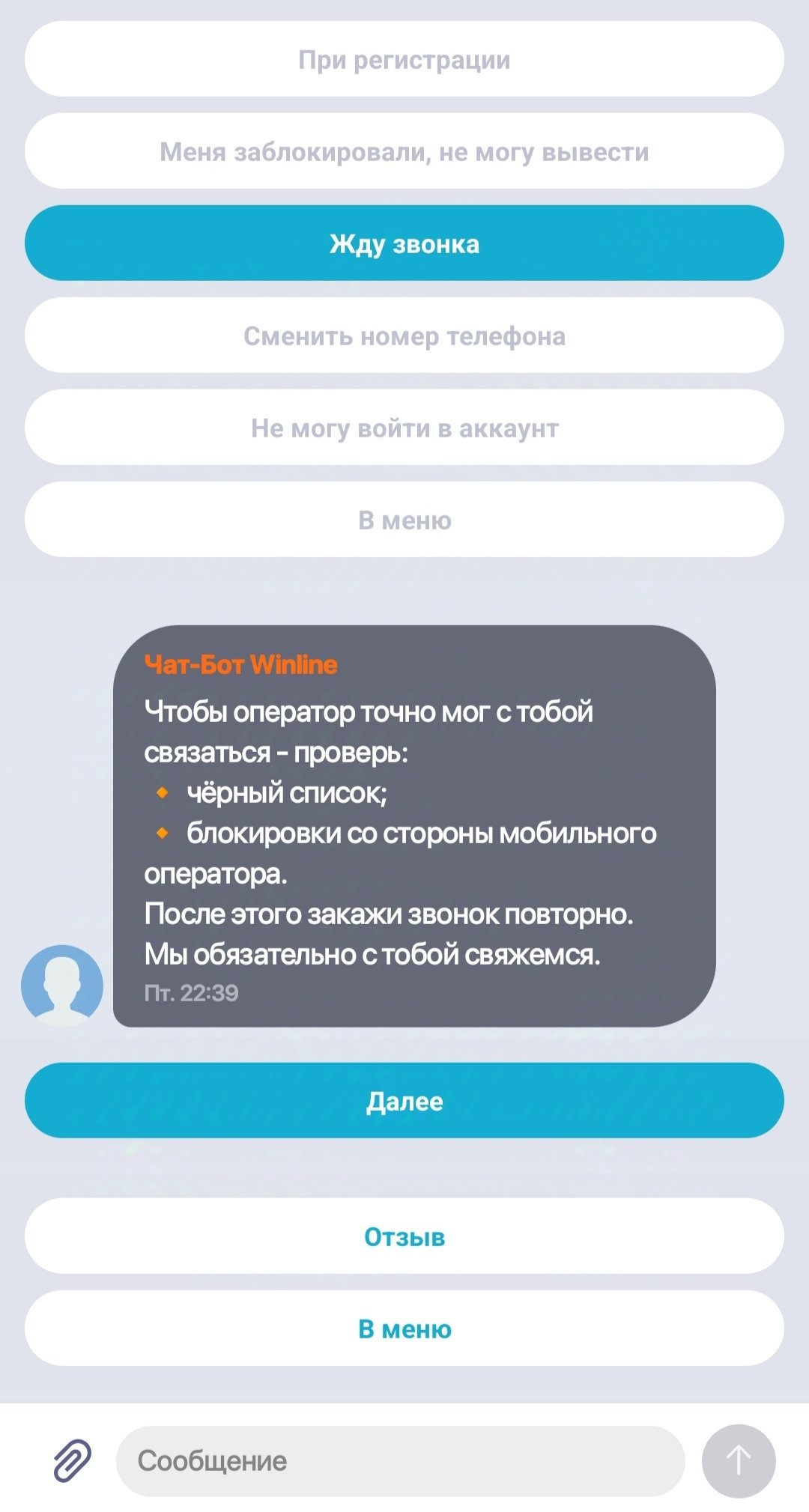 И если вообще нет возможности ответить на звонок? Как получить хотя бы то что пополнил на винлайн?