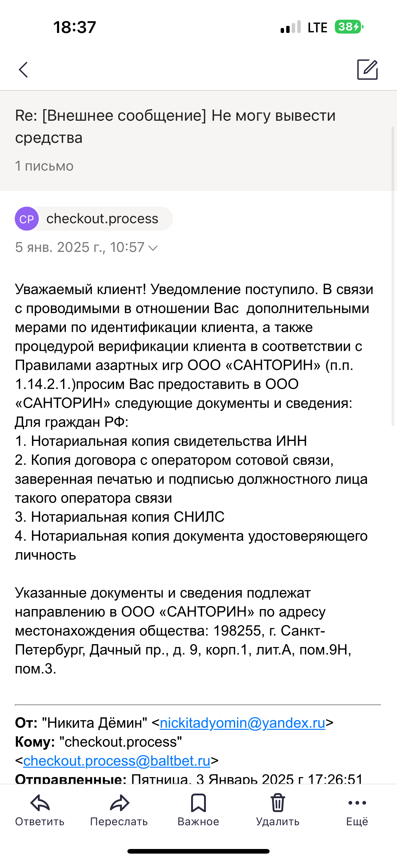 Входил по номеру телефона 79651256038 добрый день , прошу помочь пожалуйста с бк БАЛБЕТ , Удерживают мои средства 16 декабря ограничили вывод 68 тыс прислали что нужно явиться в ППС СДЕЛАЛ ЭТО В ТОТ ЖЕ ДЕНЬ - написал заявление все сделал как сказали далее ждите и уже 2 недели отписки ждите ПОМОГИТЕ ПОЖАЛУЙСТА Прикрепил переписку с бк по почте