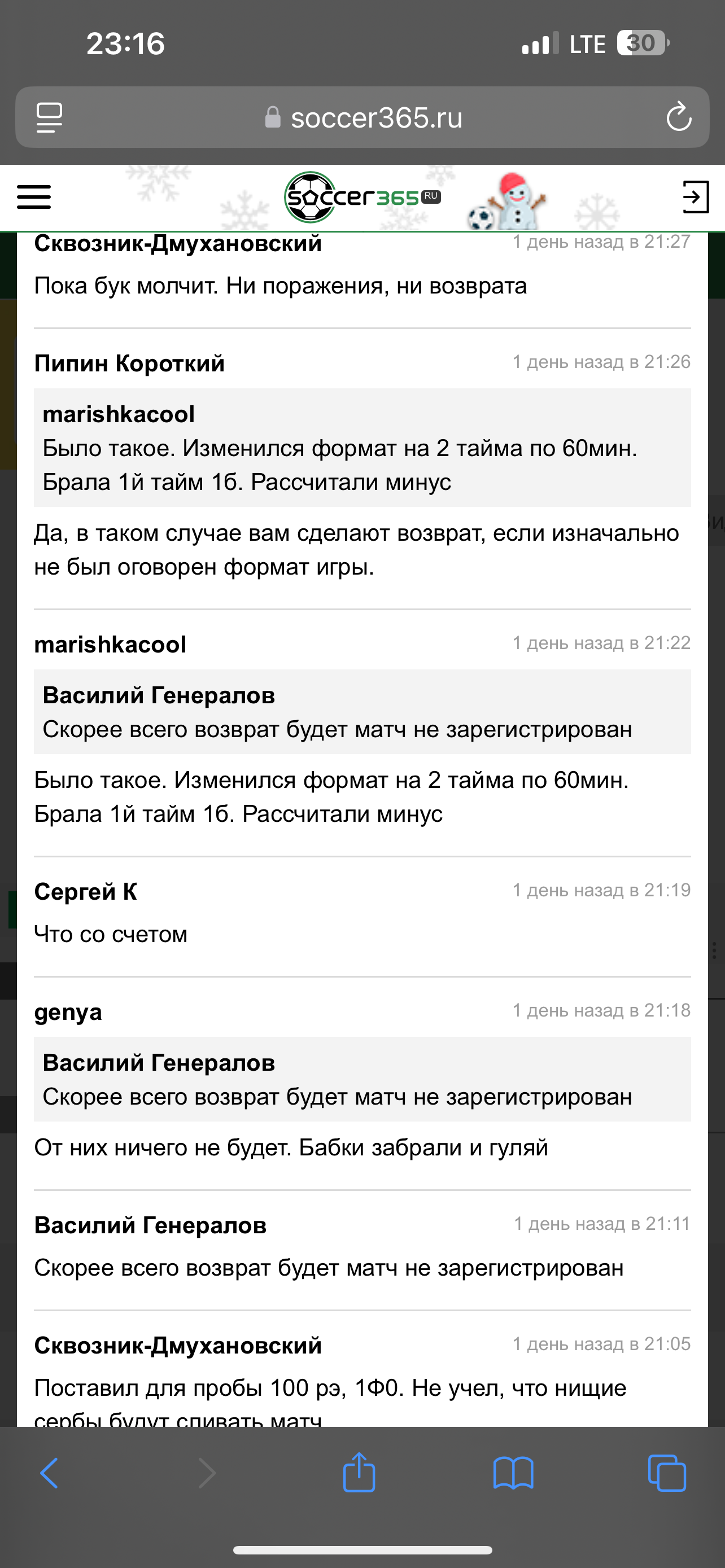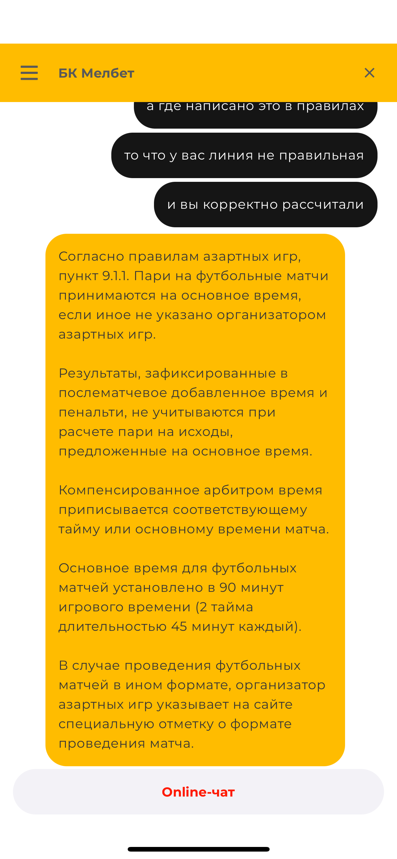 Здравствуйте, стояло две ставки по 5000 на товарищеский матч по футболу Чукарички - Елимай. Ставил на 33 минуте матча. Букмекер давал линию на этот матч в формате игры 2 тайма по 45 минут. В итоге после того как я совершил ставки, матч в лайве сначала заблокировали а потом и вовсе убрали. После этого начал искать трансляцию матчи и увидел то что матч игрался в формате 4 таймов по 30 минут, следовательно у Мелбет не верны были вывешена информация на матч и не правильные корректировки. На скриншоте видно где счет во время принятия ставки там написано (0:0, 0:0). Общаясь с поддержкой букмекера я им обьясняю что у вас в лайве не верный регалмент матча был, на что онр мне отвечают что счет был 0-1 и максимально игнорируют то что я им говорю. В данной ситуации здесь должны были рассчитать возвратом