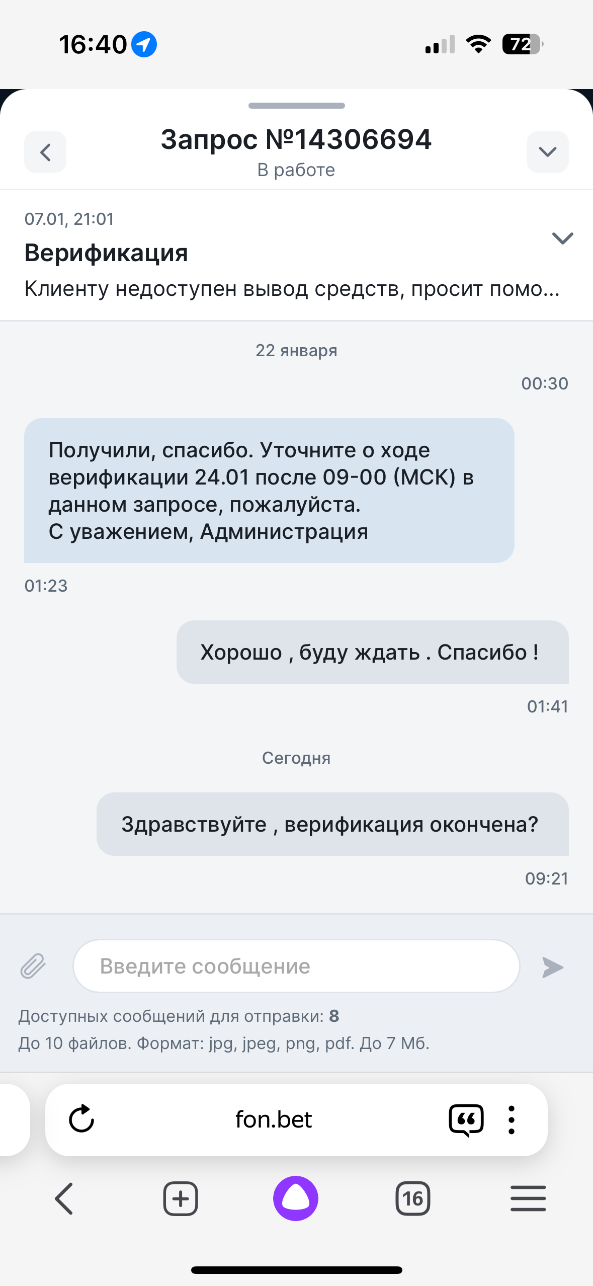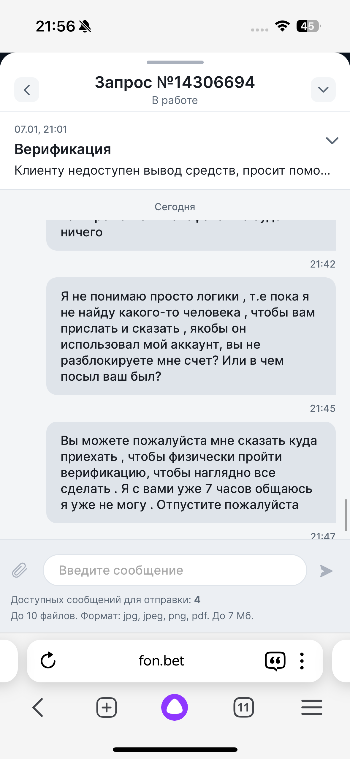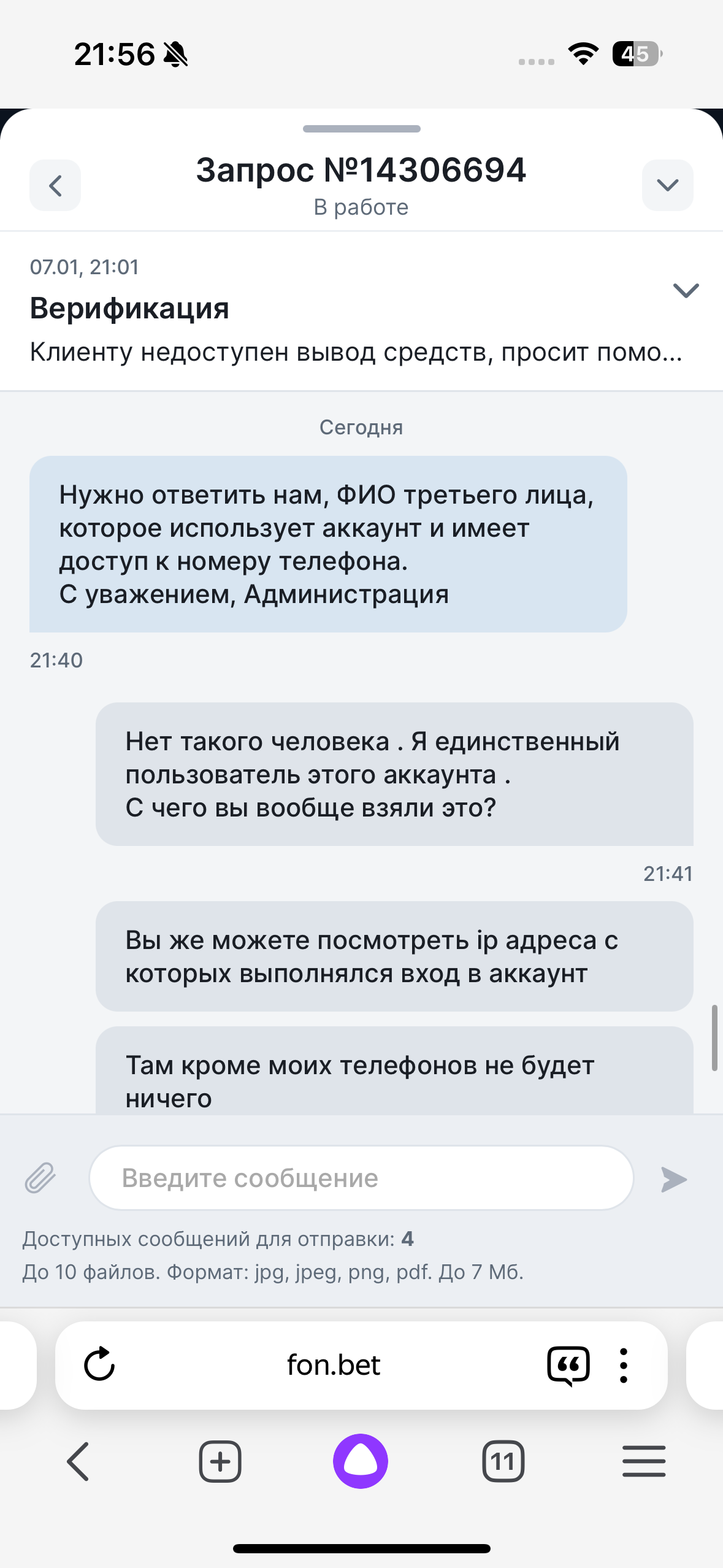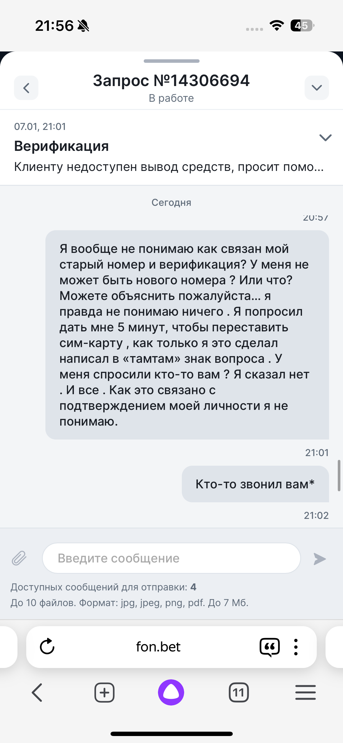Здравствуйте! Я проходил верификацию в бк фонбет , отправил все виды фотографий с документами , после чего была назначена видео верификация . На ней меня спрашивали про правила игры и спросили про номер телефона (есть ли к нему доступ ) который указан к привязанному аккаунту . Это мой старый номер телефона и я сказал , что мне нужно 5 минут чтобы переставить сим-карту . Договорились что в течение 5 минут мы снова свяжемся . По итогу : через 5 минут поступает еще один звонок в мессенджер «тамтам» спрашивают у меня «поступал ли мне звонок на тот самый номер ….?» я отвечаю , что не поступал . Мне говорят спасибо , ожидайте подтверждения верификации в запросе . И в итоге я с ними общался в запросе на протяжении 7часов , где они УТВЕРЖДАЮТ И ВЫМОГАЮТ из меня информацию которая попросту не существует! Говорят что на мобильный телефон (мой старый, сим карту которую я переставлял) был звонок и мною кто-то приставился . Я не знаю , что мне делать в такой ситуации. Готов приехать в любой офис Москвы и показать/пройти все проверки , что я единственный владелец аккаунта.Номер id 5294686