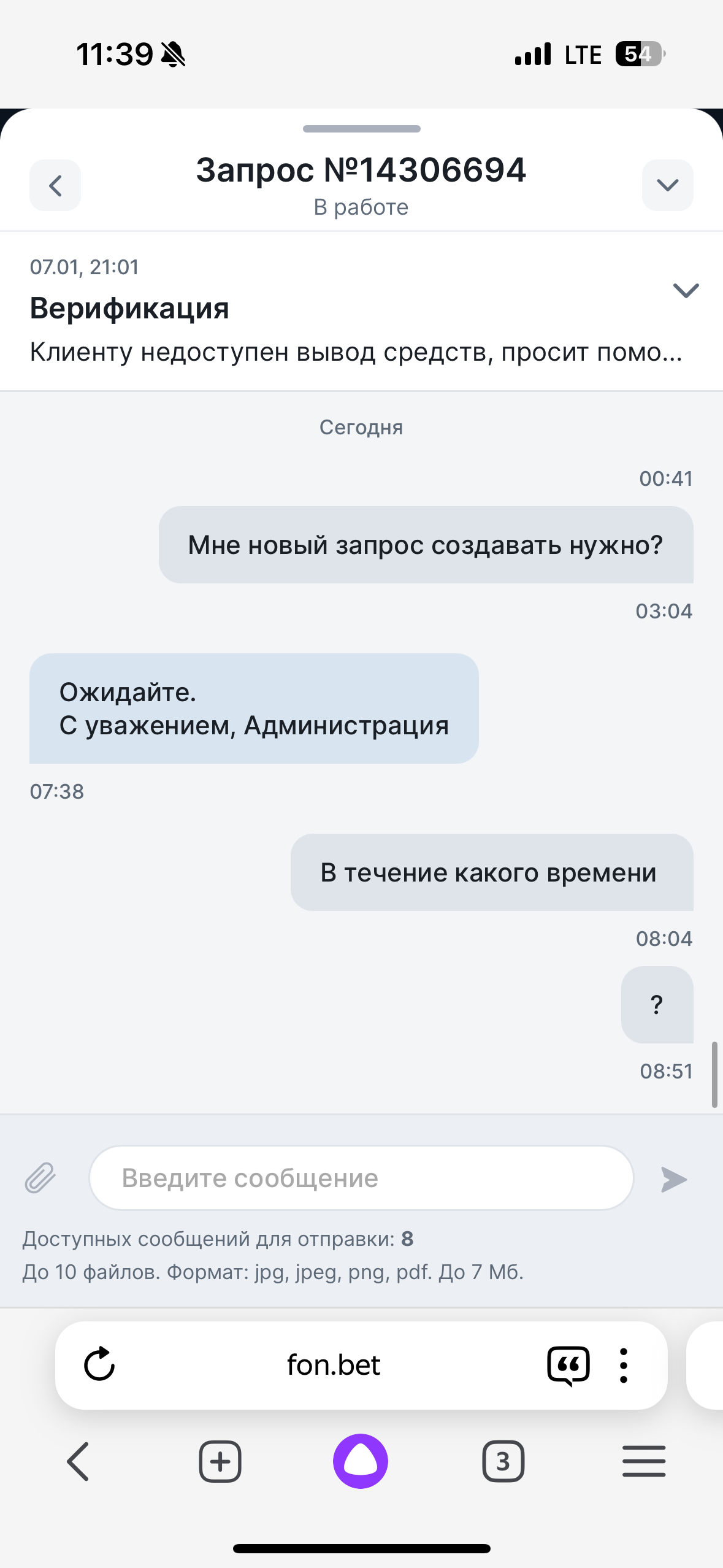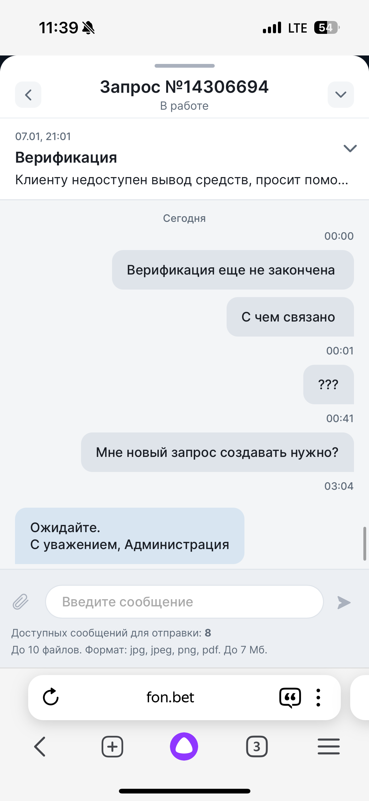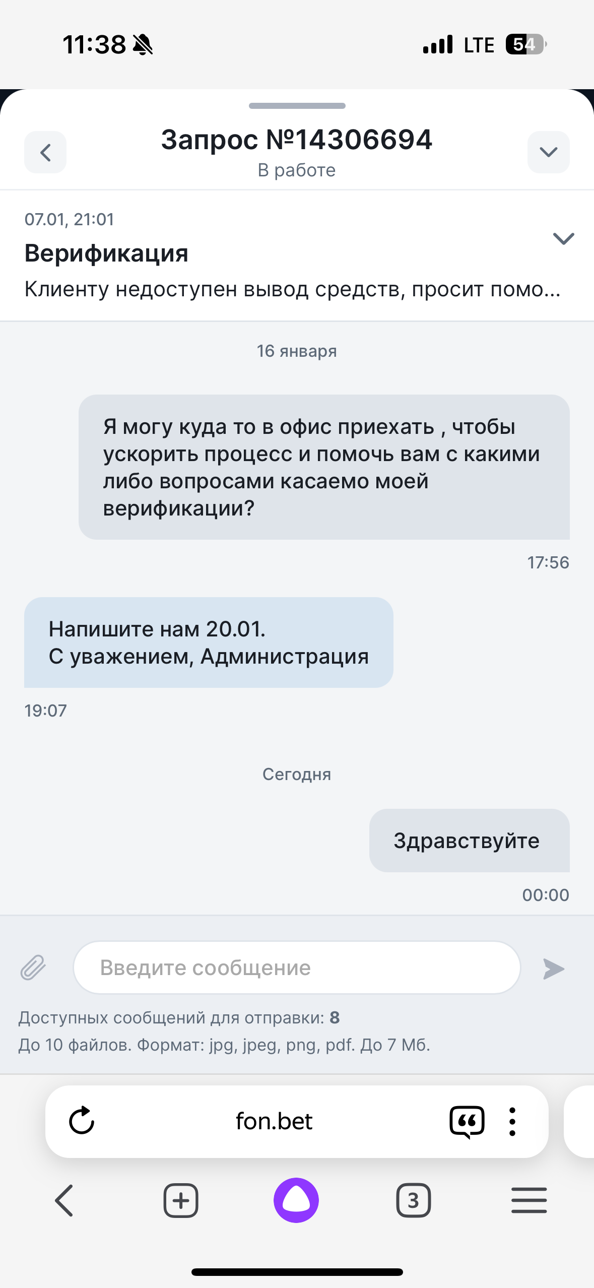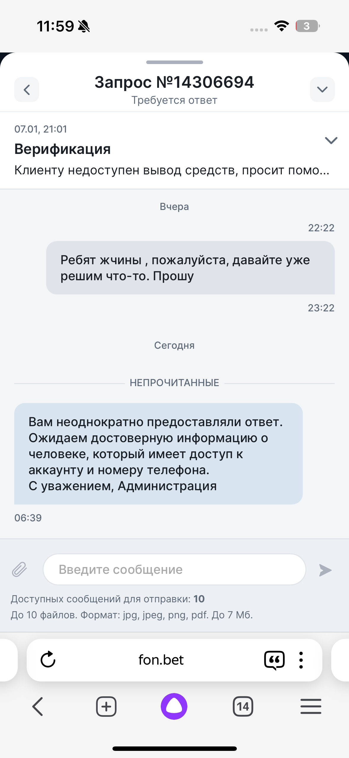Здравствуйте! Я проходил верификацию в бк фонбет , отправил все виды фотографий с документами , после чего была назначена видео верификация . На ней меня спрашивали про правила игры и спросили про номер телефона (есть ли к нему доступ ) который указан к привязанному аккаунту . Это мой старый номер телефона и я сказал , что мне нужно 5 минут чтобы переставить сим-карту . Договорились что в течение 5 минут мы снова свяжемся . По итогу : через 5 минут поступает еще один звонок в мессенджер «тамтам» спрашивают у меня «поступал ли мне звонок на тот самый номер ….?» я отвечаю , что не поступал . Мне говорят спасибо , ожидайте подтверждения верификации в запросе . И в итоге я с ними общался в запросе на протяжении 7часов , где они УТВЕРЖДАЮТ И ВЫМОГАЮТ из меня информацию которая попросту не существует! Говорят что на мобильный телефон (мой старый, сим карту которую я переставлял) был звонок и мною кто-то приставился . Я не знаю , что мне делать в такой ситуации. Готов приехать в любой офис Москвы и показать/пройти все проверки , что я единственный владелец аккаунта.Номер id 5294686