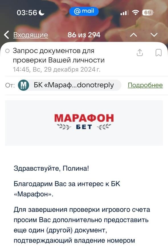 Более подробную информацию по ситуации Вы уже получили на электронную почту, привязанную к игровому счету. Мы обращаемся к Вам с просьбой не создавать дубликатных игровых счетов в БК «Марафон». Любые новые счета, созданные Вами, будут закрыты. Данное решение является окончательным, и мы не намерены вступать в дальнейшую переписку по поводу закрытия Вашего игрового счёта. Приносим извинения за неудобства и рассчитываем на Ваше понимание.