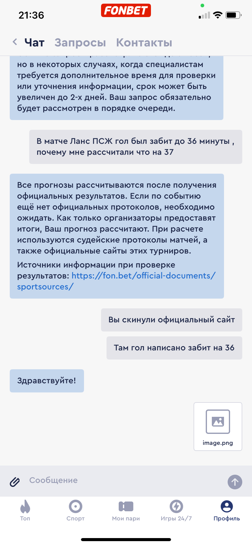 2025г В матче Ланс ПСЖ я ставил что гол будет до 36 минуты , Ланс забил на 35:53 и мне не хотят рассчитать пари верно , пишут что гол забили на 37 минуте , хотя есть видео и фото доказательства, они ссылаются на левые источники где вообще ничего не понятно