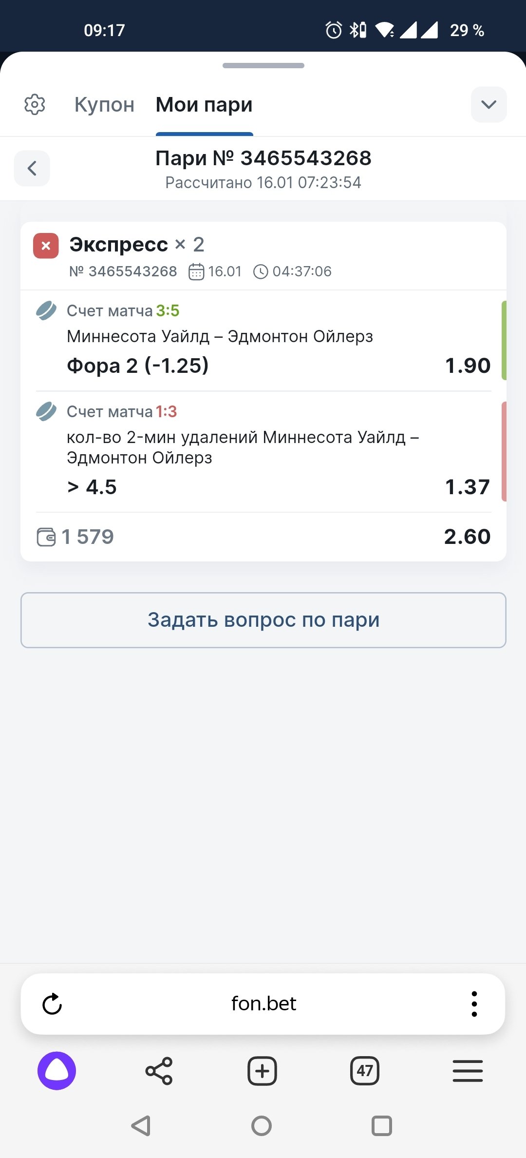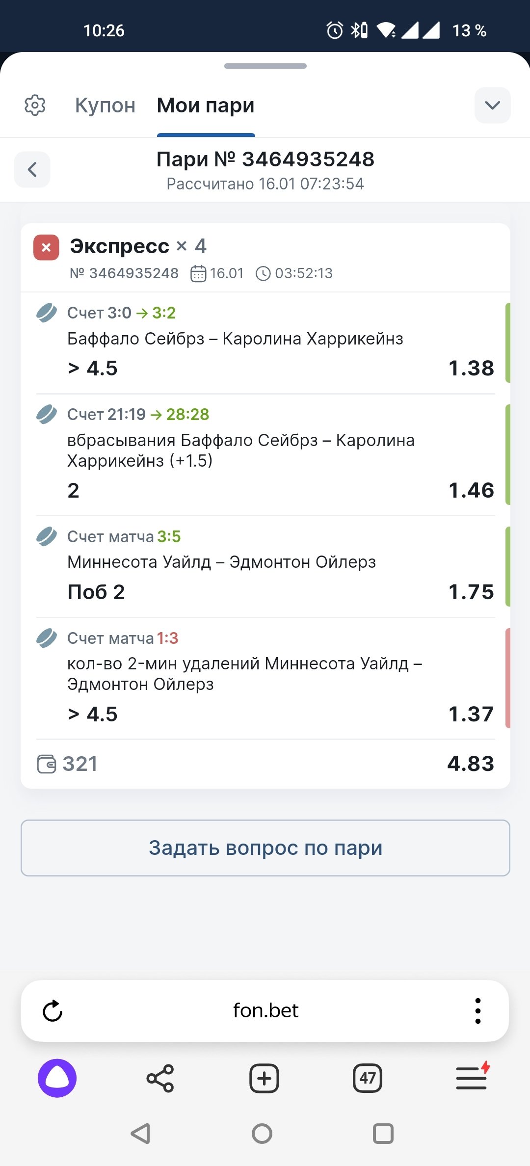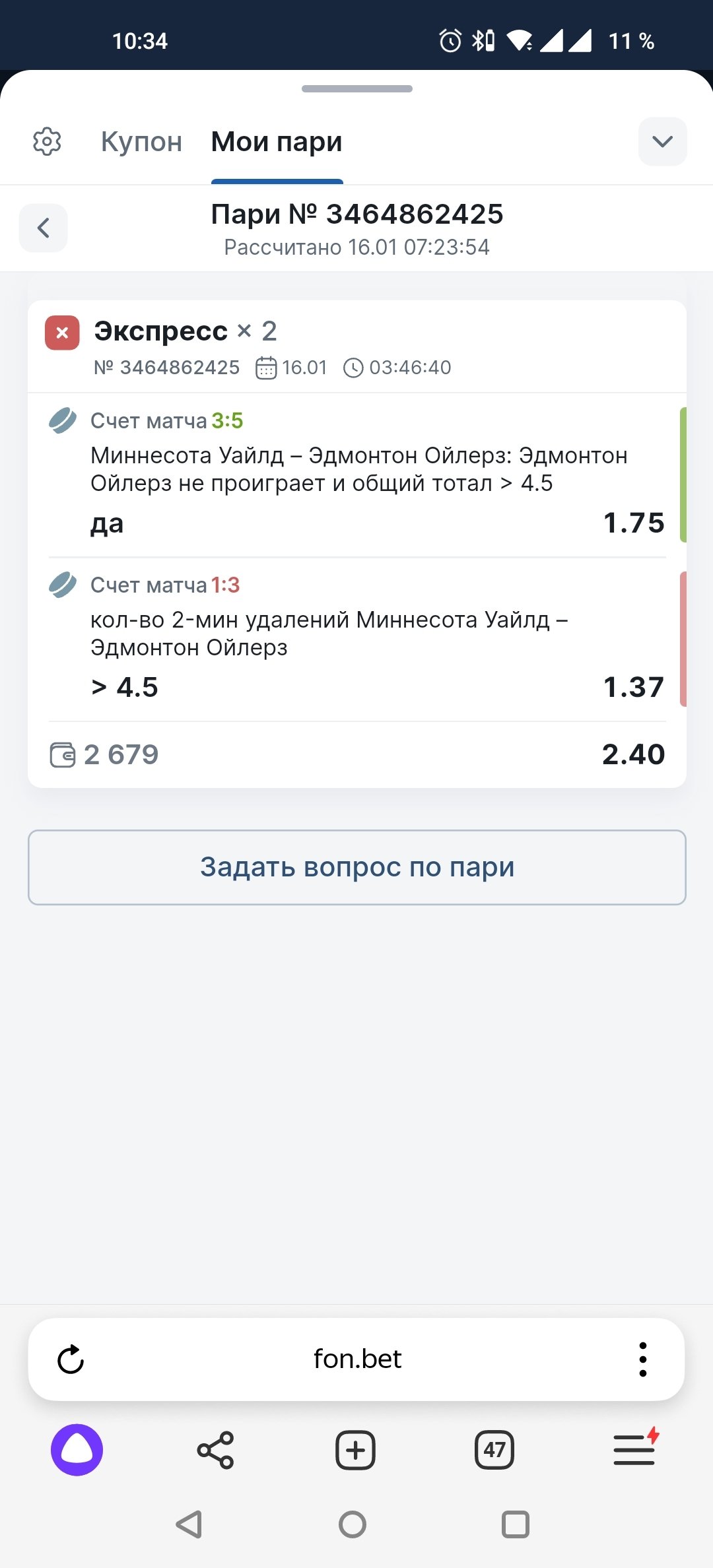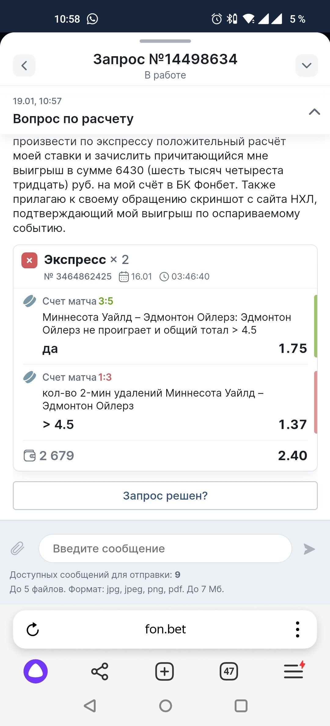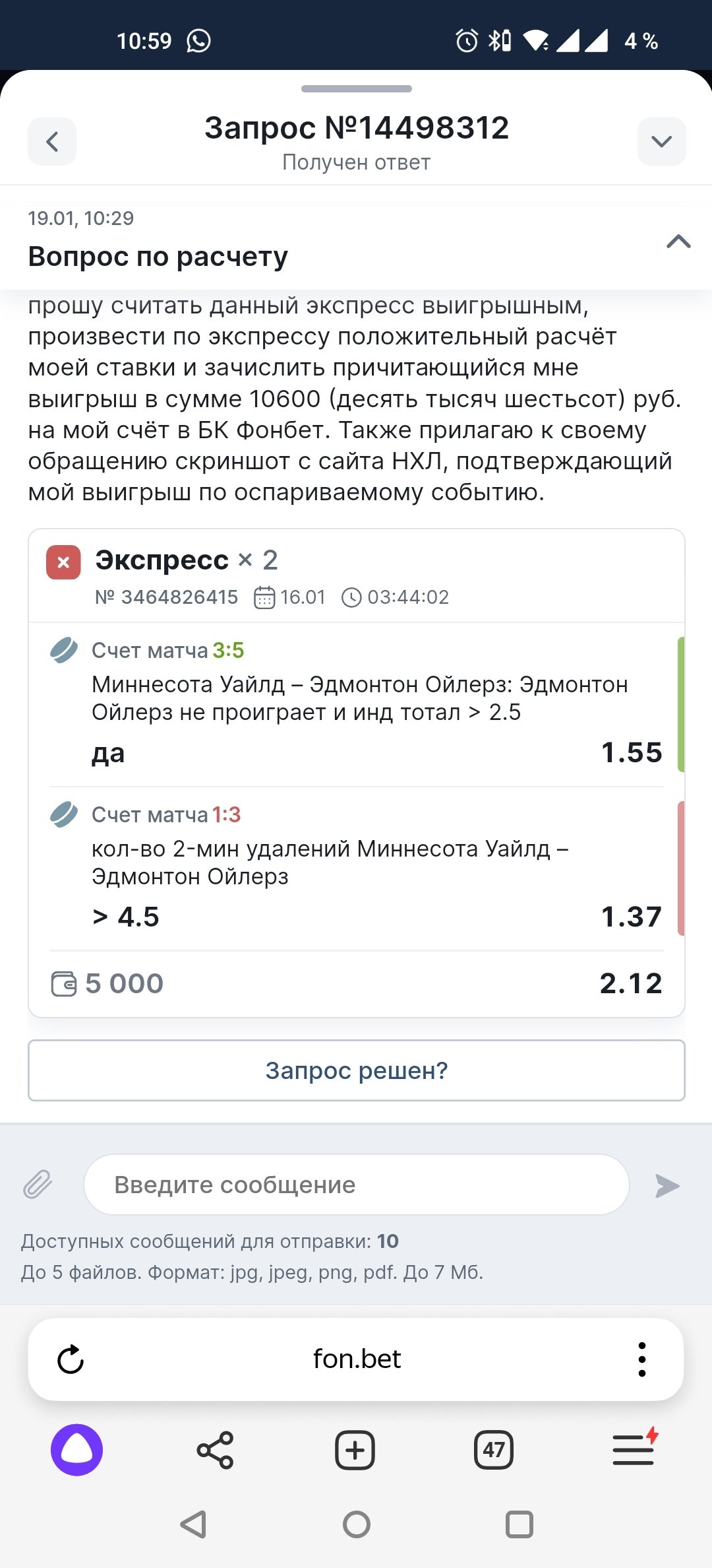 Добрый день, уважаемый Арбитраж Legalbet! Я впервые обращаюсь в Ваш третейский суд с надеждой на справедливость!Мой ID в БК Фонбет - я , через свой личный кабинет в БК, заключил интерактивные пари с БК Фонбет (далее - БК) на хоккейный матч НХЛ - Эдмонтон-Миннесота. Моя ставка была сделана на событие - 2-минутные удаления Тотал больше 4,5.Указанную ставку, именно в этом виде (2-мин удаления ТБ 4,5) я включил в 4 (четыре) экспресса вместе с другими событиями, по которым вопросов нет, все другие события угаданы верно (скриншоты пари приложены). Номера 4-х пари (экспрессов) я указал в ряд в спец. графе при оформлении жалобы, так как во всех этих пари оспаривается исход по одному и тому же событию - удаления ТБ 4,5. Согласно протокола матча, имеющегося в свободном доступе на сайте НХЛ (скриншот протокола прил.), которая по правилам БК является единственным официальным источником статистики на матчи НХЛ, количество 2-мин удалений в матче - 5 (пять) в основное время (доп. времени не было в матче вообще). Следовательно, исход на событие по количеству удалений в матче (5) мною угадан, т.к. я ставил на ТБ 4,5 удалений. Однако, БК не засчитало мою ставку на это событие, необоснованно признав мою ставку по удалениям проигравшей. По данному факту я направил из личного кабинета 4-ре электронных запроса в БК: - 14498312 - 14498634 - 14497709 - 14497292 К запросу приложил протокол матча НХЛ, где четко указано 5 удалений, а значит моя ставка зашла. Ответ БК - отказ в перерасчёте ставки и приложили странный файл, имеющий признаки фальсификации (см. вложение). Поясняю признаки фальсификации - БК представило мне скриншот некоего протокола данного матча, нижняя часть которого отрезана. В данном протоколе количество удалений - 4. Но время составления протокола НХЛ (указывается внизу протокола в последней строчке) вырезано БК, возможно и умышленно, чтобы нельзя было проверить в какое время он был отскринен с сайта НХЛ. Вот в действительном протоколе матча на сайте НХЛ (см. вложение) время указано и отсюда явствует, что протокол составлен после матча, т.е. итоговый. Почему важно видеть на самом протоколе время его составления НХЛ? Поясняю, что протокол матча в НХЛ ведётся с нарастающим итогом в течение всего матча, т.е. статистические показатели добавляются в него автоматически по ходу матча и вытащить с сайта НХЛ можно во время матча любое количество протоколов в любую секунду. И время скачивания протокола НХЛ всегда указывает в последней строке протокола, вплоть до секунды. К чему я это поясняю - значит каждый человек может скачать любой протокол матча НХЛ и по ходу матча, и в его последние минуты, и после матча итоговый. Вот только стат. показатели в этих протоколах будут отличаться на 1,2, 3 и более единиц. Поэтому очень важно видеть время составления автоматизированной системой НХЛ конкретного протокола, например, представленного мне БК, чтобы я и Арбитраж могли сопоставить время в протоколе с временем окончания матча и сделать выводы о его легитимности по вопросу расчета ставок. А раз времени составления в протоколе БК не указано, значит нельзя признать его доказательством правоты БК, т.к. они могли скачать его в любой момент матча, а не после его завершения. Тем более, что после матча НХЛ выложило итоговый протокол, где все правильно указано по статистике. Также БК приложило рядом к своему "отрезанному" проток