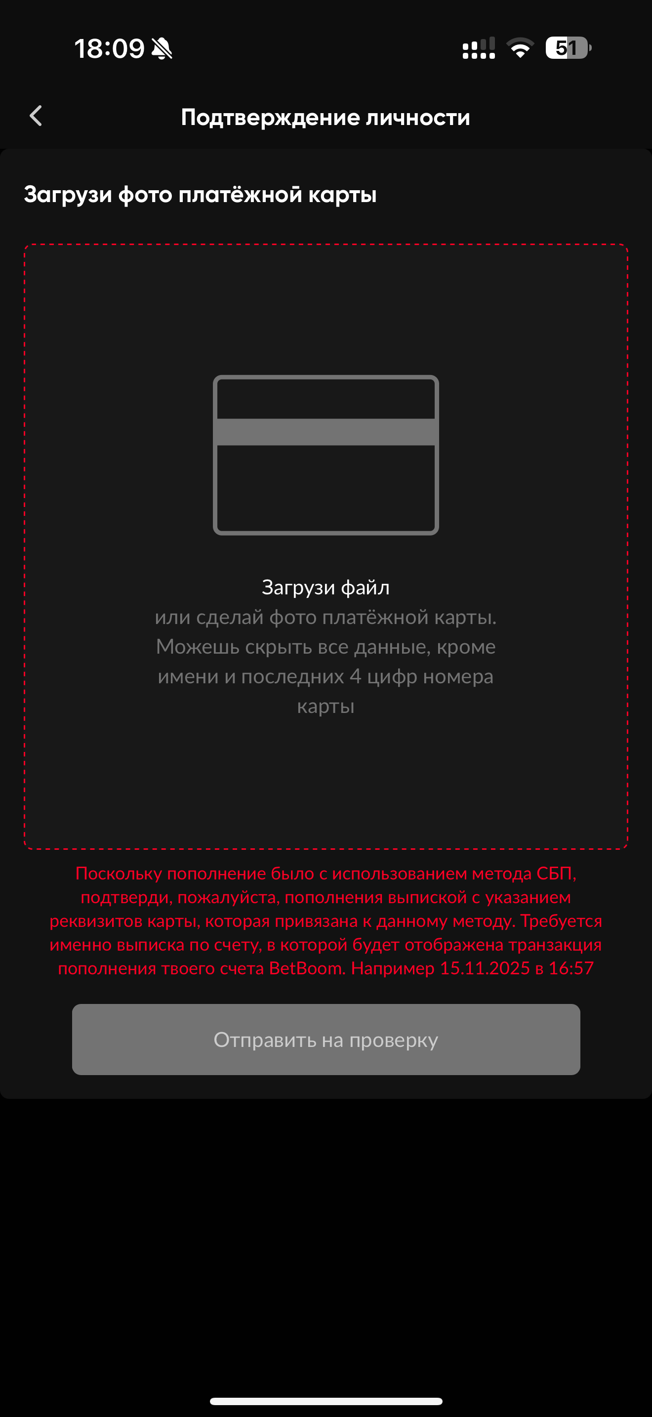 Здравствуйте, давно играю на конторе проблем не было раньше. Сейчас запросили верификацию вроде бы всё загрузил кроме одного фото его не принимают никак. Мне как слабовидящему тяжело даётся это прохождение, раньше без проблем играл в конторе Пишет вот что: На документе одновременно должны быть видны печать, ФИО и транзакция. Поскольку пополнение было с использованием метода СБП, подтверди, пожалуйста, пополнения выпиской с указанием реквизитов карты, которая привязана к данному методу. Требуется именно выписка по счету, в которой будет отображена транзакция пополнения твоего счета BetBoom Изначально было загружено фото карты оно не принялось, потом выписка по карте за определённый период не принято, потом чек за транзакцию на пополнение через СБП метод, всё не принялось. Позвонил в Бетбум, оператор сказал можно скриншотом с телефона и тоже как то не прошло! В ВТБ сказали что такой документ развёрнутый где всё это видно не предоставят. Вообщем дайте точную информацию как откуда снимок должен быть или каким образом его сделать или дайте другой вариант прохождения пожалуйста. Мой ID 6451659 Заранее спасибо!