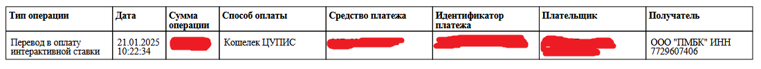 Доброго дня всем. Зарегистрировался в данной БК . Сделал 9 дкпозитов 23 и 24 числа на общую сумму 273667 рублей. Все с кошелька Цупис. вечером хотел вывести небольшую часть около 44000 на цупис. В итоге платеж отменен букмекером, а утром пришлл письмо с верификацией. Все документы предоставил, получил новок письмо с новыми требованиями, ну и далее, по кругу....Я отсылаю, они требуют новые. Цель ясна- затянуть время. Но вот последние 2 дня требуют несуществующий документ- выписку ЦУПИС, но такую, чтобы были видны получатели платежа. В выписке, которая заказывается в приложении ЦУПИСа нет имен получателей платежей. Букмекер продолжает утверждать, что я должен заказать другую выписку в цуписе. Но другой там нет.