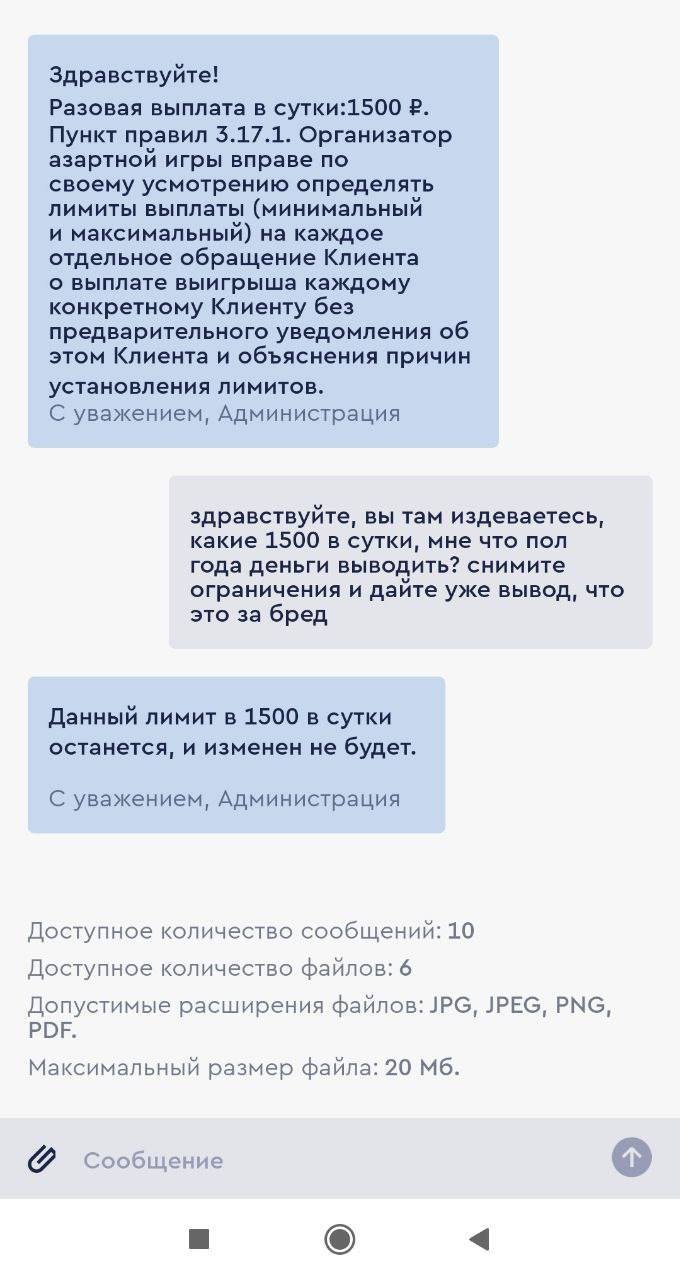 Играл в фонбет регулярно. С 2023г. Были выигрышные и проигрышные ставки, все как у всех. Депозит в основном был рублей, вопросов не было. Но как только я решил сыграть по крупному и внес депозит с отложенных денег на покупку семейного авто, а именно руб баланс стал с этой суммы я поднял баланс до и решил остановиться. Но вывести эти деньги я не смог, так как назначили верификацию на 27 декабря, хотя она у меня и так полная!! Ну делать нечего, выполнял все требования, видеозвонки, предоставления всевозможных документов, отвечал на все поставленные вопросы. Пока это все проверялось, проиграл около По итогу сказали ждать 30 января, будет ответ января я прошел верификацию и мне сообщили следующие: Здравствуйте!Разовая выплата в сутки:1500 ₽. Пункт правил .1. Организатор азартной игры вправе по своему усмотрению определять лимиты выплаты (минимальный и максимальный) на каждое отдельное обращение Клиента о выплате выигрыша каждому конкретному Клиенту без предварительного уведомления об этом Клиента и объяснения причин установления лимитов.С уважением, АдминистрацияНа мои многократные вопросы и просьбы что-то сделать с лимитом И как мне вывести хотя бы тот миллион каждый раз отвечали коротко и четко. ЛИМИТ ИЗМЕНЕН НЕ БУДЕТ!Прошу разобраться с этой проблемой! У меня нету возможности больше 2ух лет ежедневно ездить в контору за наличкой в 1500 рублей, это же просто абсурд!! Т.к срочно нужны деньги на покупку семейного авто, я не планировал брать деньги на такой долгий срок!!!!