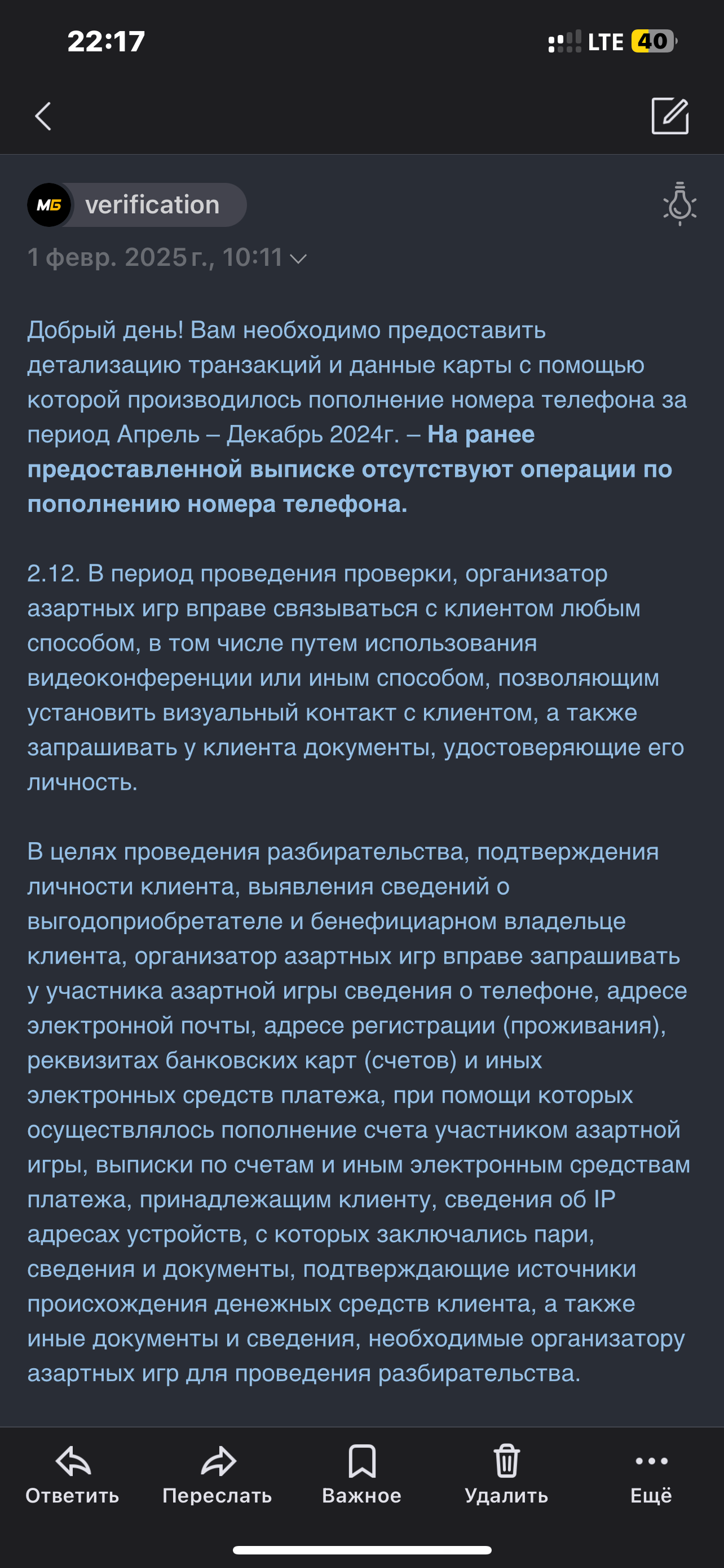 Приветствую! помогите разобраться-Бк МЕЛБЕТ после нескольких выигрышей закрыла доступ на аккаунт,назначила верификацию.Все,что они запросили я прислал, но началась интересная история.Они требуют выписку с карты,с которой я оплачиваю сотовый телефон. Карта не прикреплена ни к цупису,ни к бк.И на каком основании я должен скидывать им другие карты,с которых я пополняю телефон ?Я им прислал фото паспорта ,фото селфи с паспортом на фоне пк ,все чеки об оплате номера ,договор на номер ,скриншот с личного кабинета сотового оператора ,выписки с движением финансов по двум картам,с которых пополнял и на которые выводил, фото карточек как полагается,вобщем прислал все ,что просили ,но другие карты ,которые не участвовали в моей деятельности с бк ,я не обязан показывать с них выписки по движению средств ,и я не помню в правилах обязательное условие оплаты номера с карты,которая привязана к цупису и бк.Вся история с верификацией длится очень долго,сейчас начнется 3 месяц Первый запрос документов был
