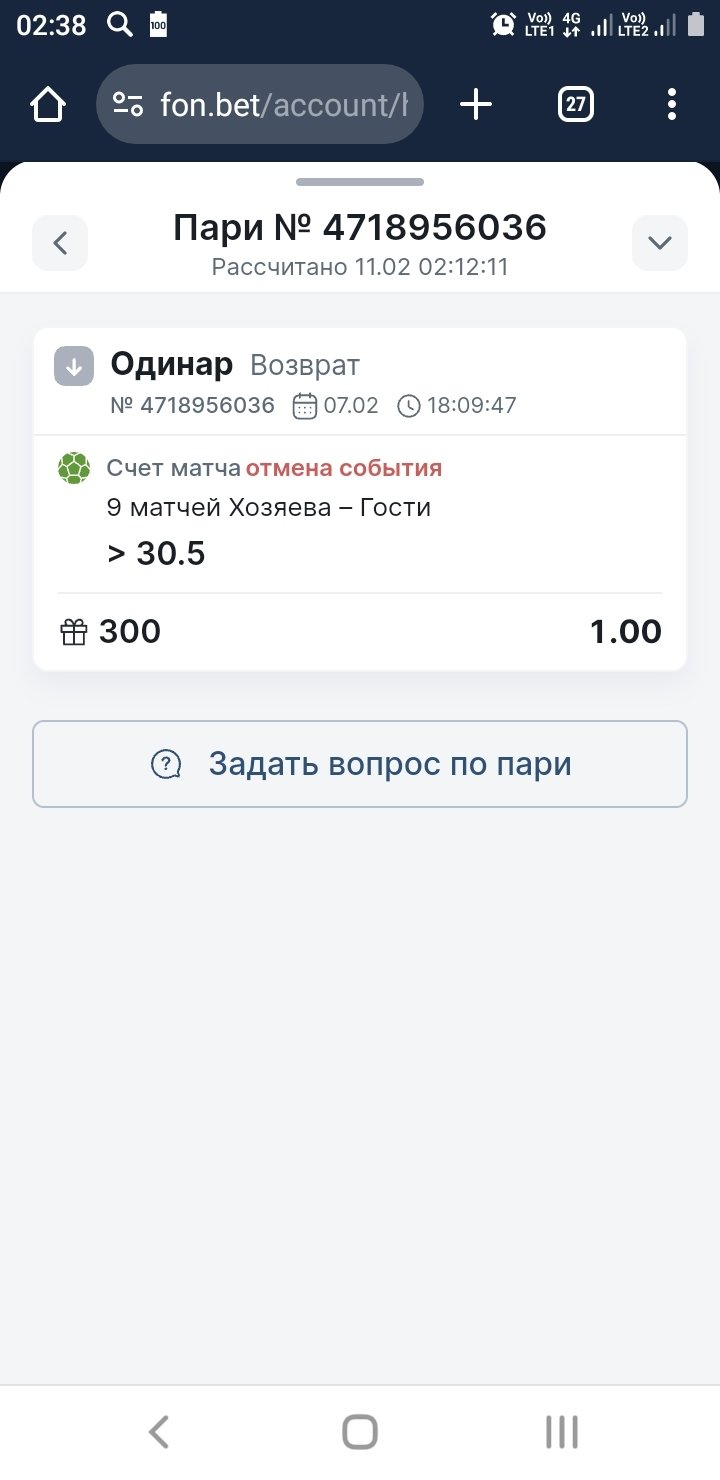 Из за отмены одного матча тура,мне не вернули фрибет в сумме 300р.Смысл игры тогда в этой помойке Фонбет?!Только не надо на их правила ссылаться,тогда и фрибетов не надо давать!