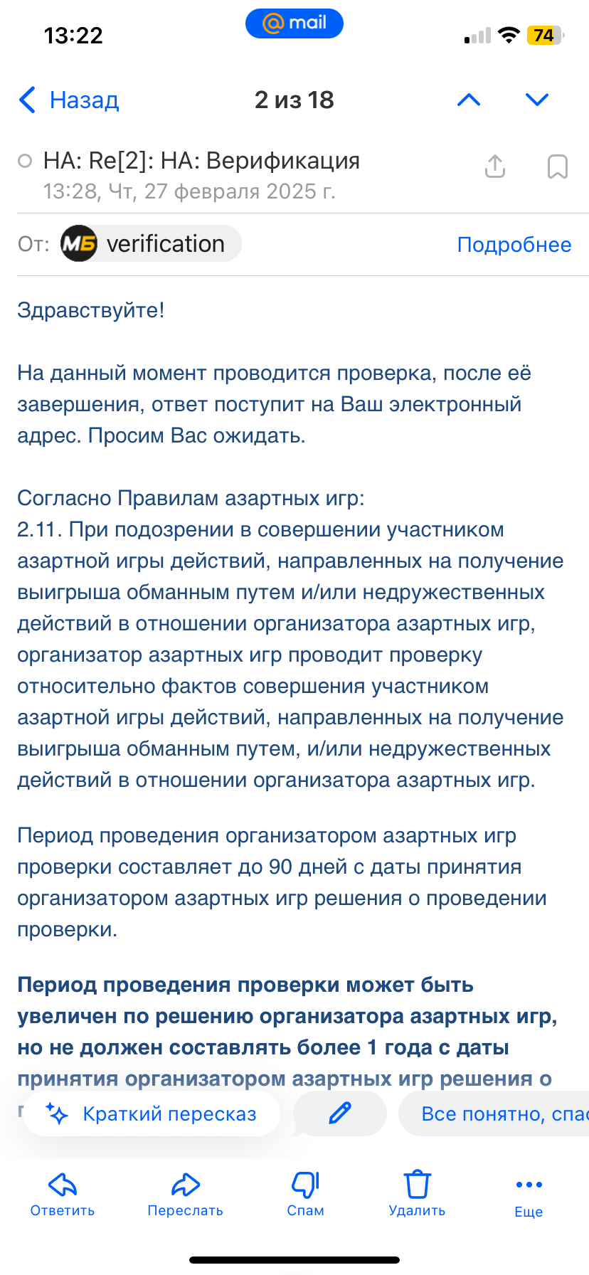 Нагло затягивают сроки проверки аккаунта , никакого уважения к игрокам и это легальная бк.