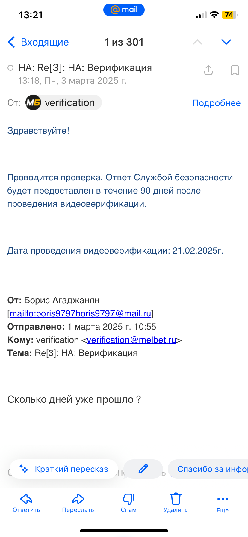 Доступ к аккаунту был заблокирован . Выполнил миллион требований бк по предоставлению документов , после чего наконец прошел видеоверификацию. Но этого оказалось недостаточно для возврата доступа к аккаунту , на почту пришло сообщение что срок проверки после видеоверификации составляет до 90 дней . Пожалуйста помогите вернуть доступ к аккаунту , какой позор так себе вести легальной бк, так затягивая сроки, притом что сумма незначительная , миллионы я не выиграл