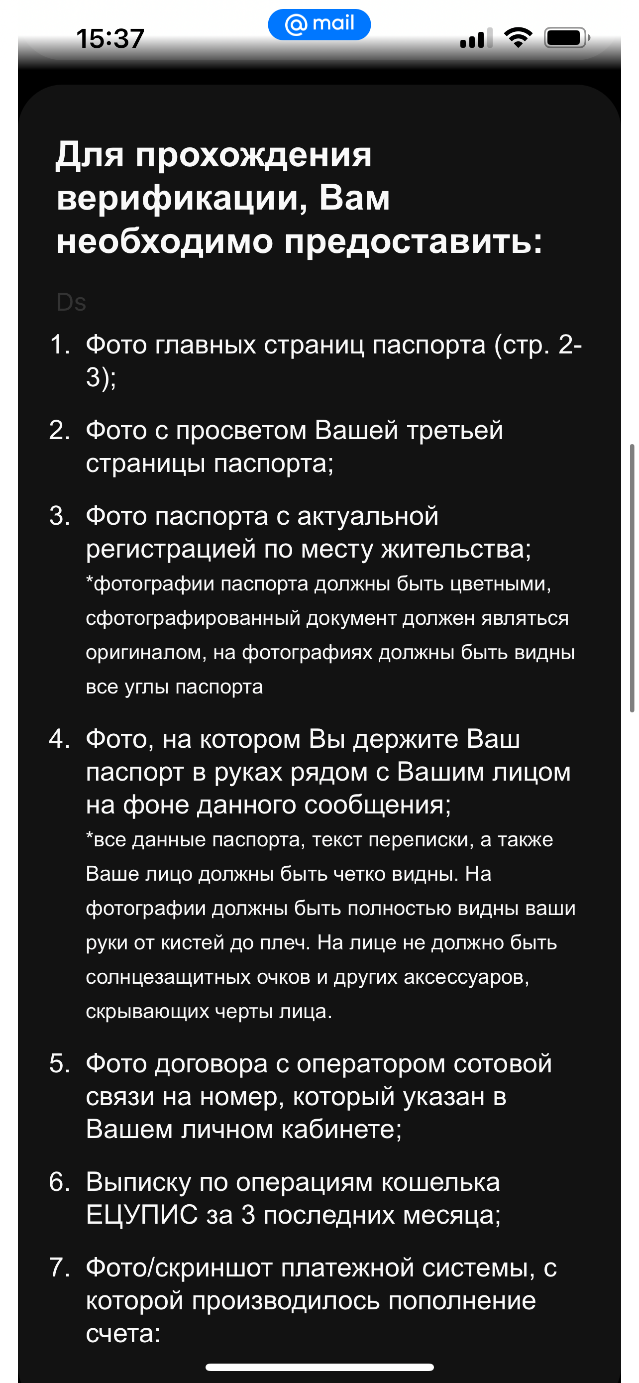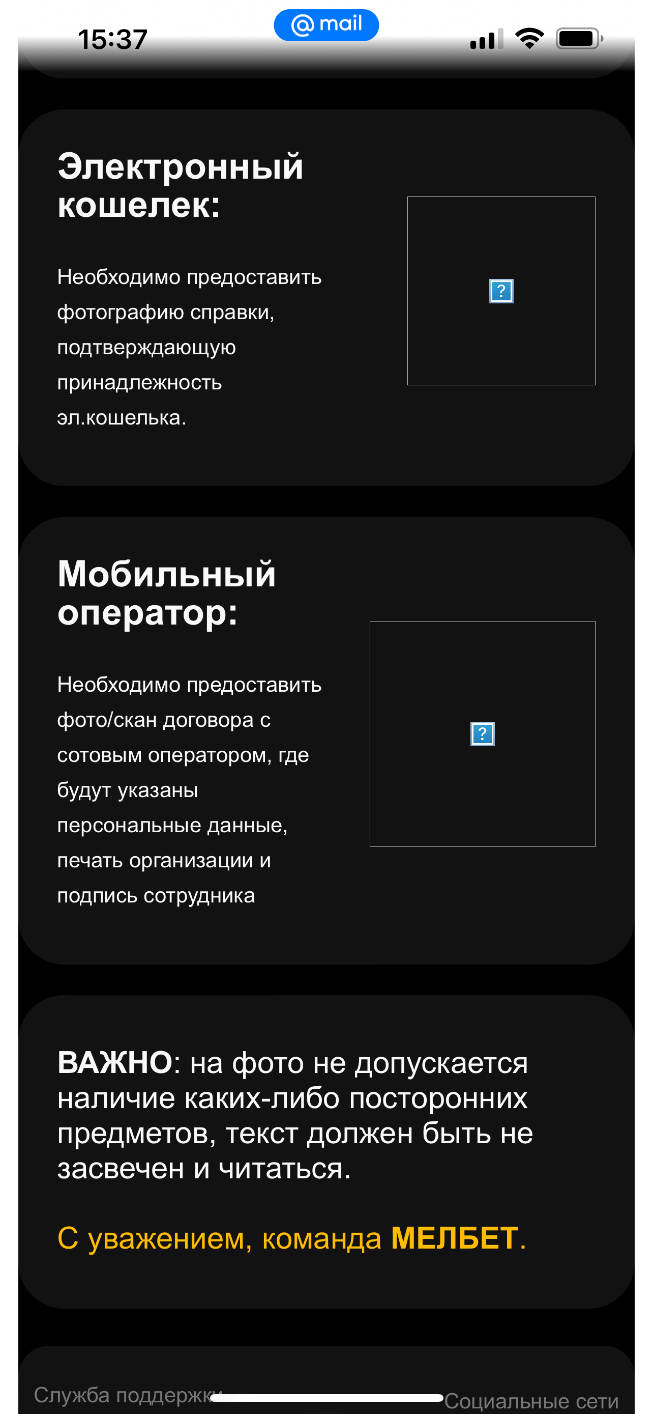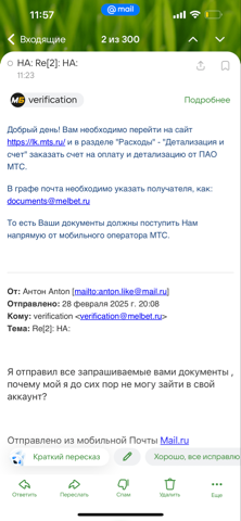 Здравствуйте, играл в БК Мелбет ставил на волейбол, после того как выиграл закрыли доступ в аккаунт и попросили связаться со службой поддержки. В службе поддержки запросили документы которые я им все отправил. После отправки документов мне приходит на почту письмо о просьбе предоставить опять эти же документы. Я им еще раз все отправил. Они опять просят предоставить их и так всегда. Они просто заблокировали счет, не дают пройти верификацию хотя я им все предоставляю, это длиться уже больше двух месяцев, они просто издеваются. Скрины моего аккаунта и переписки подкрепляю. Помогите пожалуйста разобраться.