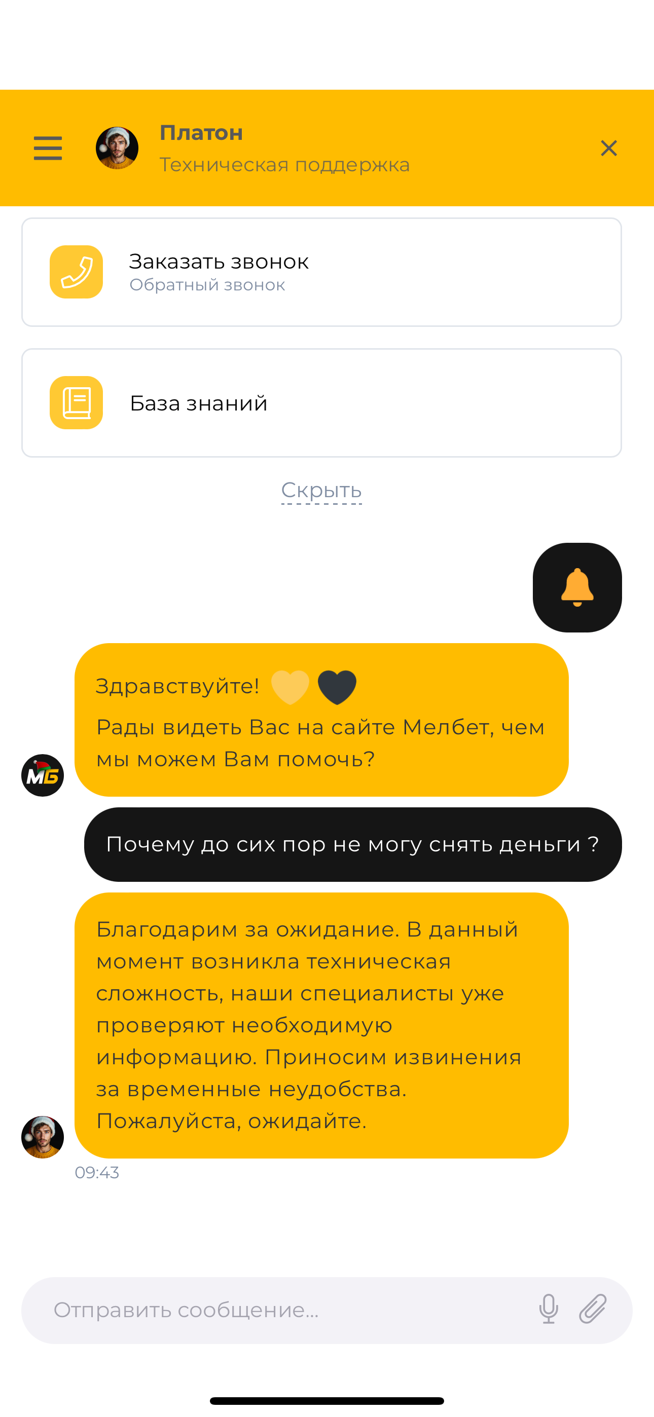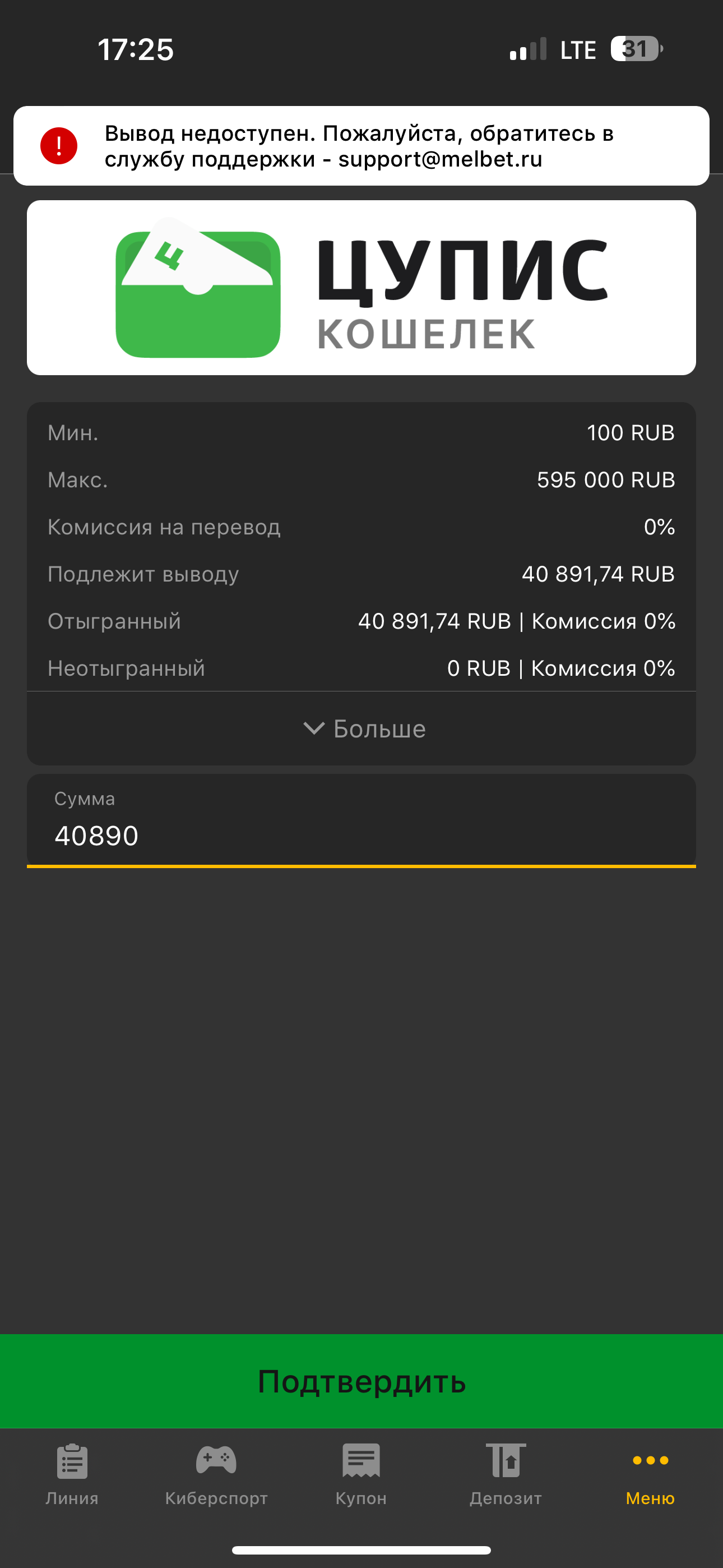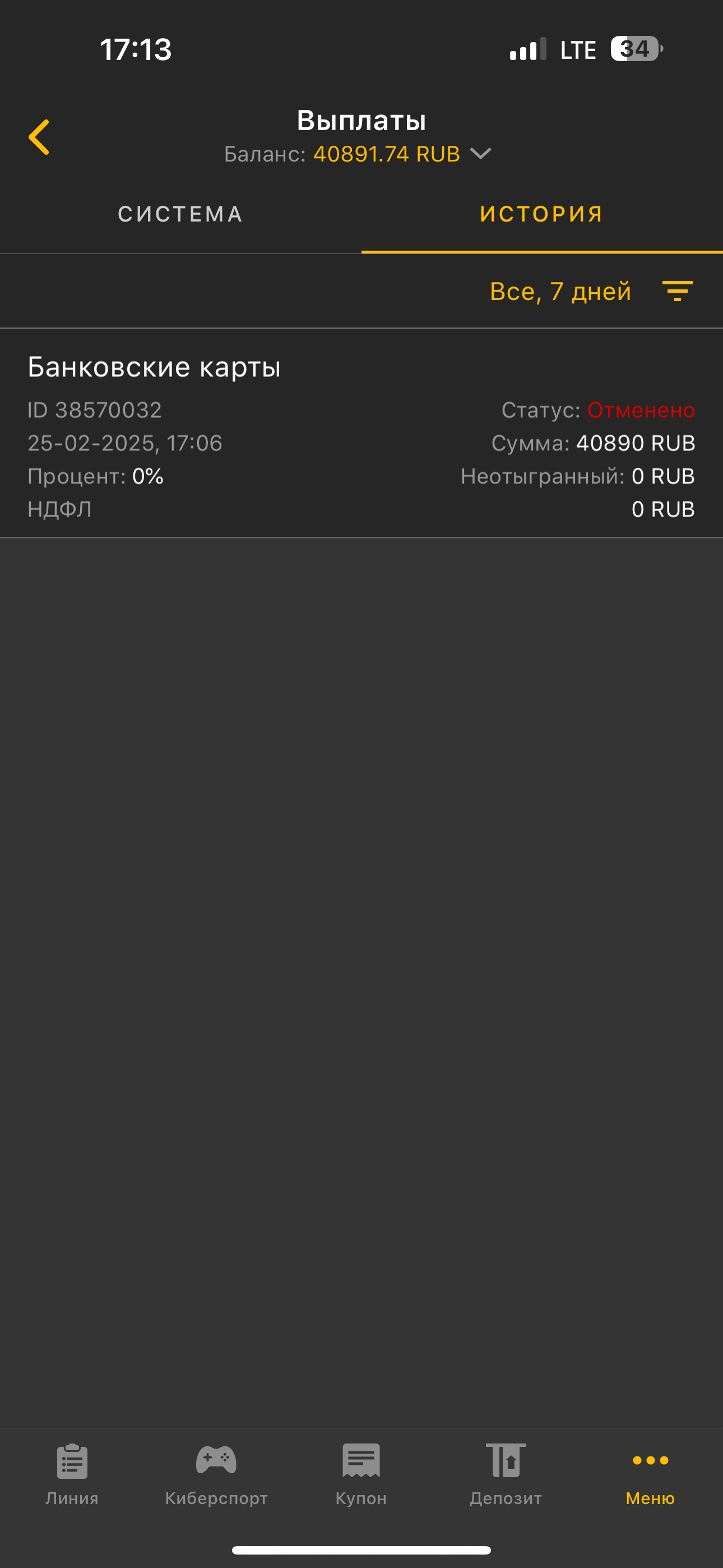 Здравствуйте, я столкнулась с проблемой !!! Ставка сыграла , ставила на киберспорт . На кабинете зависли 40 тыс , вывести не дают , с отговорками что какая техническая неполадка , и когда это все разъяснится они понятия не имеют . Помогите пожалуйста разобраться 🙏🏻