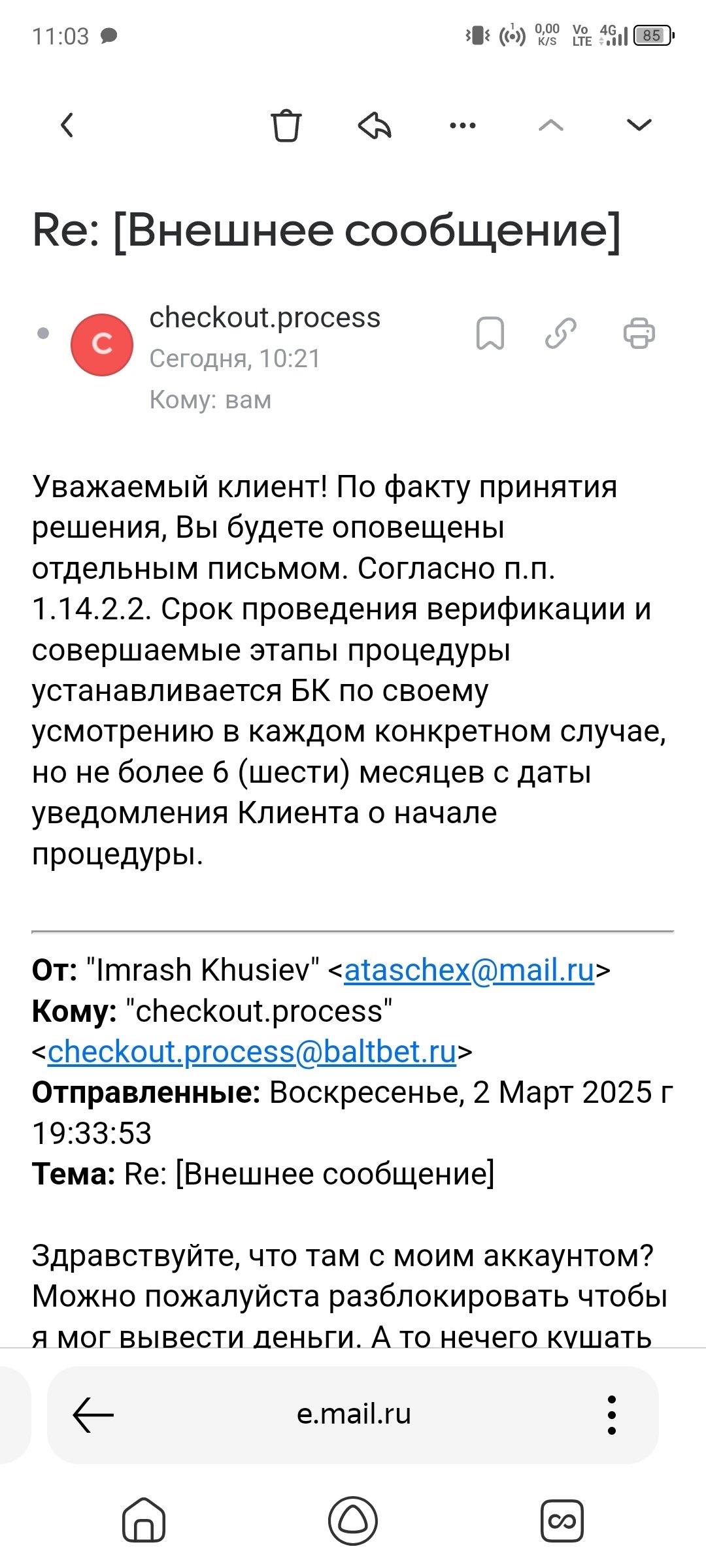 Здравствуйте, 16 февраля заблокировали аккаунт, после успешной ставки , на балансе 16800р , до этого проигрывал, выигрывал играл по мелочи, суммы 1000-3000 . написал в поддержку, назначили верификацию 18 февраля, на все вопросы ответил , скинул выписку с цупис, сказали ждите до полугода! Помогите пожалуйста вывести деньги!
