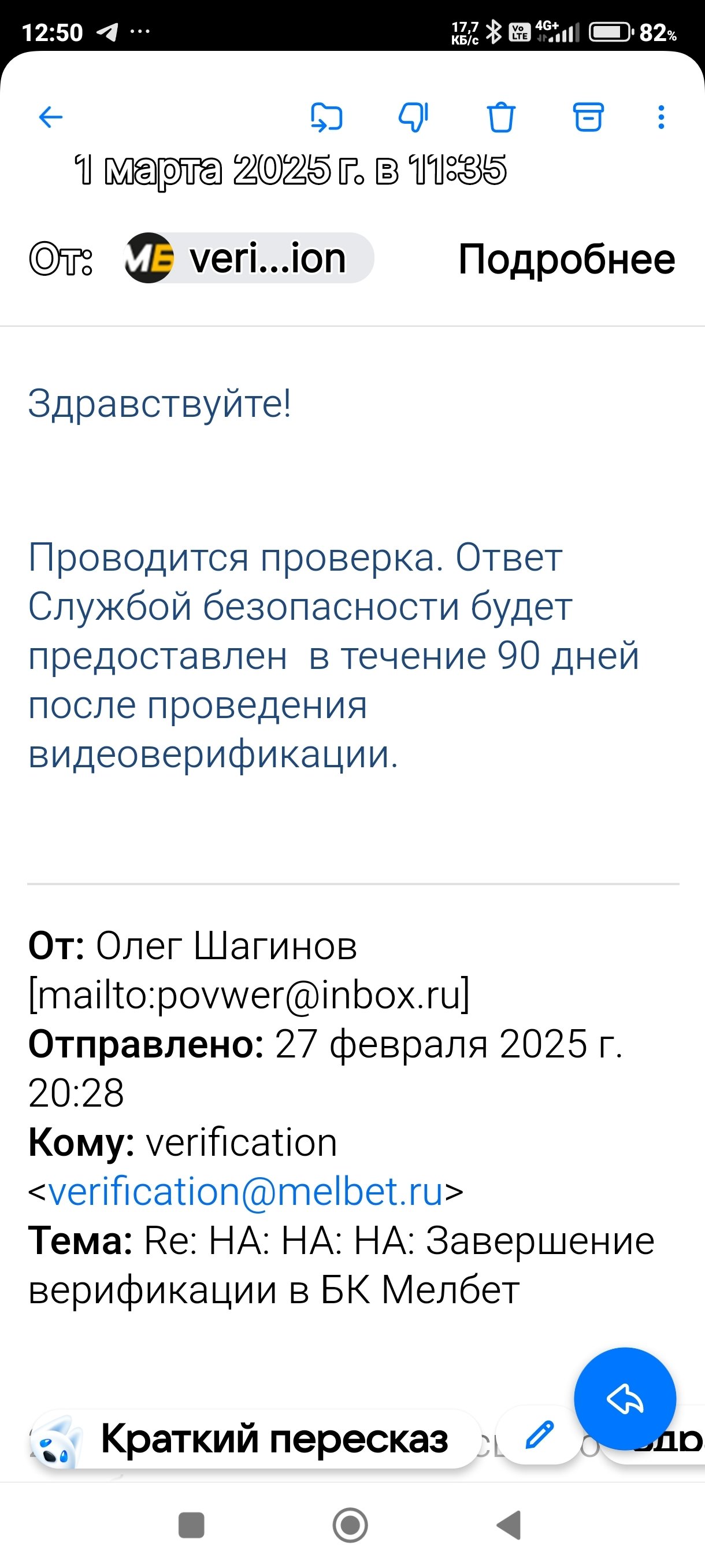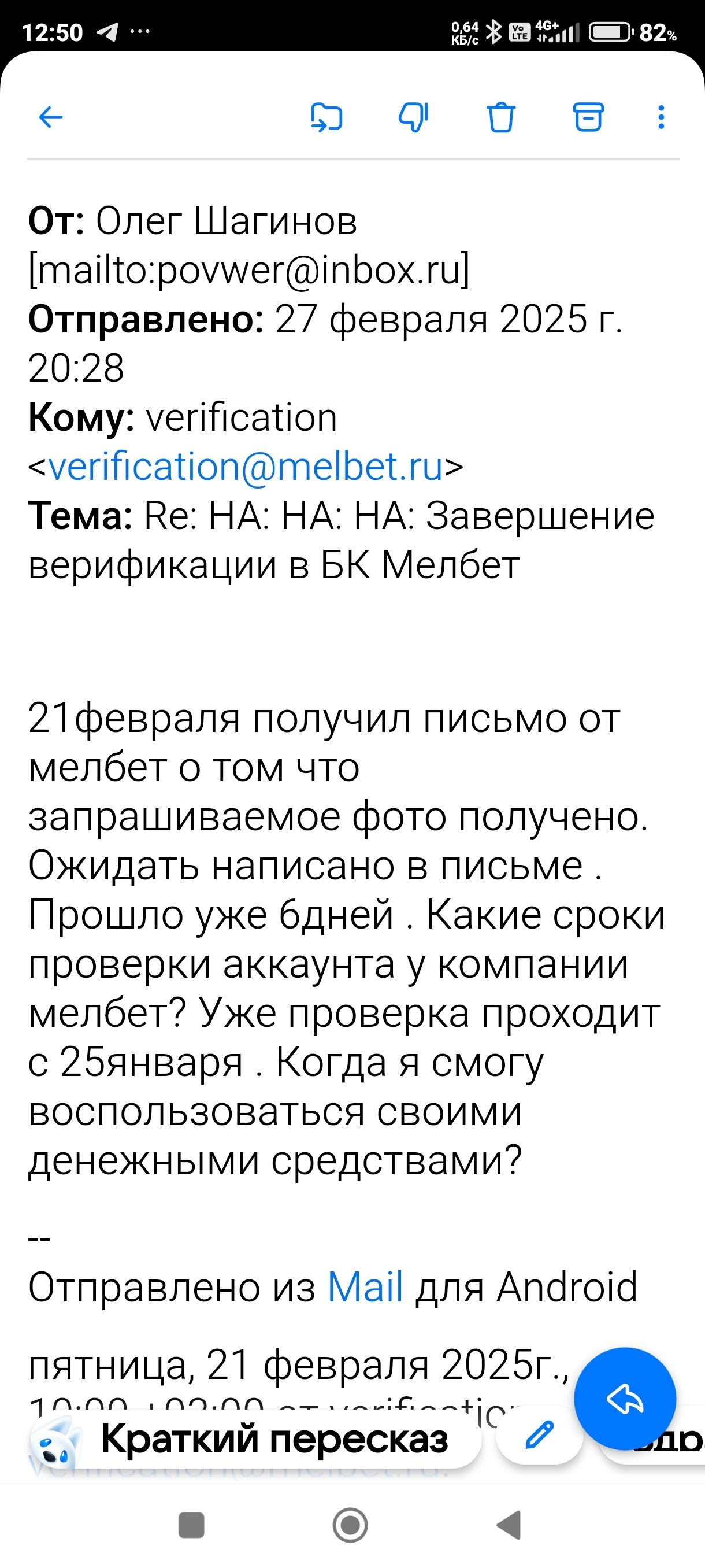 С 25декабря по 25января делал ставки на мелбет. Посмотрел статистику вроде по нулям получается . Но 25января аккаунт заблокировали на верефикацию. Верефикация у мелбет это вообще нечто. Что только на запрашивали . И полную выписку с цуписа . И выписку с личной карты за период. Ещё только в трусы осталось мохнатую руку службы дебелизации мелбет засунуть. В общем 20 февраля видеоверефикация состоялась. Вопросы опять на личные темы. Почему задевают личное я так и не понял. Потом пришло письмо что резко надо в течении 2часов прислать им фото селфи с написанной на листе надписью . Что это за дурни придумывают. Где комитет при Госдуме и администрации президента? Куда смотрят . Это же на лицо иноагентура.собирают данные которые им и не положено знать. В общем 21 февраля написали что проверка будет проведена в течении 90дней. Какая проверка ? Чего проверяют? Не отвечают .Сумма 18000р. Если кто соберётся писать коллективное письмо в контролирующие органы то я с вами. 89966713134 Олег.