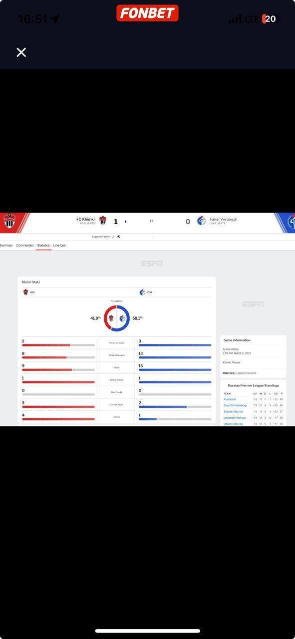 БК Фонбет неверно рассчитала ставку на сейвы в матче ФК Химки - Факел. Я ставил: Инд. тотал сейвов ФК Химки меньше 3.5. Фонбет рассчитал ставку, как 4-1. При этом согласно результатам на сайте БК Фонбет, Факел нанёс за матч 3 удара в створ. Я понимаю, что БК Фонбет не любит исправлять ошибки по статистическим данным, но здесь ошибка очевидна по их же результатам. При трёх ударах не может быть четыре сейва, здесь явное противоречие. Поддержка пересчитывать ставку отказывается, даёт в ответ скриншот, на котором опять же 3 удара Факела и 4 сейва Химок. Хотелось бы, как минимум, получить логическое объяснение: как такое возможно, откуда мог взяться четвёртый сейв?