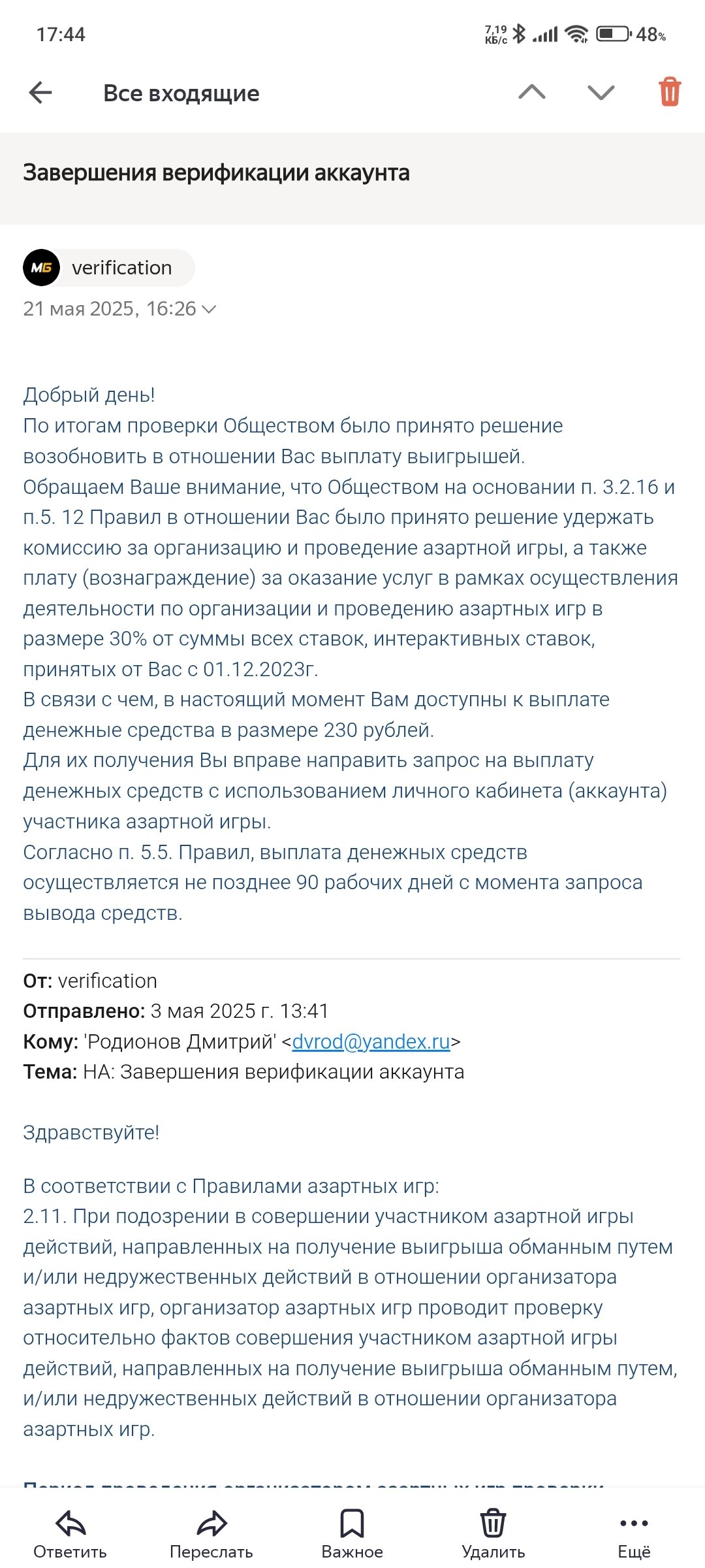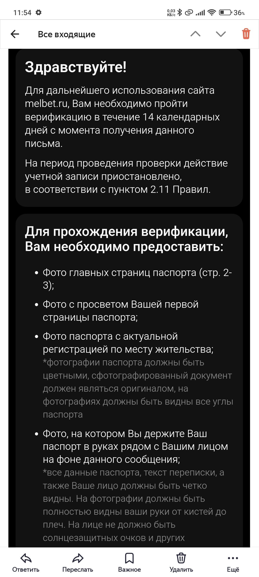 Вчера прошёл видеверификацию, заодно викторину по спортивной и букмекерской тематике. Что такое угловой, офсайд, тотал, индивидуальный тотал. Бредятину какую то спрашивают. Минут десять меня мурыжили. Думал, всё, конец эпопеи. А вот нет! Через час на почту сообщение, что в течении двухчасо селфи им подавай. Ладно хоть не уснул и глянул почту.