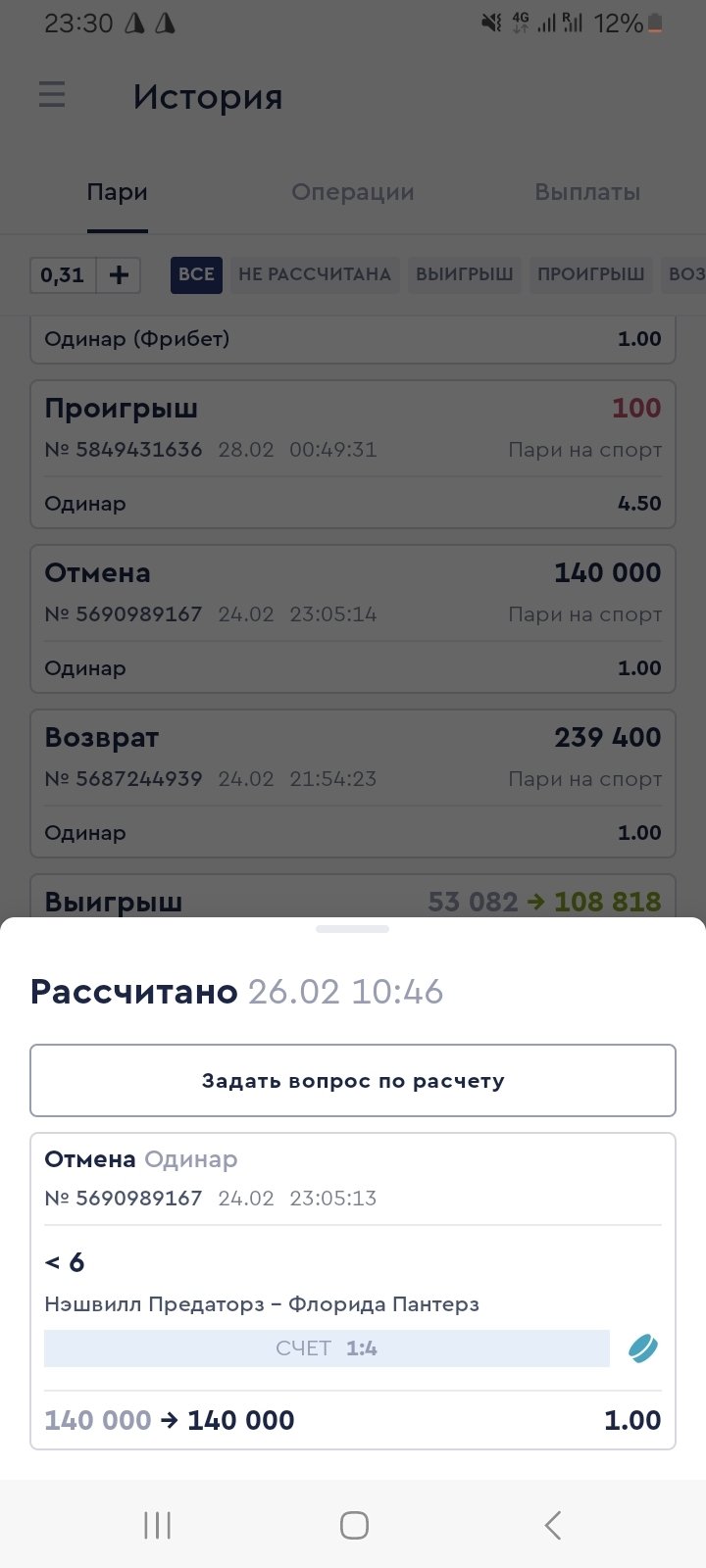 Здравствуйте. 24 февраля ставил 140 тысяч рублей на НХЛ, Нэшвилл - Флорида. Тотал меньше 6. По итогу забили 5 голов в основное время, но ставка рассчитана была с коэффициентом 1. Прошу рассчитать правильно, по нормальному коэффициенту, который был актуален в тот момент.