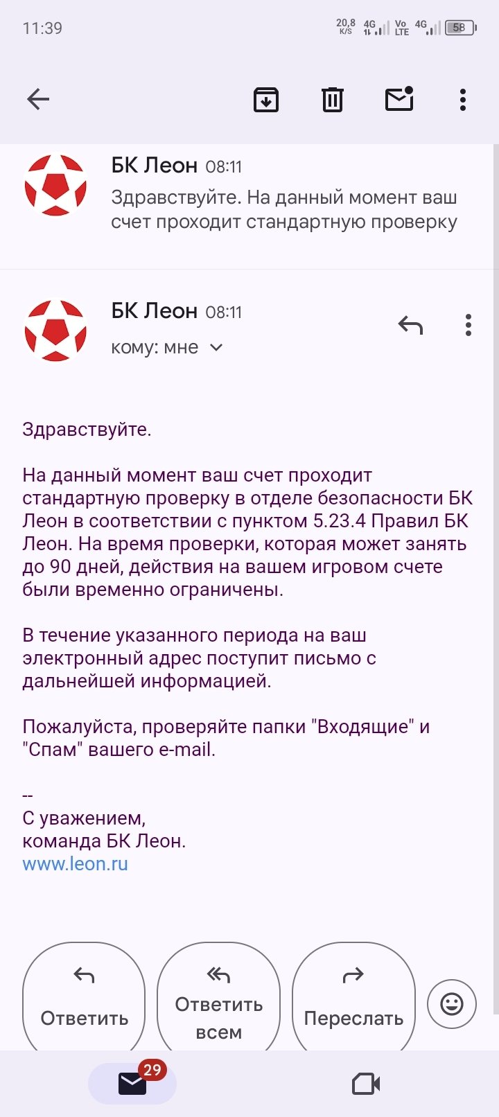 Повелась на акцию, страховка ставки 100 %. Внесла депозит 20000 р и сделала ставку на НБА в первой четверти на тотал. По итогу выиграла. Средства вывести не дали сразу, попросили пройти верификацию. Я сфотографировала паспорт, показала лицо в рамке. Потом удалось вывести. Вывела 19 тысяч с выигрыша, а 20 оставила, думала дождаться еще одной игры. Но не тут то было. Приходи уведомление на почту, мол, сфотографируй карту. Я сделала фото, предоставила. Далее пришло на почту уведомление, что мне назначили стандартную проверку СБ, и буду проверять счет до 90 дней. ПОЛТОРА МЕСЯЦА. Да ни один нормальный человек столько не будет ждать, пусть с процентами тогда возвращают, раз пользуются моими деньгами. КРАЙНЕ не рекомендую связываться с этой конторой