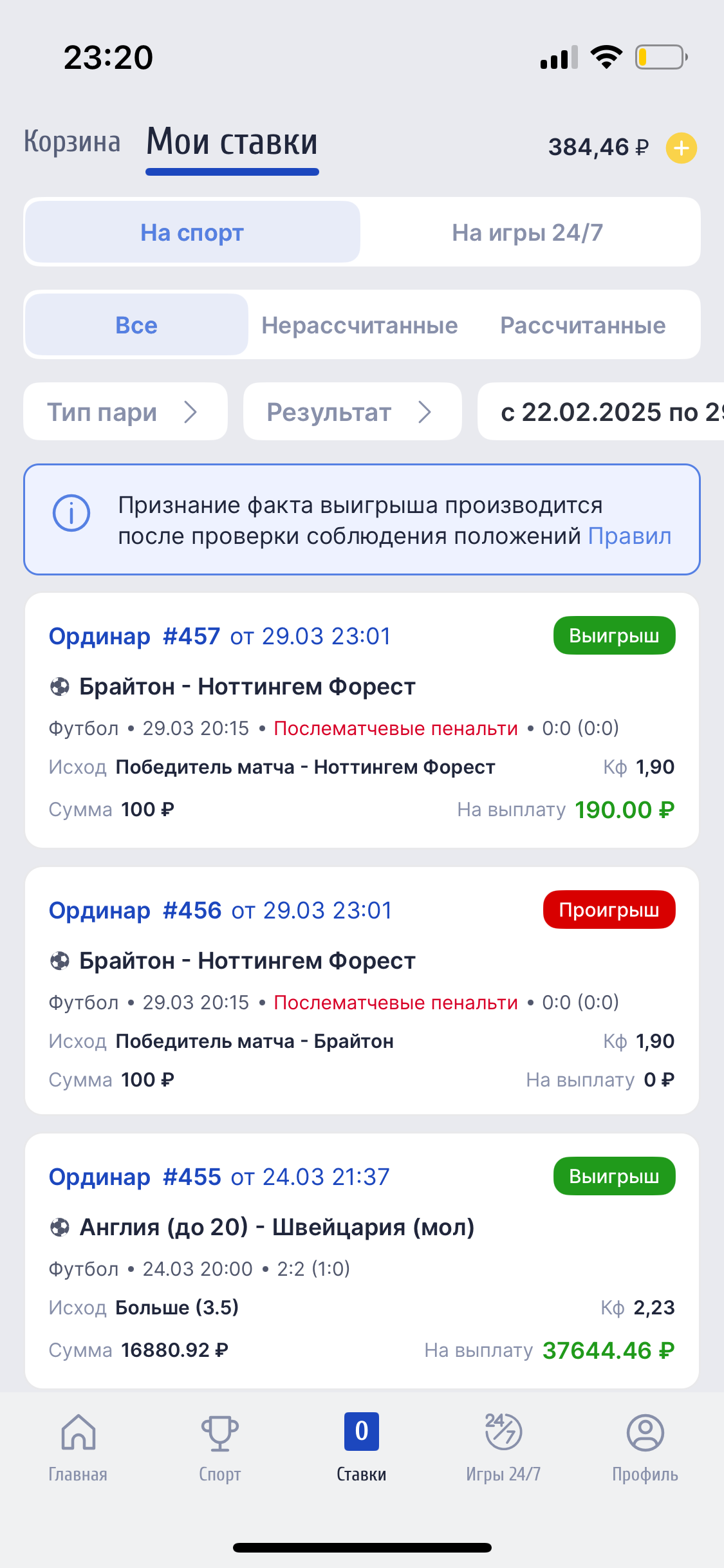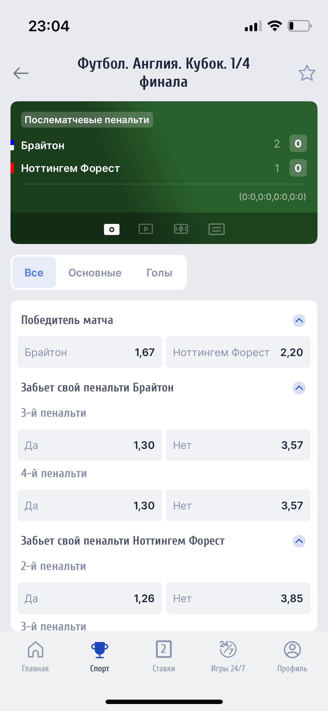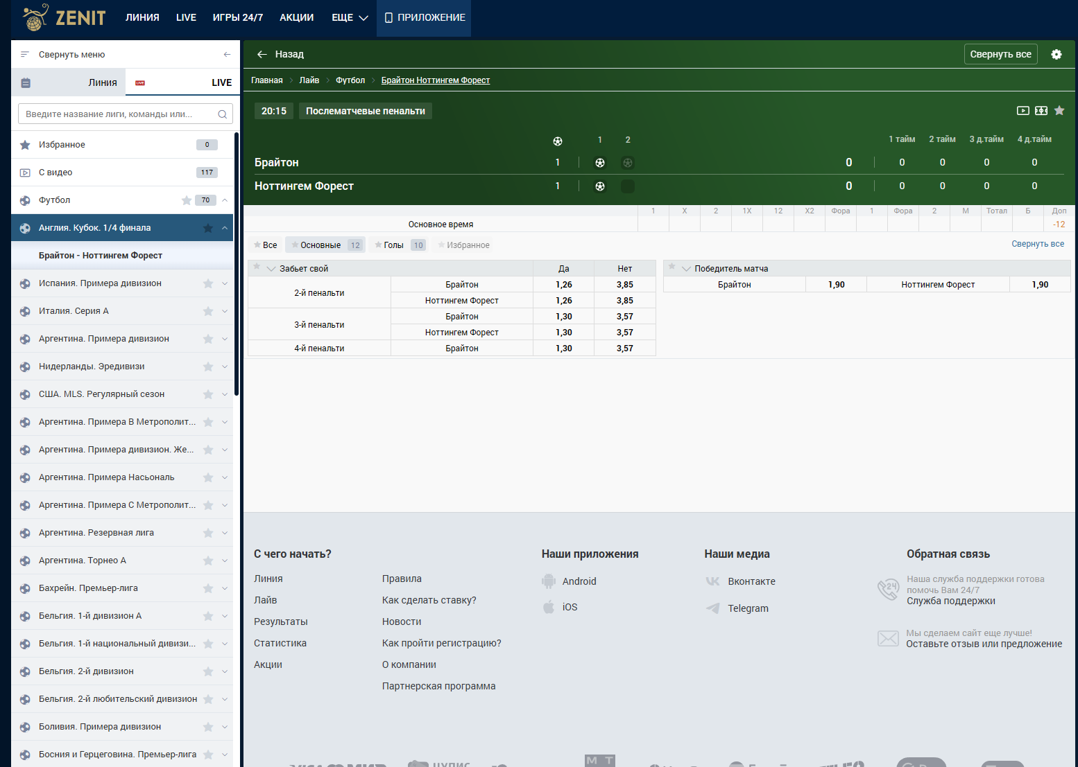 Ставки были сделаны в букмекерской конторе ZenitWin (Зенит) Мною была сделана ставка Ординар #446 от в 01:34 по МСК. Ставка была сделана на исход: Победитель матча — Реал Мадрид. Кф Я смотрел этот матч, как и все миллион людей на планете и видел, что дополнительное время закончилась в 01:33. Дальше началась тренерами и игроками выбор бьющих, их очередность и жеребьевка кто начнет бить первым. Сам первый пенальти был пробит 01:37:09 по МСК. Первый пенальти пробил игрок Реал Мадрид Мбаппе. То есть делаем вывод, что моя ставка была сделана до начала серии пенальти и принята за коэффициент действительный и правильный. Так же мною была сделана ставка Ординар #447 от в 01:39 по МСК. Ставка была сделана на исход: Победитель матча — Реал Мадрид. Кф .Это ставка была сделана после третьего общего пробитого пенальти или второго пенальти команда Реал Мадрид. 01:39:09 к мячу шел игрок Альварес и ударил Альварес только в 01:39:29, то есть ставка была сделана на коэффициент действительный и правильный. Фото моментов обоих пенальти прикрепил. Время по Гринвичу, то есть различие от МСК в три часа.