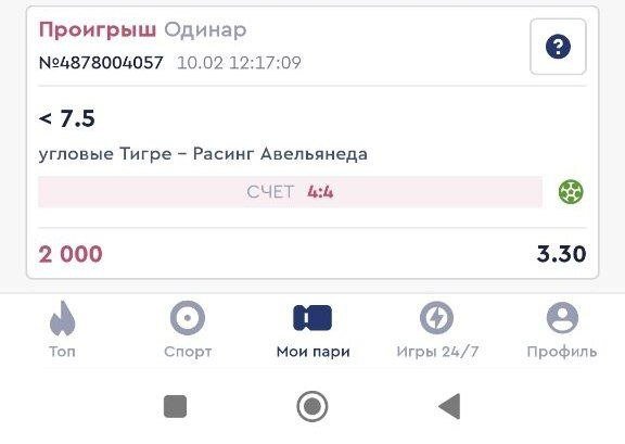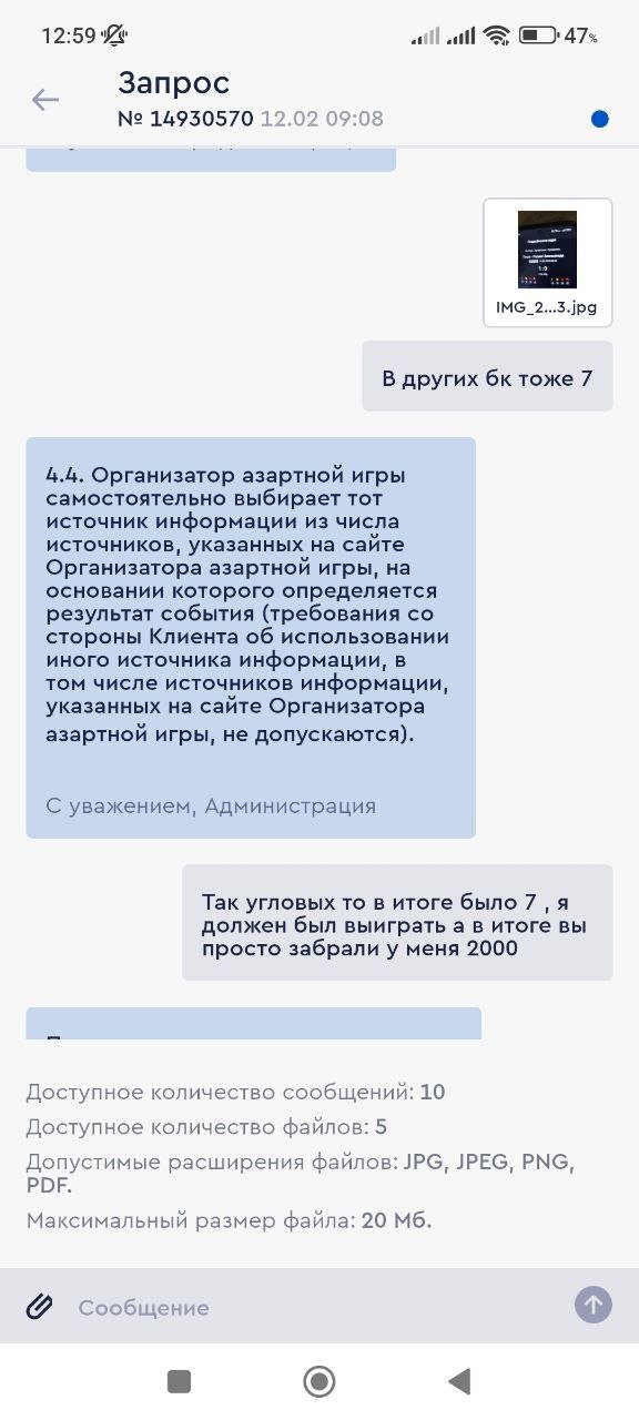 Здравствуйте , я не знаю куда обратиться и пожаловаться, букмекерская контора ФОНБЕТ расчитала выигрышную ставку как проигрышь и Я потерял 2000 , плюс выигрыш 4600. Помогите пожалуйста если это возможно.Я сделал ставку на матч Тигре-Расинг Авельянеда, который проходил , на то что в матче будет подано меньше 7.5 угловых за кеф 3.3 , букмекерская контора Фонбет расчитала ставку как проиграшь, якобы в матче было 8 угловых, хотя на всех статистических сайтах а так же, в других конторах включая БК Леон видно 7 угловых, 3: 4 соответственно. Фонбет ссылается на какой то свой левый источник где указано что угловых было 4:4 , тоесть 8 , рассчитали ставку как проигрышь . Хотя после матча и на том ресурсе на который они ссылаются был исправлен результат на 3:4 (7 угловых ). помогите пожалуйста восстановить справедливость и забрать свои 2000+ 4600 выиграша, все скрины со статистикой и переписки со службой поддержки прилагаю ! Помогите пожалуйста вернуть деньги. И подскажите пожалуйста куда ещё можно обратиться за помощью . ВСЕ СКРИНШОТЫ ПРЕКРЕПИТЬ НЕ СМОГ МОЖНО БЫЛО ТОЛЬКО 3, НАПИШИТЕ МНЕ ПОЖАЛУЙСТА ПРЕДОСТАВЛЮ ВСЕ СКРИНЫ