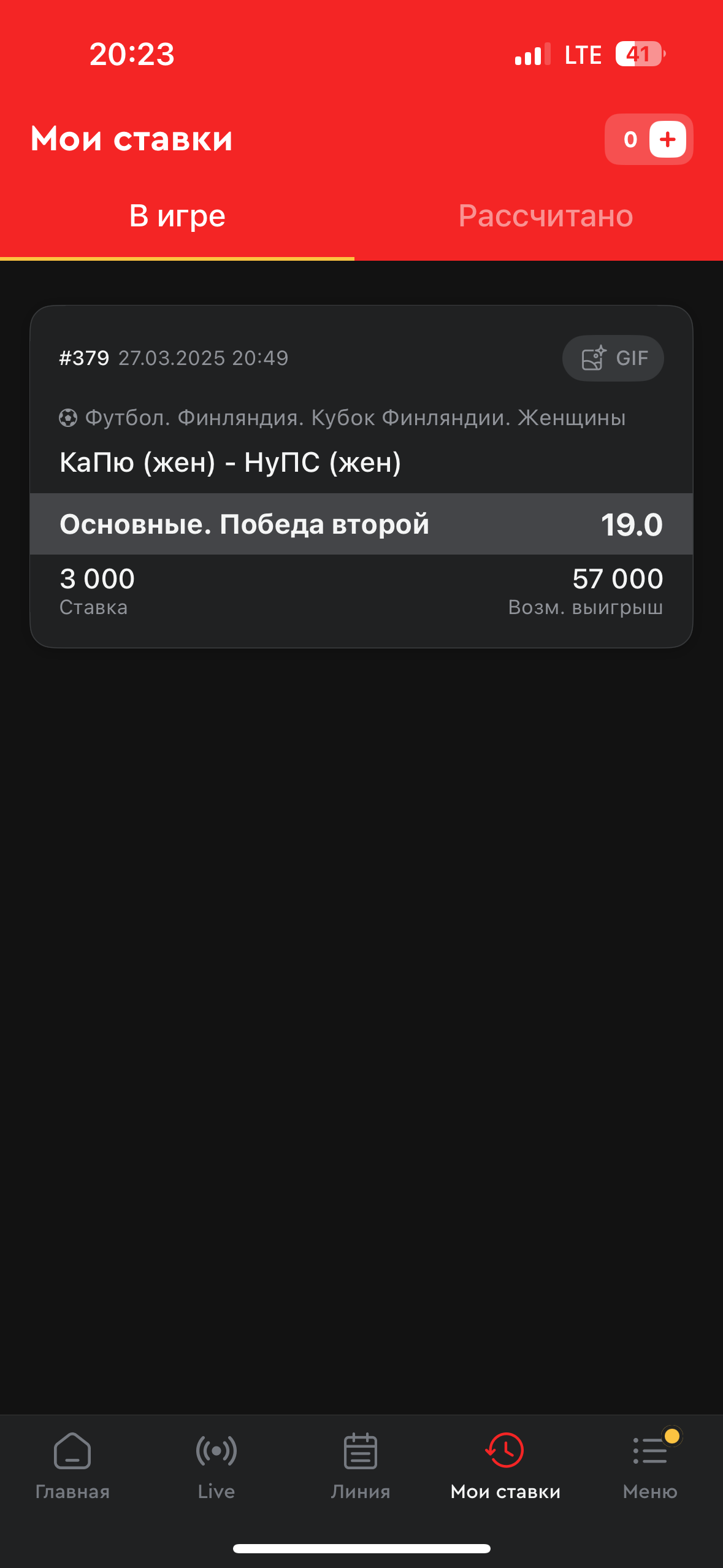 Здравствуйте! Прошу Вас поспособствовать в расчете ставки, сделанной на победу команды NuPS W в матче KaPy W vs NuPS W (финский женский кубок), который состоялся в 20:10 по МСК. Ставка была оформлена в конце первого тайма в 20:49 по МСК, когда счёт был в пользу команды KaPy W, и именно в этот момент события на поле и статистика матча были сильно в пользу принимающей стороны, что подтверждает добросовестность размещения ставки. Матч завершился со счётом 1:2 в пользу NuPS W. Итоговый результат подтверждается официальным источником: 👉 Также обращаю внимание, что OlimpBet оставляет за собой право рассчитывать ставки в течение 72 часов (п. правил проведения азартных игр), но при этом есть вероятность, что ставка будет рассчитана как возврат или каким-либо иным способом, что мы считаем неприемлемым и несправедливым. Ставка была принята корректно, с учётом всей доступной информации на момент размещения, и результат матча подтверждает выигрыш. Прошу Вас как можно скорее взять жалобу по данному тикету в работу и поспособствовать в расчете. С уважением, ID игрока: 80486673
