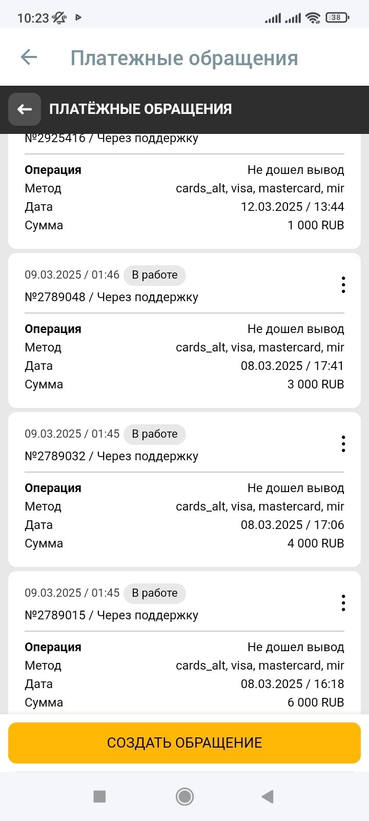 было создано 4 запроса на вывод..в результате не дошло из всех частями 9000 рублей..было сразу создано 4 платежных обращения и до сих пор деньги не пришли на карту и не вернули на игровой счет!!!!! Поддержка отвечает шаблонами!!! Ровно 3 недели никто ничего не делает!!!! Помогите решить этот вопрос!!!!