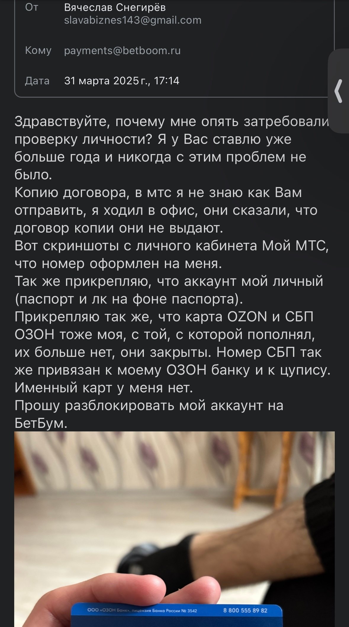 Здравствуйте, на протяжении долгого времени ставил на BETBOOM, никаких проблем с выводом не было, проверок тоже не было. Но последнюю заявку на вывод отклоняют, из за того , что я выиграл 402 тысячи. После заявка на вывод, начались проверки, все фото паспорта я скинул, кружок тоже сделал лица, опять затребовали какие то проверки, уже номер договора нужен что я являюсь владельцем номера, но в мтс не дают его. Скинул все скрины что я владелец и лк на мне. Все документы и тд. Что им не нравится не знаю. Карт у меня именных нет, всегда пользовался без проблем картой цупис или сбп , а тут им фото карты нужно. Короче бред какой то. На Цупис не выводят. Одни проверки… Сколько уже можно? Прошу разобраться с данным вопросом и вывести мои деньги.